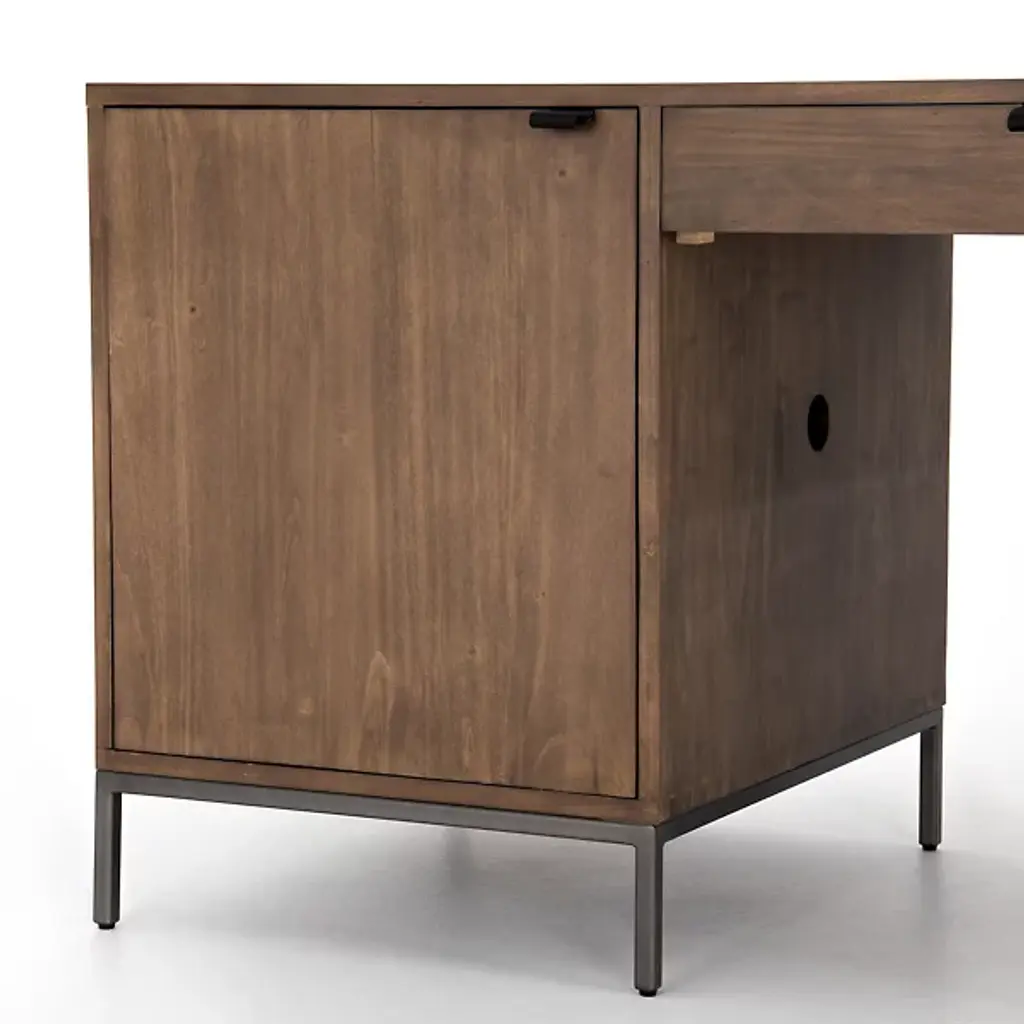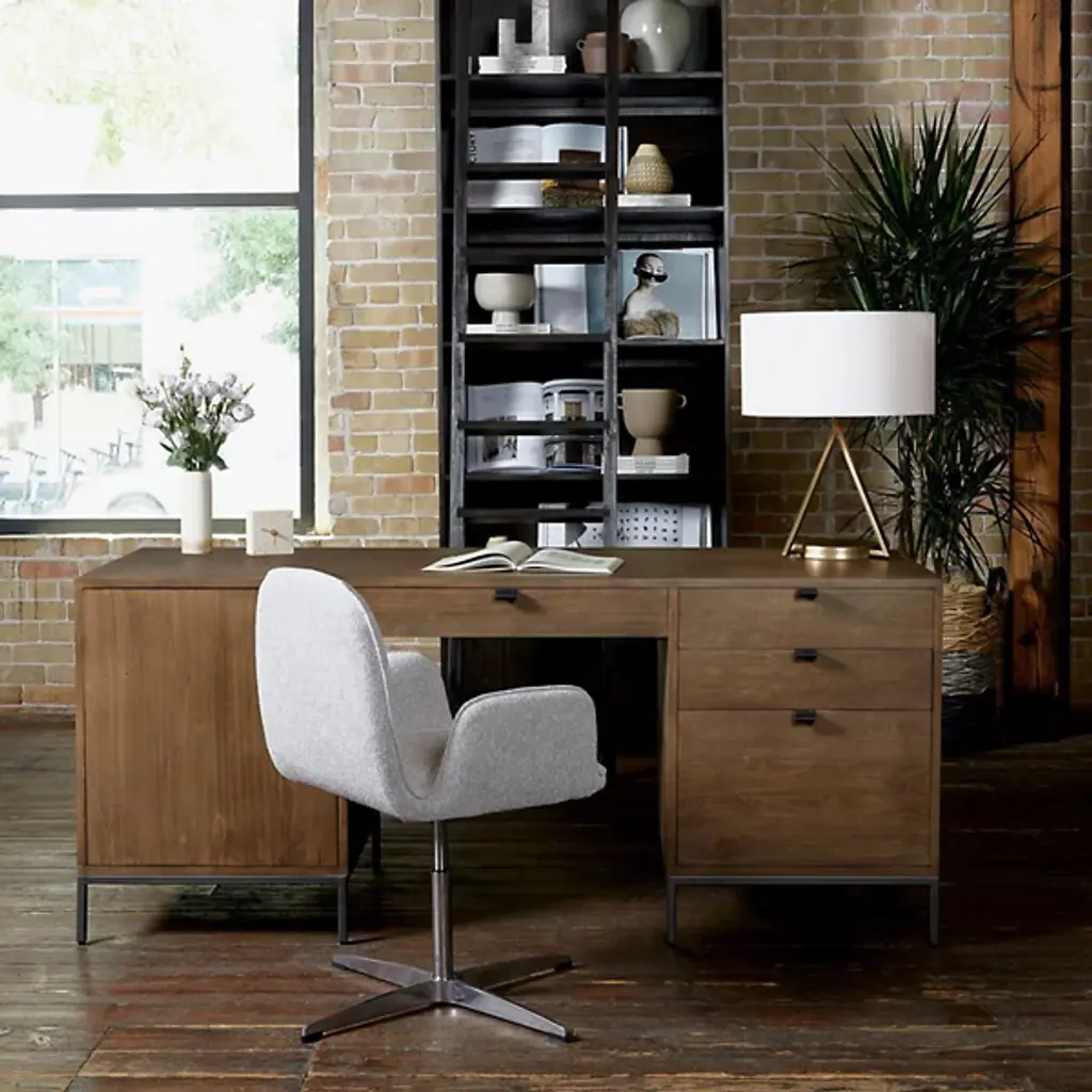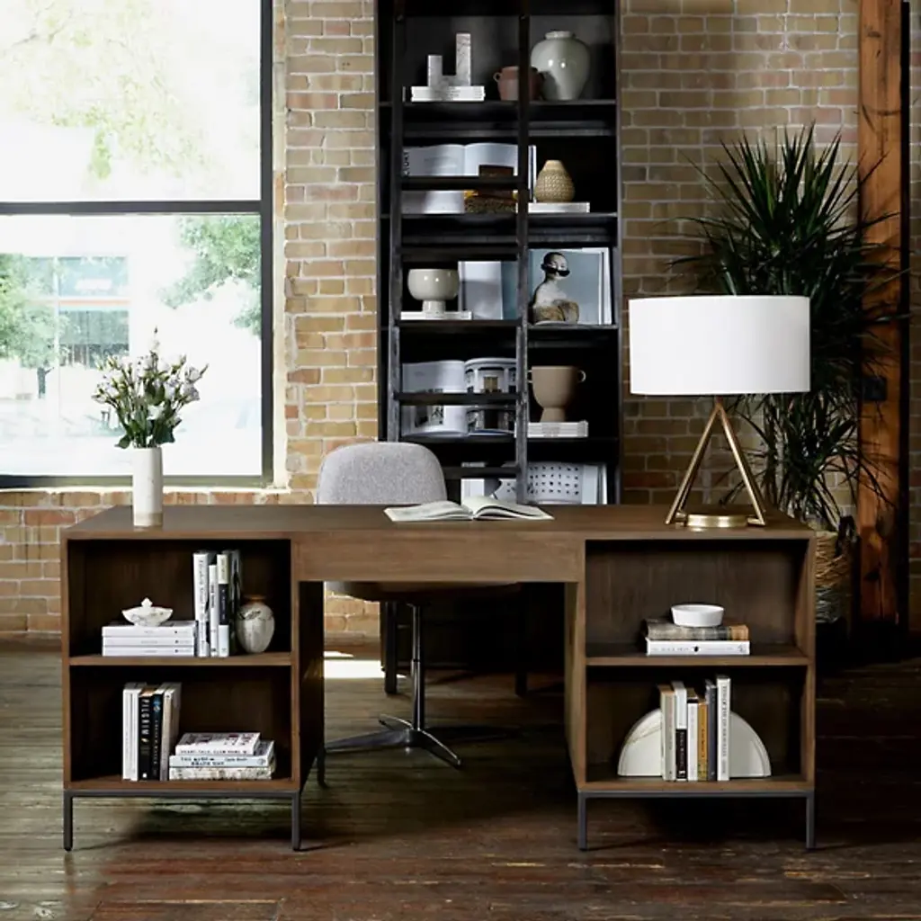 Drawing from mid-century influences, the Trey Executive Desk from Four Hands combines solid poplar construction with practical design. Its bracket-shaped profile houses multiple drawers, resting atop an iron offering ample storage, while top-grain leather pulls and metal accents add a touch of sophistication. The open silhouette offers plenty of space, with room for file storage, cutouts for cord management, and anti-tip hardware for the drawers, offering safety and functionality.