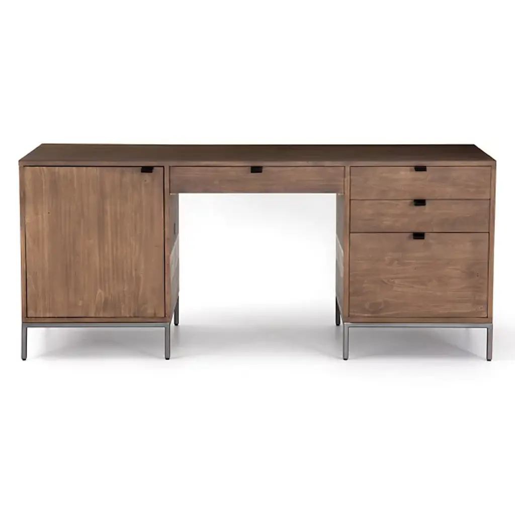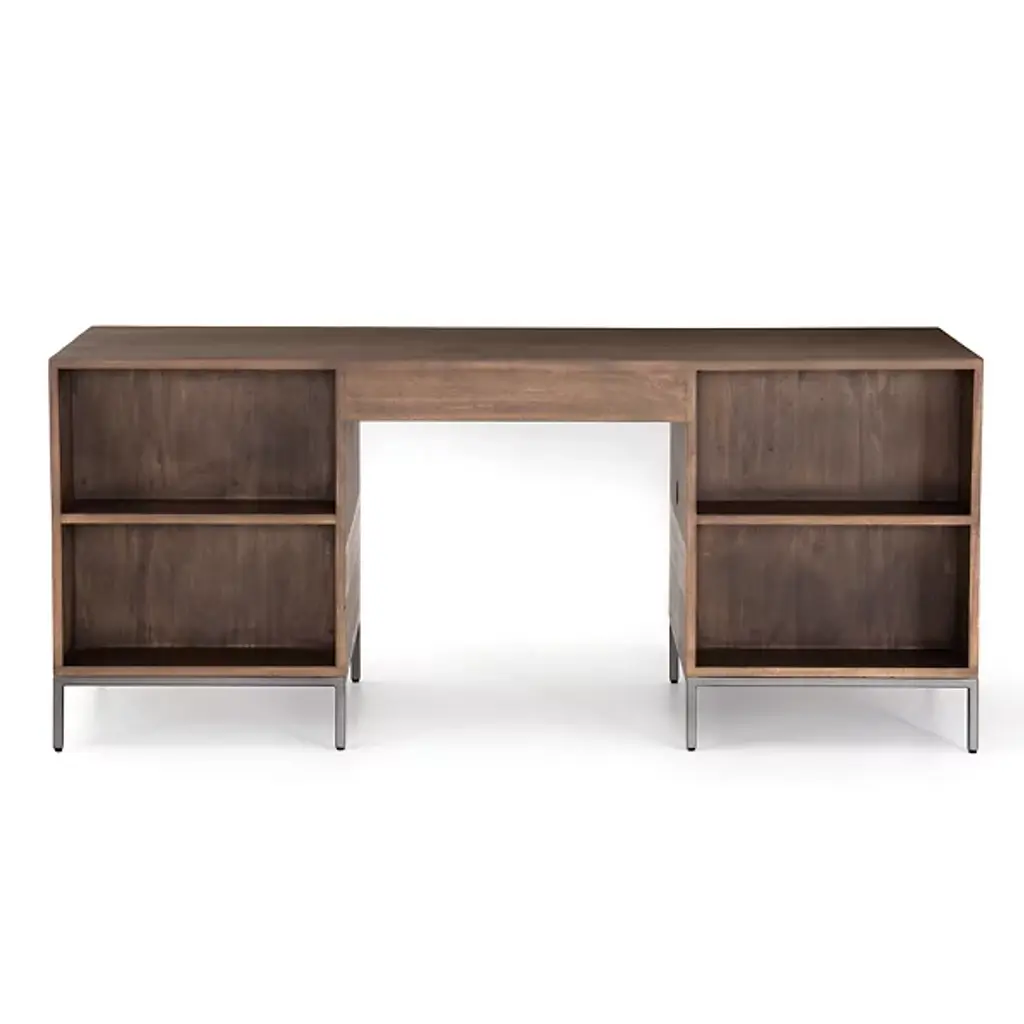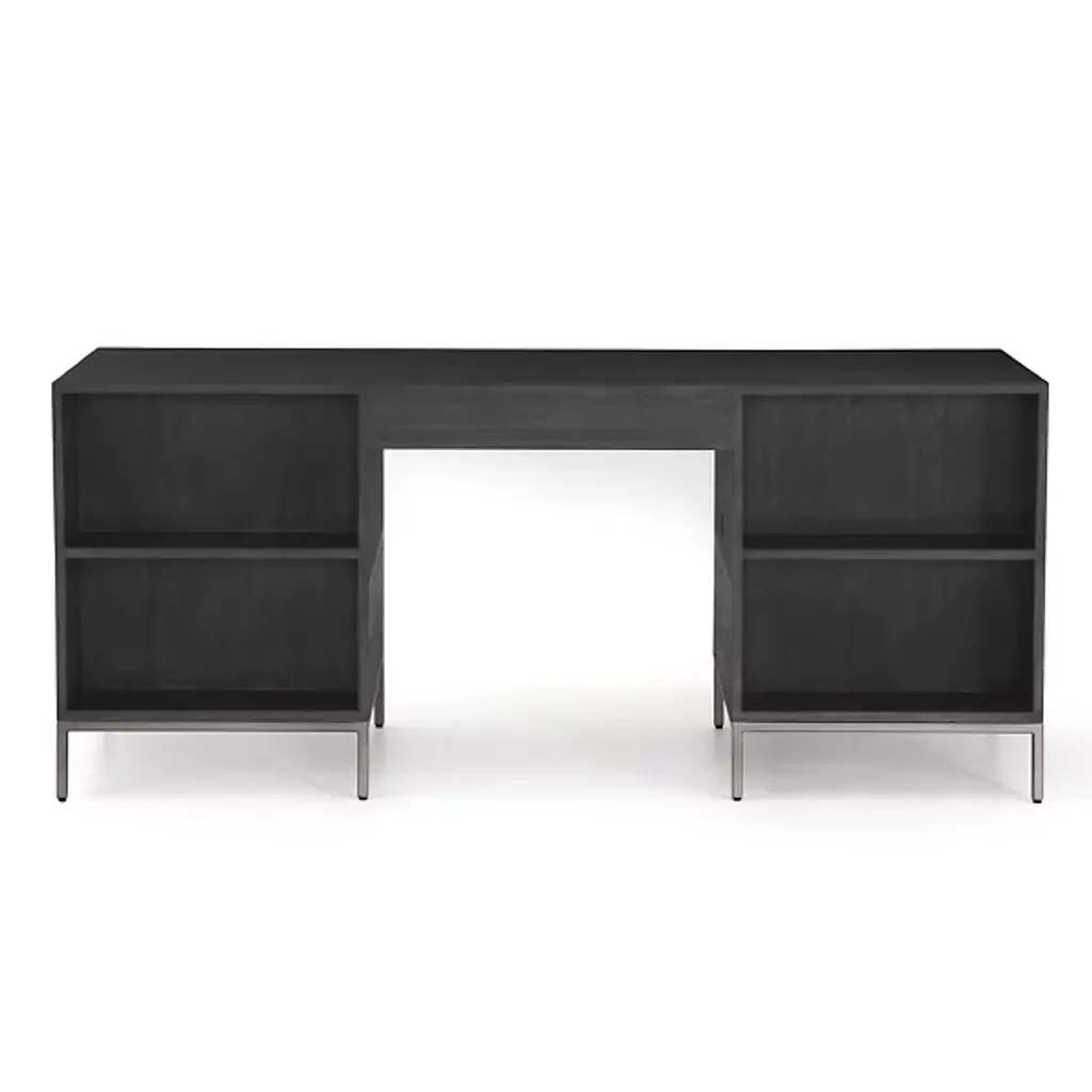 Drawing from mid-century influences, the Trey Executive Desk from Four Hands combines solid poplar construction with practical design. Its bracket-shaped profile houses multiple drawers, resting atop an iron offering ample storage, while top-grain leather pulls and metal accents add a touch of sophistication. The open silhouette offers plenty of space, with room for file storage, cutouts for cord management, and anti-tip hardware for the drawers, offering safety and functionality.