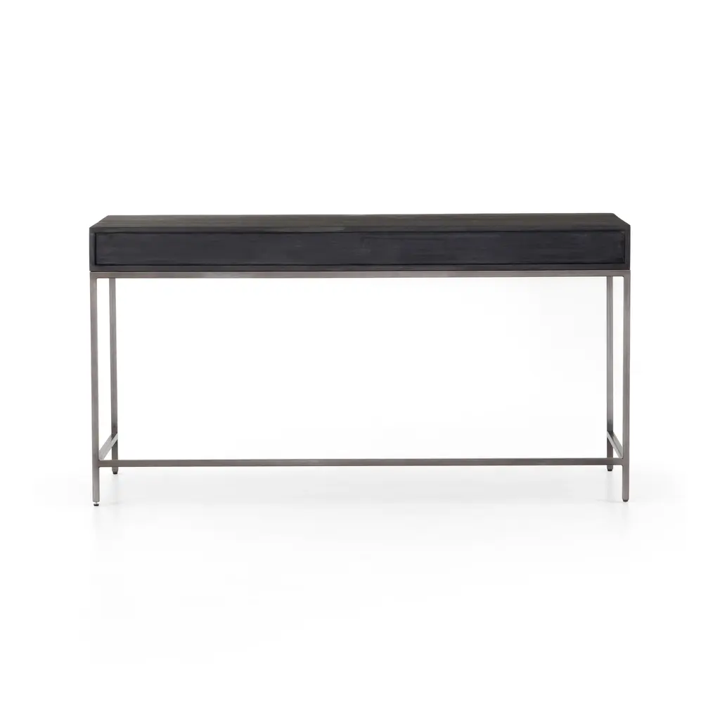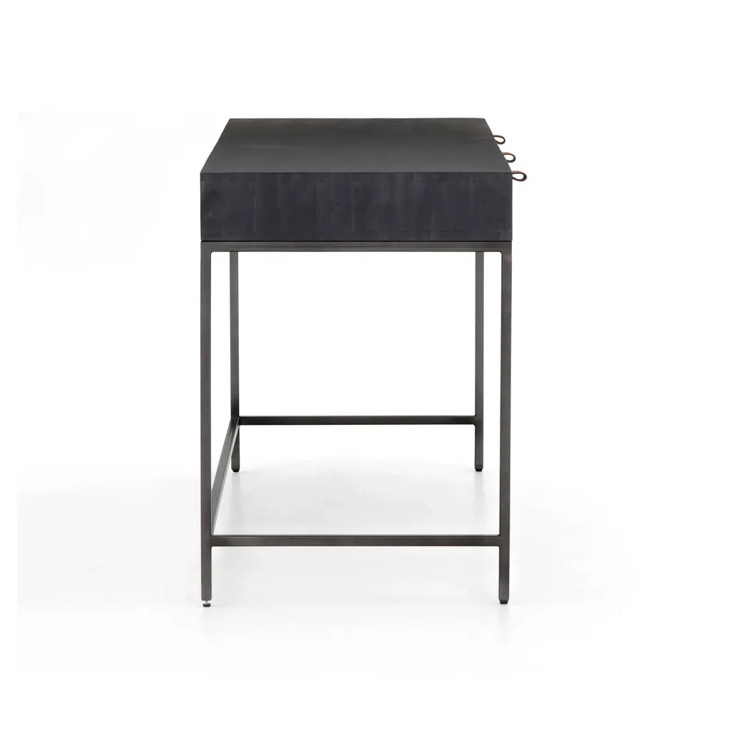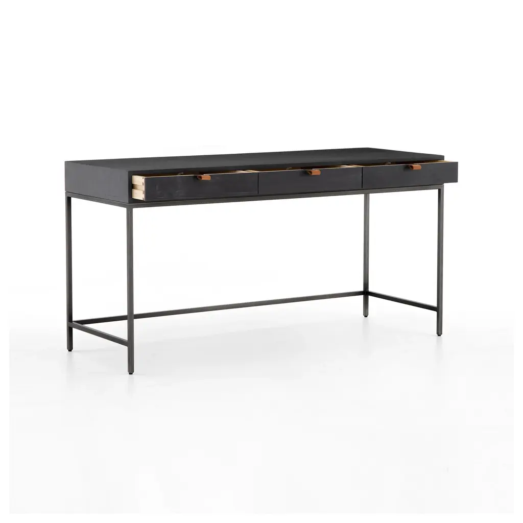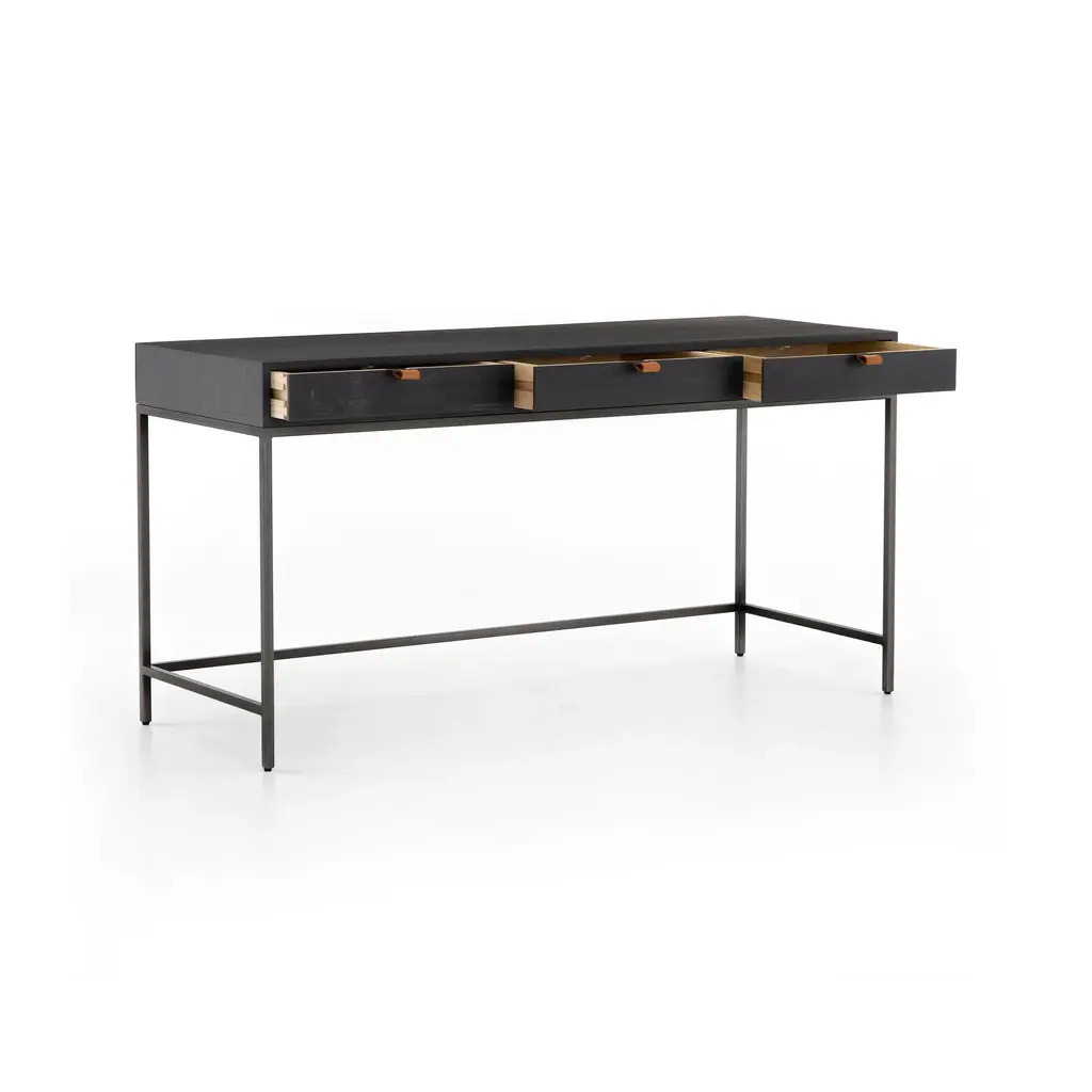 The Trey Modular Writing Desk from Four Hands is a luxuriously crafted workspace inspired by mid-century design. Constructed from black-finished poplar, it features three spacious drawers and a fully finished back, plus metal-secured leather pulls for a unique touch. Perfect for any home office or corporate setting, let its clean lines and sophisticated silhouette create a productive and stylish work space. Highlights
