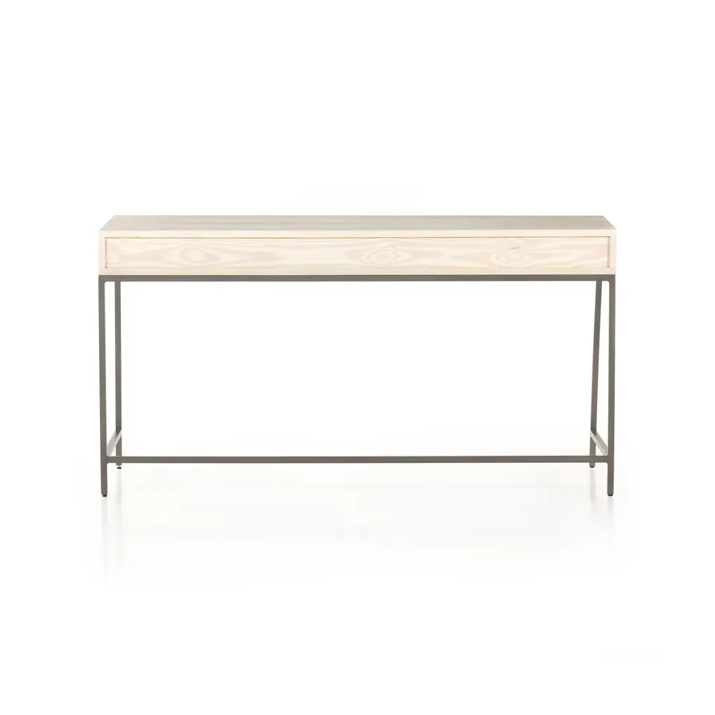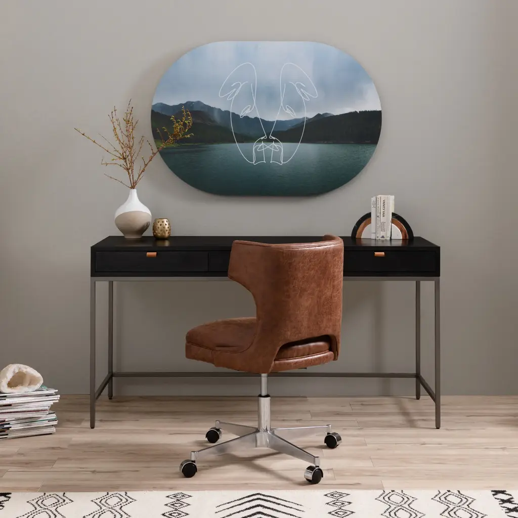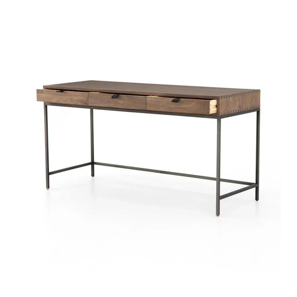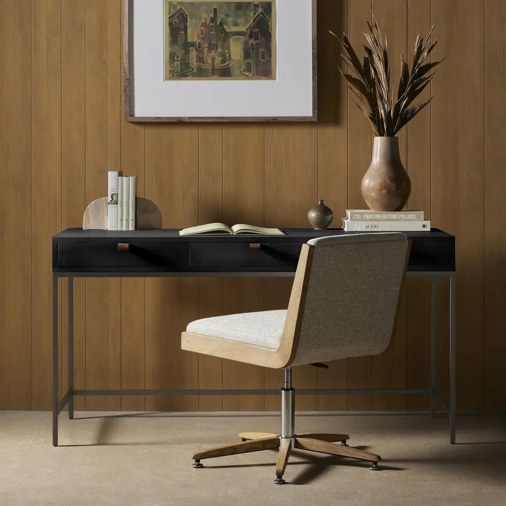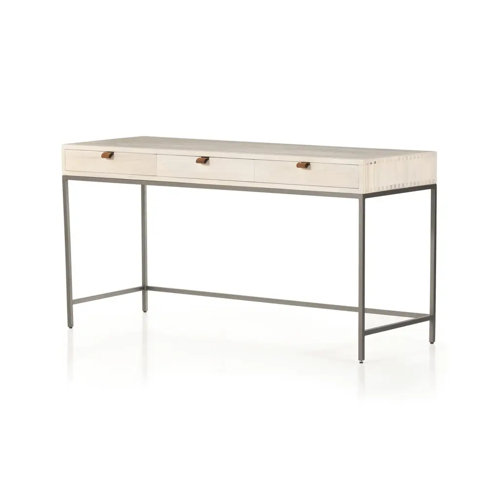 The Trey Modular Writing Desk from Four Hands is a luxuriously crafted workspace inspired by mid-century design. Constructed from black-finished poplar, it features three spacious drawers and a fully finished back, plus metal-secured leather pulls for a unique touch. Perfect for any home office or corporate setting, let its clean lines and sophisticated silhouette create a productive and stylish work space. Highlights