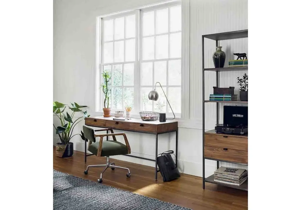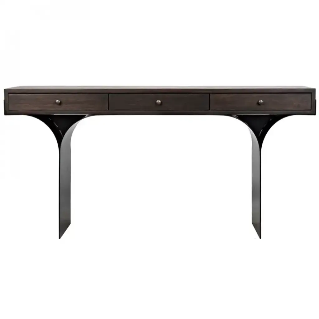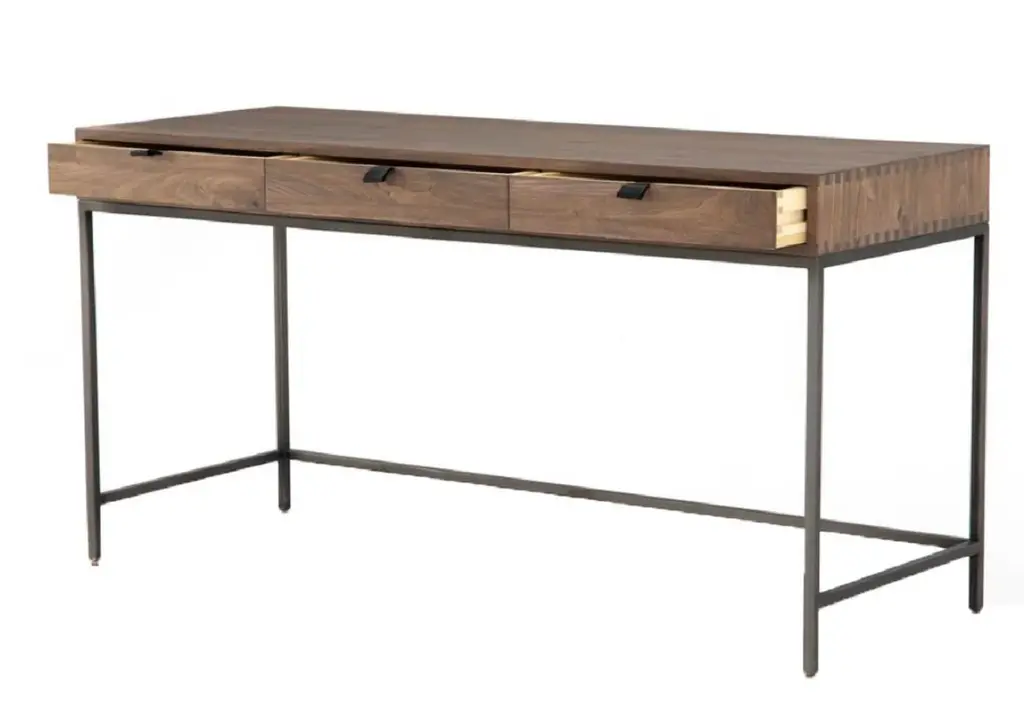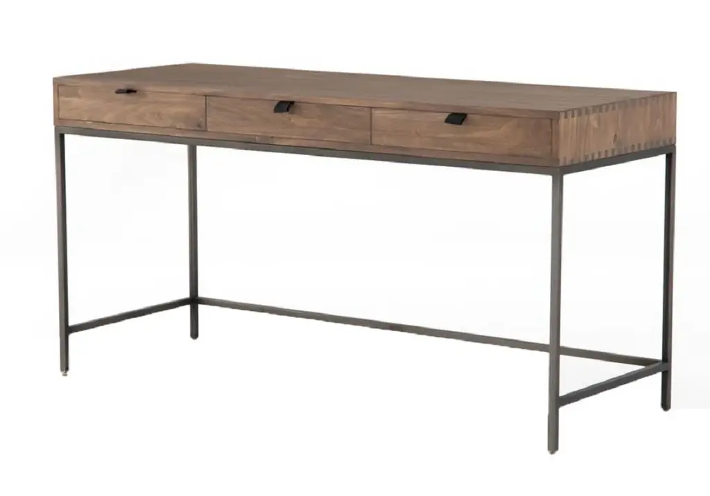 This desk showcases clean lines with its sleek iron frame. Crafted from solid poplar and finished in a natural grey auburn, its rectangular form is complemented by three drawers with matching leather pulls.