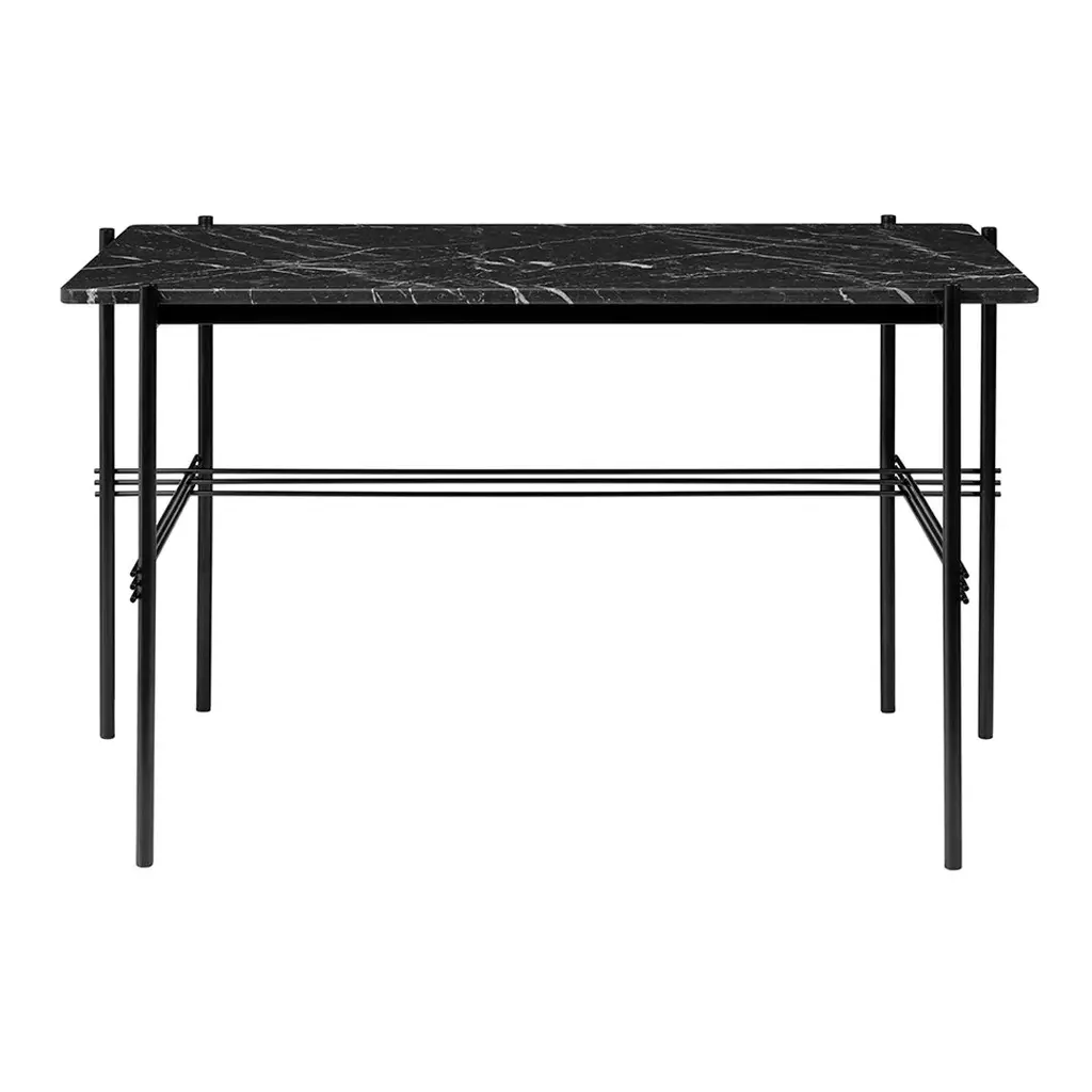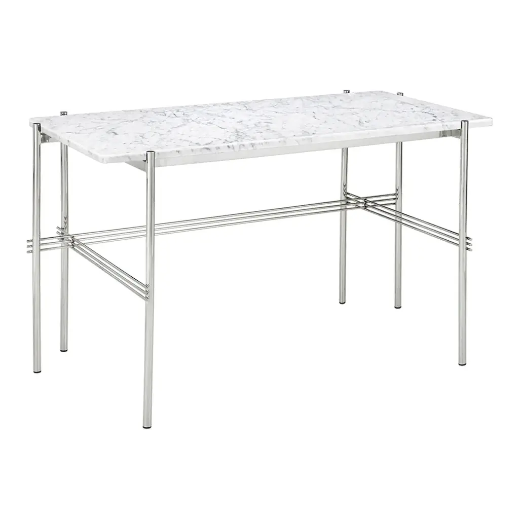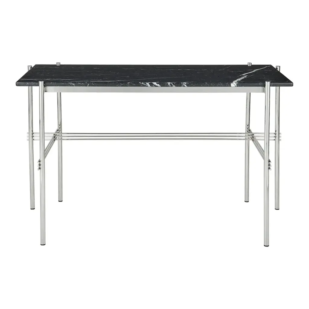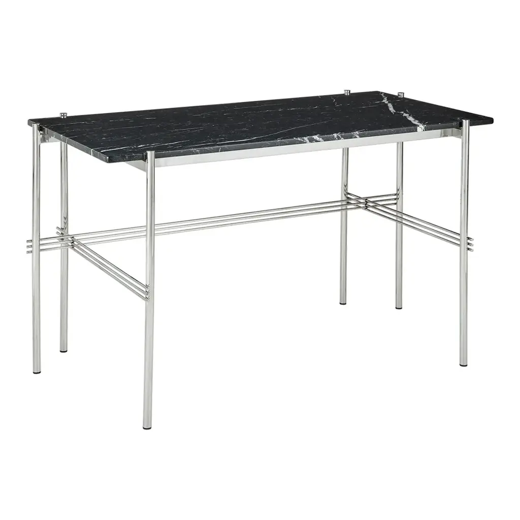 Playing with the contrast of a solid table top and the characteristic slender metal legs with a careful crossing detailing, the TS Desk is a modern and stylistically pure desk perfectly suited for an office space where the home-like feel is sought for. The TS Collection got its name as well as inspiration from the renowned restaurant The Standard in Copenhagen where the materials and design vision have strong references to the buildingâ€s architecture. The visual lightness in combination with honest materials and flawless craftsmanship, the TS Desk has an outstanding minimalistic design that would make a beautiful addition to any modern interior or office space. Available in glass or marble with black base.