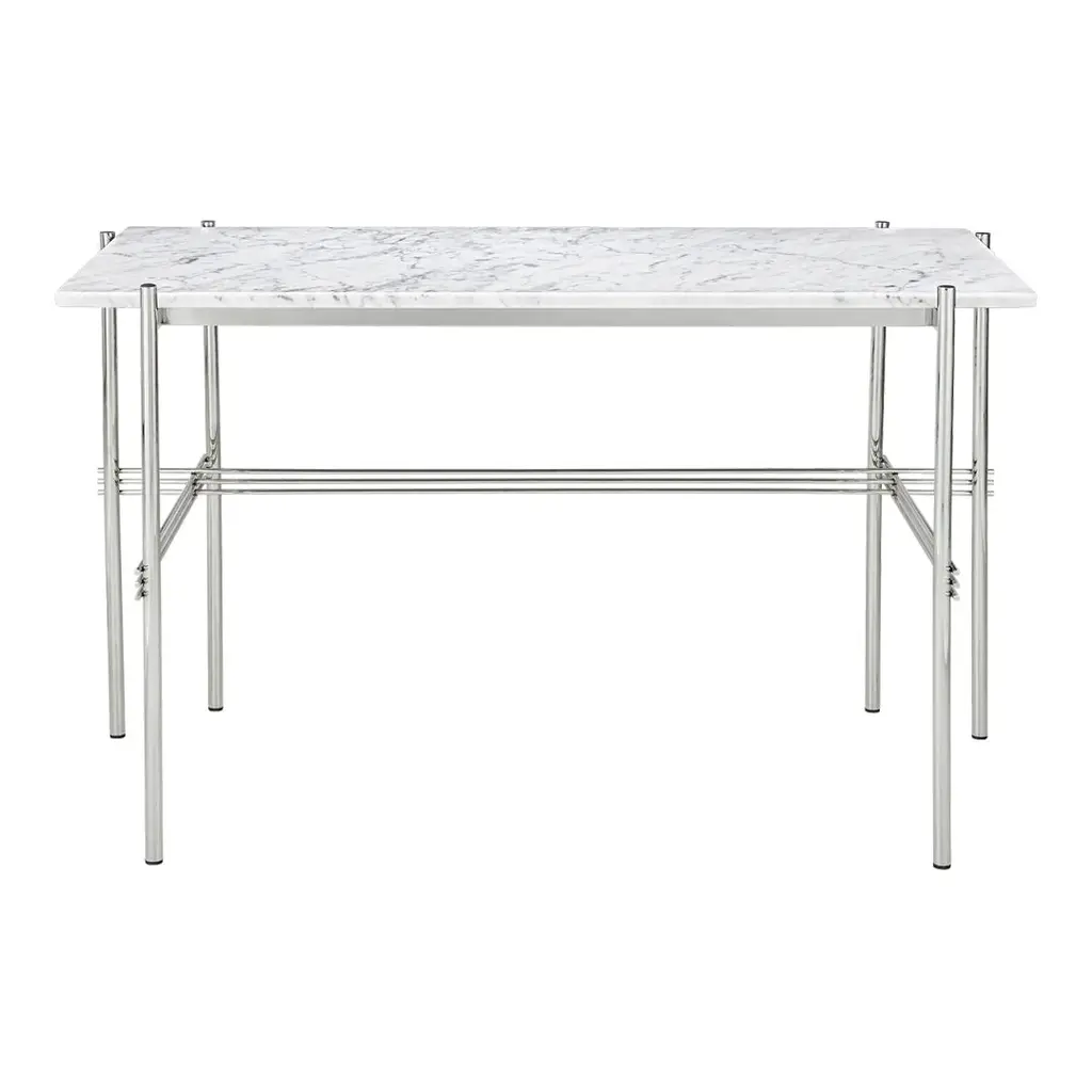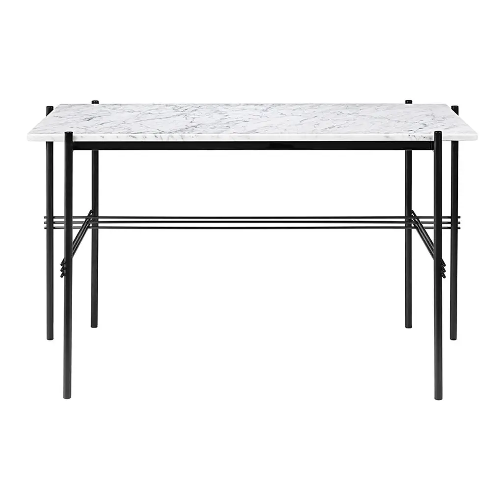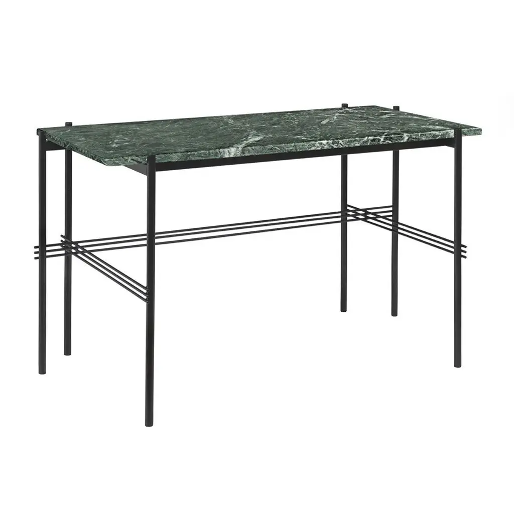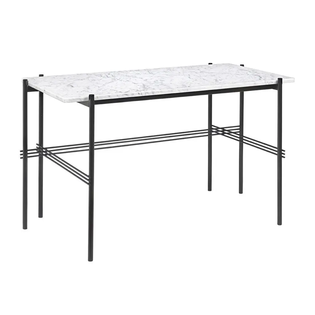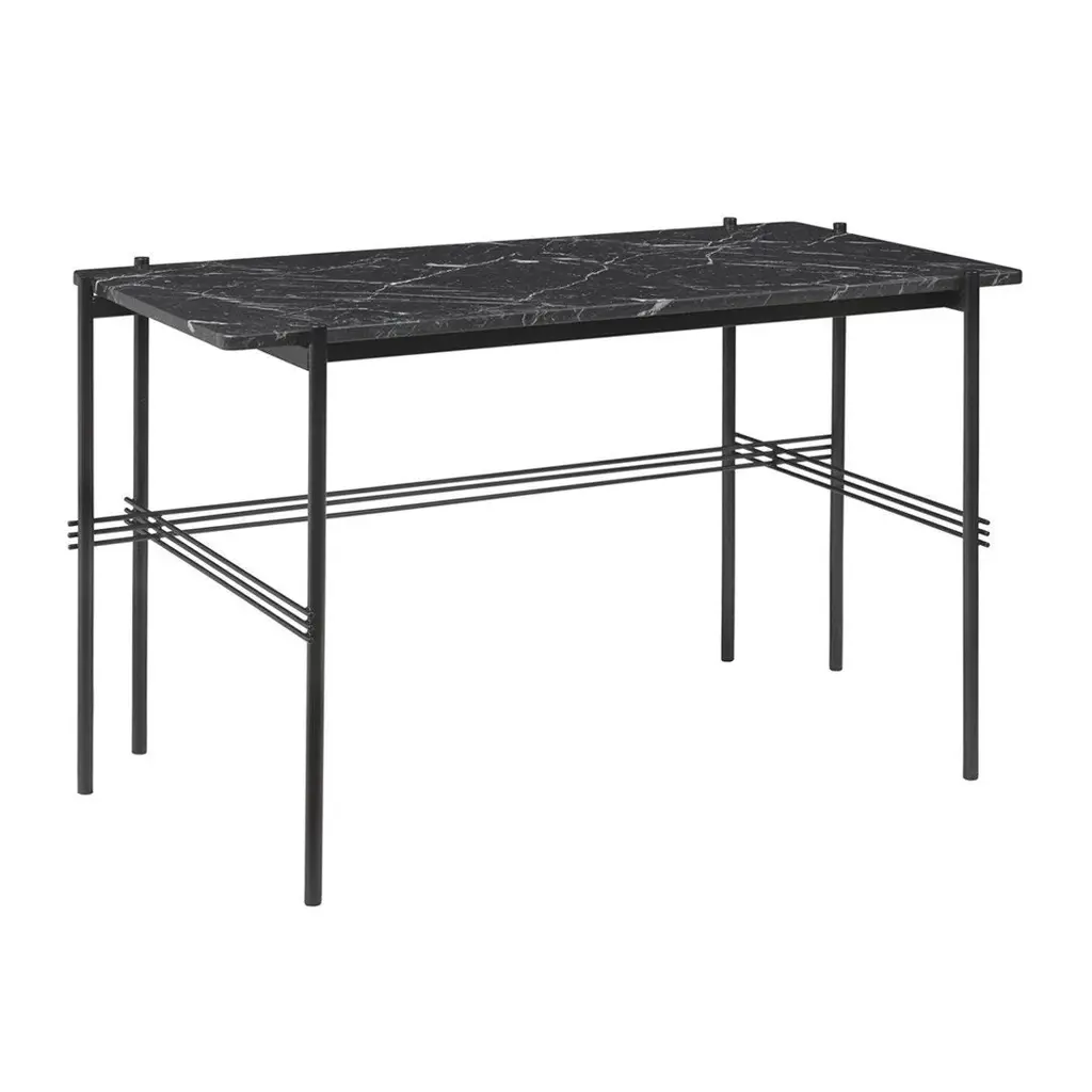 Playing with the contrast of a solid table top and the characteristic slender metal legs with a careful crossing detailing, the TS Desk is a modern and stylistically pure desk perfectly suited for an office space where the home-like feel is sought for. The TS Collection got its name as well as inspiration from the renowned restaurant The Standard in Copenhagen where the materials and design vision have strong references to the buildingâ€s architecture. The visual lightness in combination with honest materials and flawless craftsmanship, the TS Desk has an outstanding minimalistic design that would make a beautiful addition to any modern interior or office space. Available in glass or marble with black base.