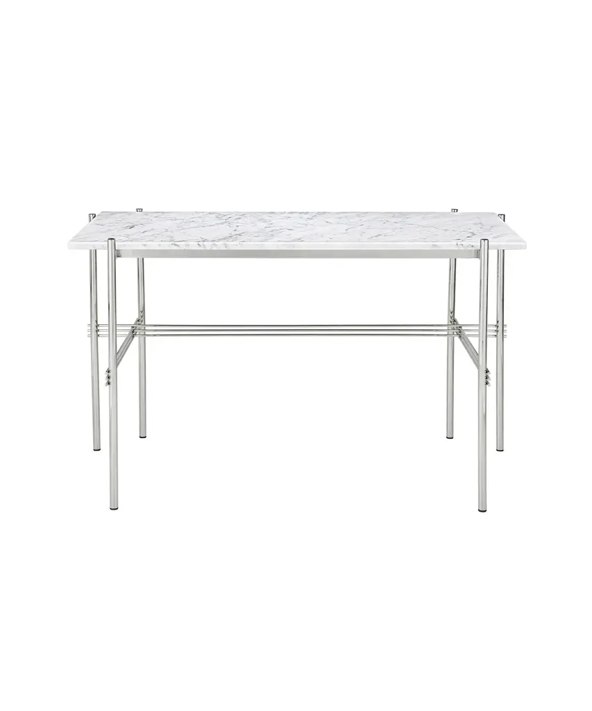 An elegant marble table that blends rich materiality with a graphic design. TS, short for The Standard, is inspired by an Art Deco building in Copenhagen of the same name. The table collection is the work of design duo GamFratesi, whose work blends Danish craftsmanship with Italian conceptualism.The round marble tabletop is supported by a black lacquered frame, referencing materials found in the original TS building. The sophisticated marble top, balanced by its simple black frame, creates a composed, yet statement-making design.The collection is manufactured in Denmark by Gubi - a Copenhagen-based purveyor of both historic and contemporary design.