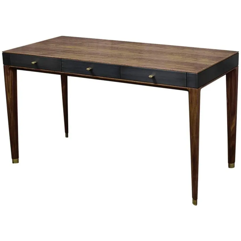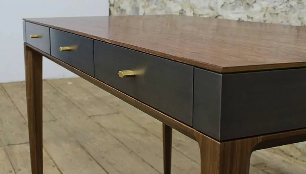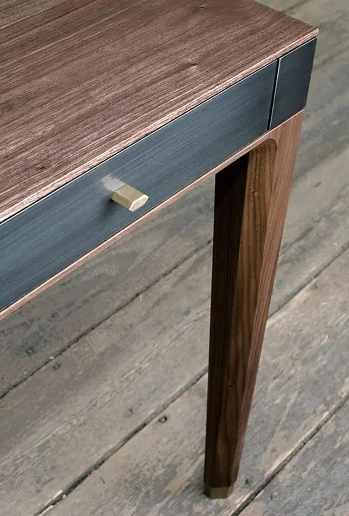Shown in oiled walnut and gunmetal steel with burnished bronze hardware, the Tulare desk features three solid wood drawers, custom-made hardware and hand applied finishes.Dimensions (as pictured): 52" W x 24" D x 29.5" H.Custom sizing and finishes available, please inquire for pricing and availability.Available in most domestic hardwoods (Ash, Oak, Walnut, Maple, Cherry).Hardware available in burnished bronze, brushed or polished brass, and brushed or polished nickel.
