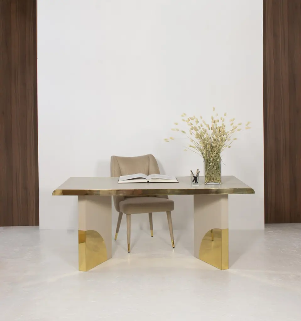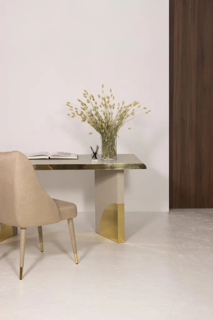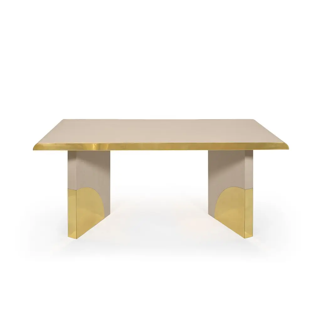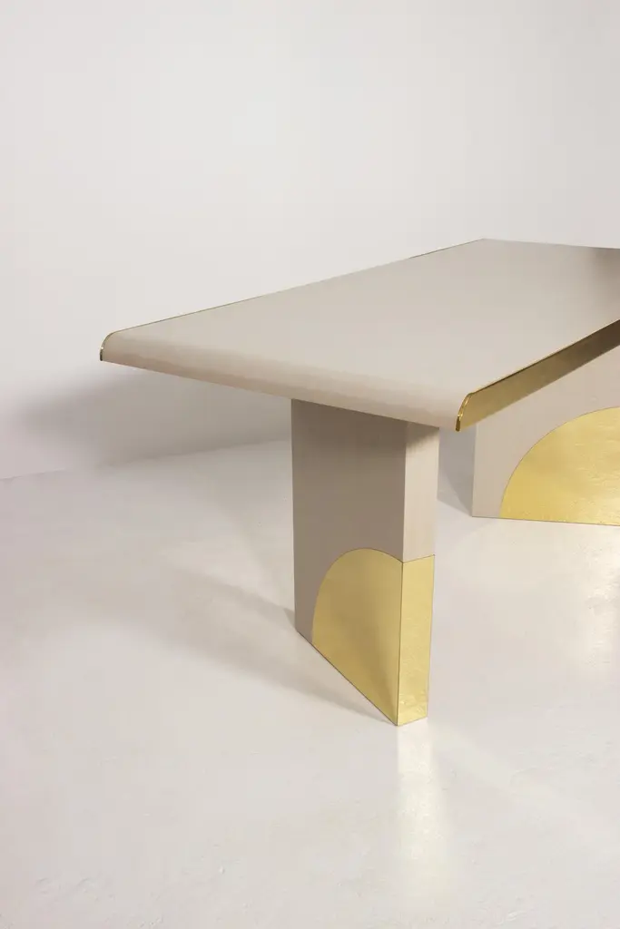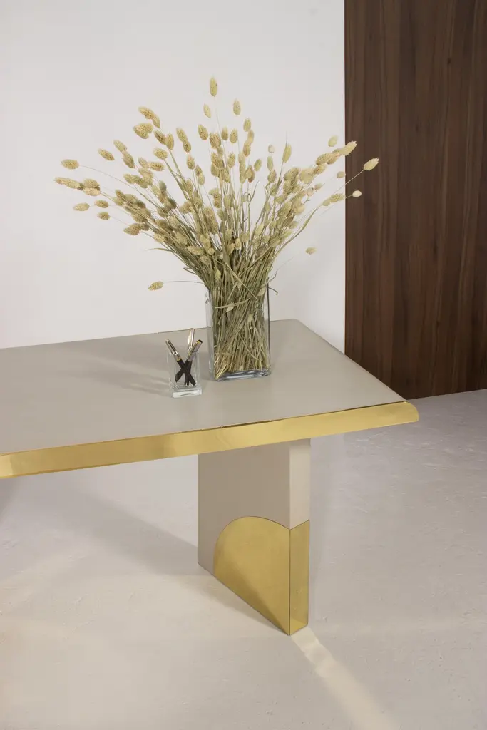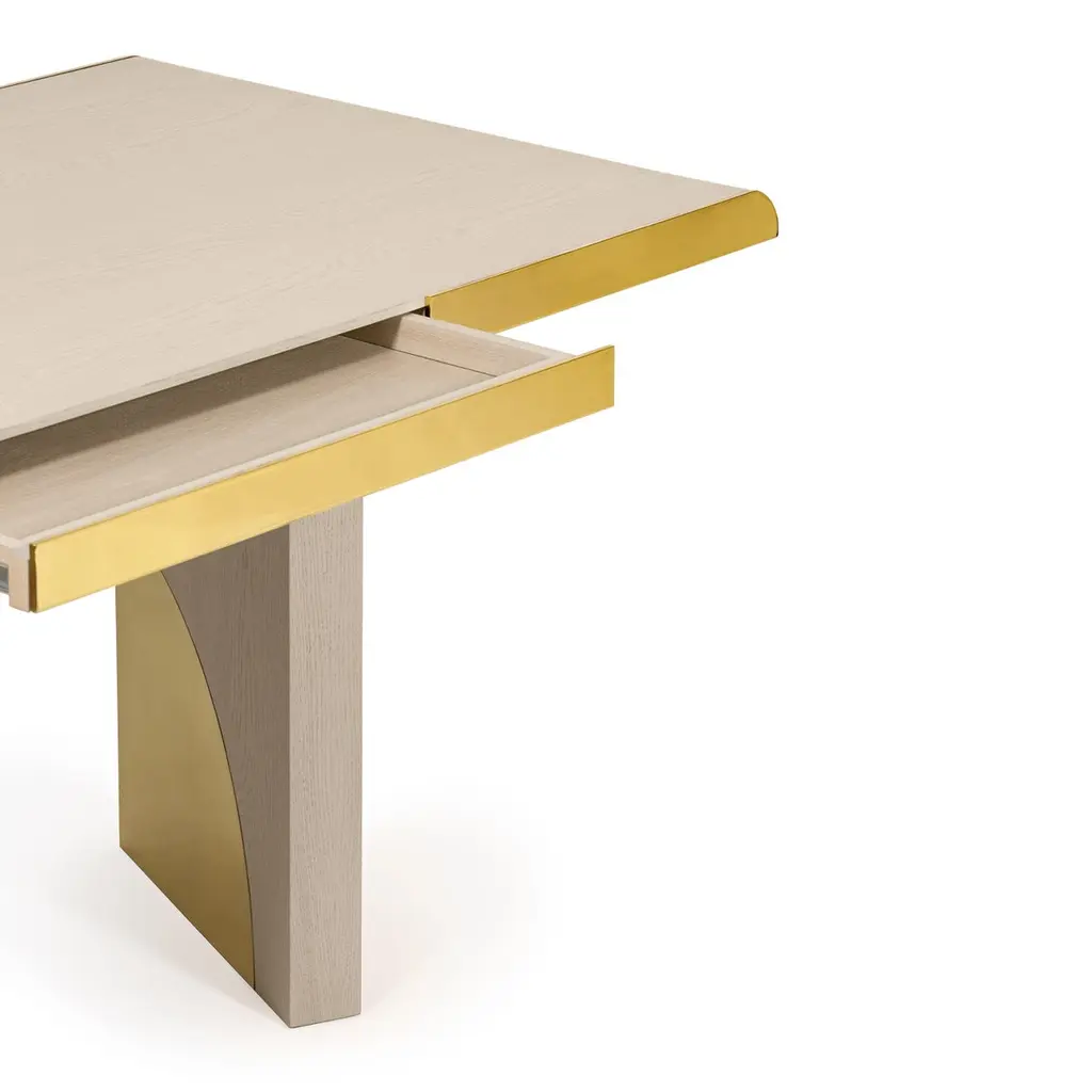 The utopia desk is designed in the likeness of the architectural scale that suggests a crossing through the structures of a utopian city, organized by the principles of symmetry and ideal forms.The imposing design combines cream oak and polished brass. As a futuristic project, two brass blades stylize the cream oak top, curving it with an Avant Garde detail. Surprisingly, a pencil drawer is hidden in one brass blade. At the base, the open shape of two blocks suggests a passage between two identical metal arches, reproducing the curved detail that we find in the brass blades of the top.Product details:Cream oak with open grain and polished brass.Product options:Other woods and finishes under request.Polished, brushed, oxidized brushed or aged brushed brass/copper/steel.Weight: 70Kg 154.4 lbs Made to order. Custom sizes and other finishes are available under request.Designed by Joana Santos Barbosa for InsidherLand, 2020. Handmade in Portugal.