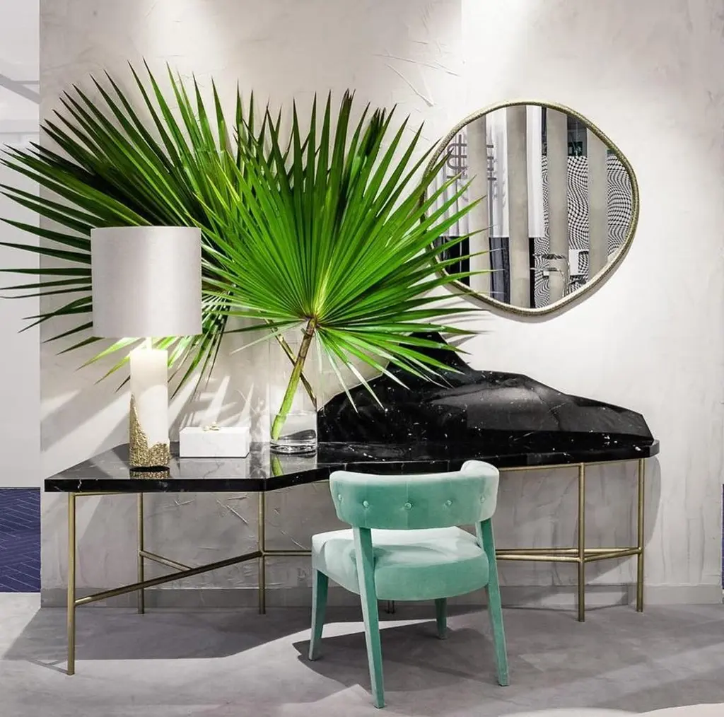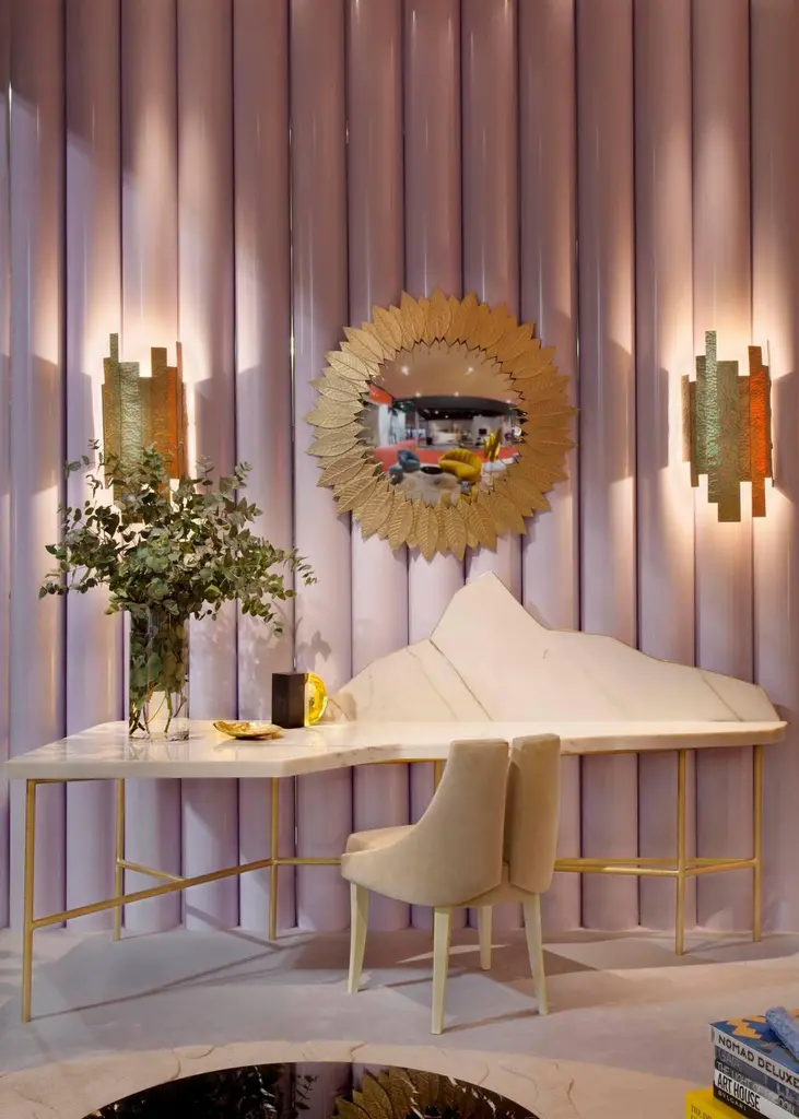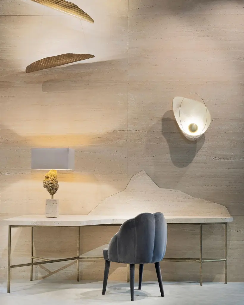 The distinctive marble desk initiates a design tension between rough and smooth, straight lines and faceted shapes. It’s novel metal structure is the foundation from where mountains and hills arise, reimagined in its silhouette. The desk devises a panoramic setting that can be appreciated from any vantage point.Available in 2 versions: Left and Right.Size can be customized to fit your space.Top and screen in Estremoz marble in polished finishing; structure in striped tube with Brass finishing; rim in Brushed Brass. Also pictured with Top and Screen in Nero Marquina marble in polished finishing.We do our best to expedite production and to ship and deliver product within the listed lead time, however current lead times might be longer due to global shipping backlog and delays. These delays are out of our control and cannot be a reason to cancel an order.