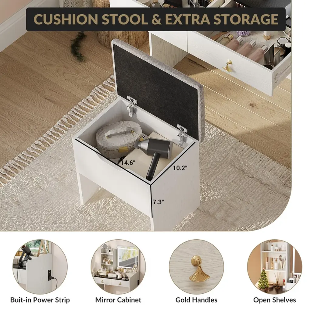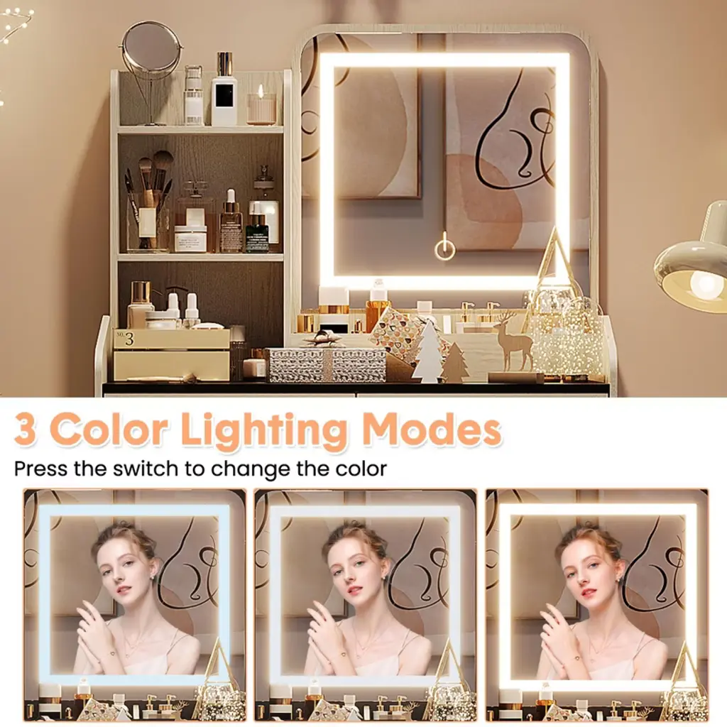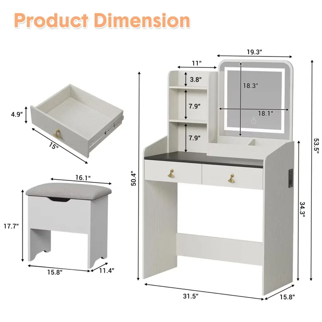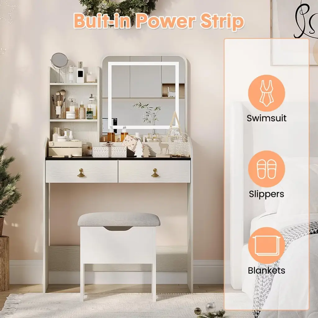 Vanity Desk with LED Light Mirror and Charging Station, Small Makeup Vanities Set with 2 Drawers, Vanity for Girls and Women with Storage Stool