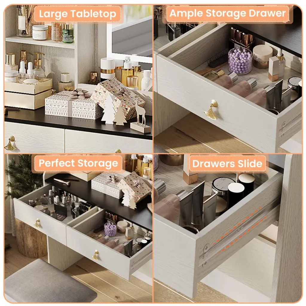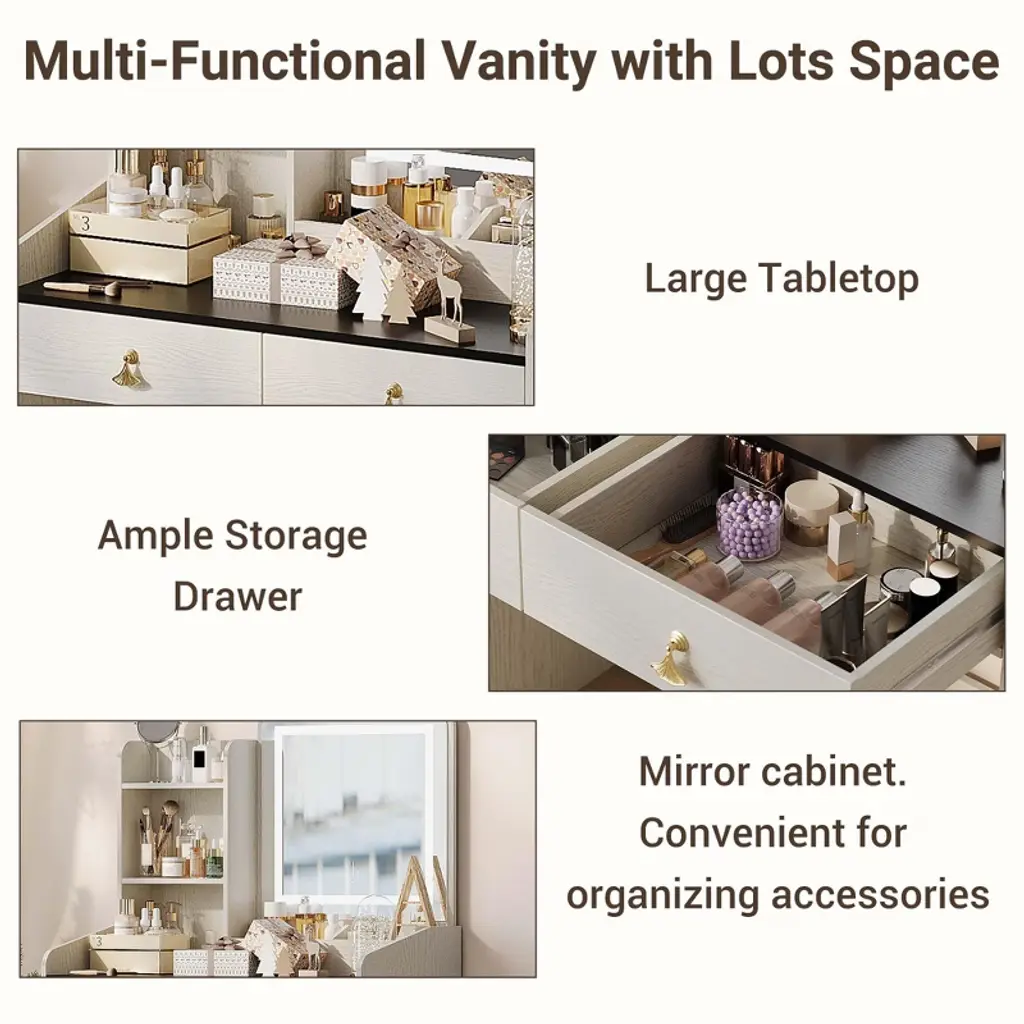 Vanity Desk With Led Light Mirror And Charging Station, Small Makeup Vanities Set With 2 Drawers,white + Black Tabletop