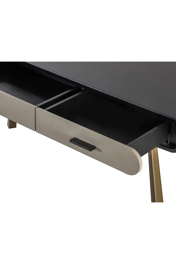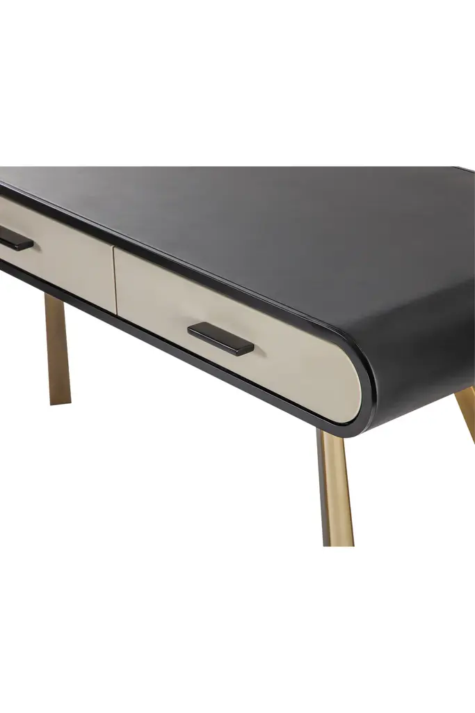 Covered in soft leatherette, the smooth round corners of the Chiado Desk present a graceful feature while the splayed antique brass legs provide sturdiness. This three-drawer desk fitted with a matt black steel handle is designed to be functional with ample storage for stationeries and documents.