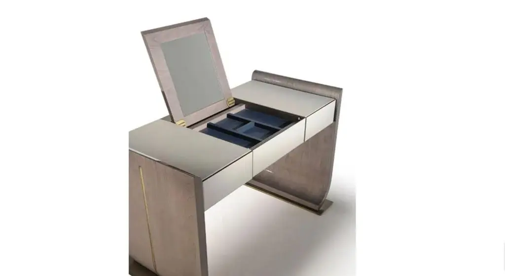 The Vendôme vanity by Hugues Chevalier is a masterpiece of elegance and sophistication. With its distinctive curves and refined design, it embodies both modern luxury and classic Art Deco influences.Crafted from varnished oak, it is available in a matte or glossy finish, complemented by metal accents in bronze, chrome, or dark chrome. The top is adorned with either finely stitched leather (CATB or vegetable leather) or wood, enhancing its luxurious appeal. Practicality meets beauty with drawers seamlessly integrated at the front, ensuring functionality without compromising style.As a statement piece, the Vendôme desk is perfect for refined interiors, whether as a vanity or a stylish workspace. Hugues Chevalier’s craftsmanship ensures this piece remains a timeless addition to any elegant setting...