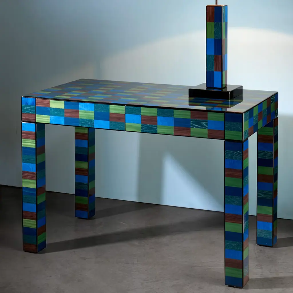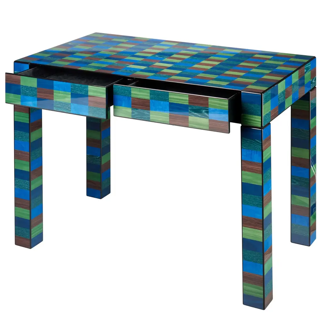 A stunning design of contemporary sophistication and timeless value, this writing desk belongs to the Venezia Mestre series inspired by the namesake city near Venice, Italy. Showcasing natural grains through the polished and mirror-brushed finishes of the clean wooden shape, it boasts a handmade inlay work painted by hand in vivid tones. It features two drawers covered with black Alcantara. Available in other colors, please consult the Artemest catalog for options.