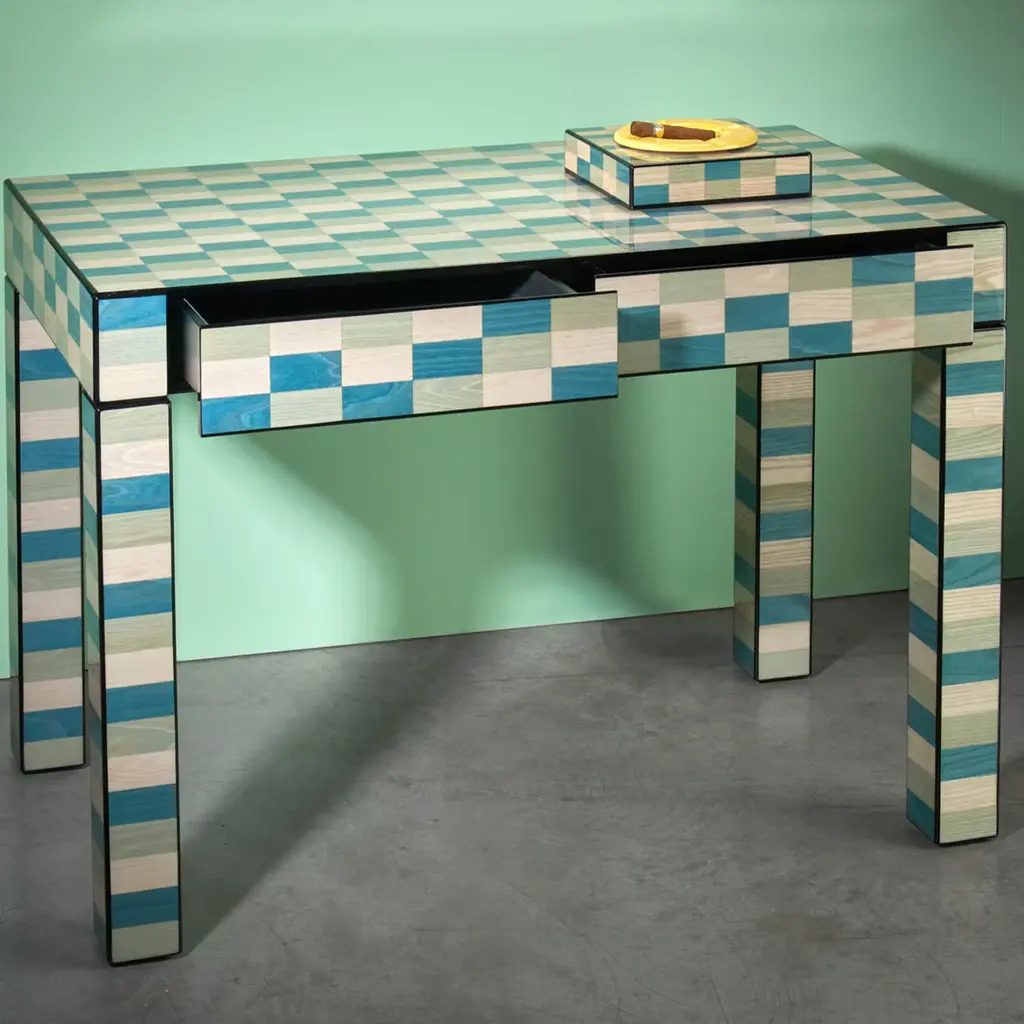 Showcasing natural grains through the polished and mirror-brushed finishes of the rectangular wooden shape, this writing desk boasts a handmade inlay work painted by hand in a delicate palette inspired by the colors of the Venice Lagoon. It features two drawers covered with black Alcantara. Available in other colors, please consult the Artemest catalog for options.