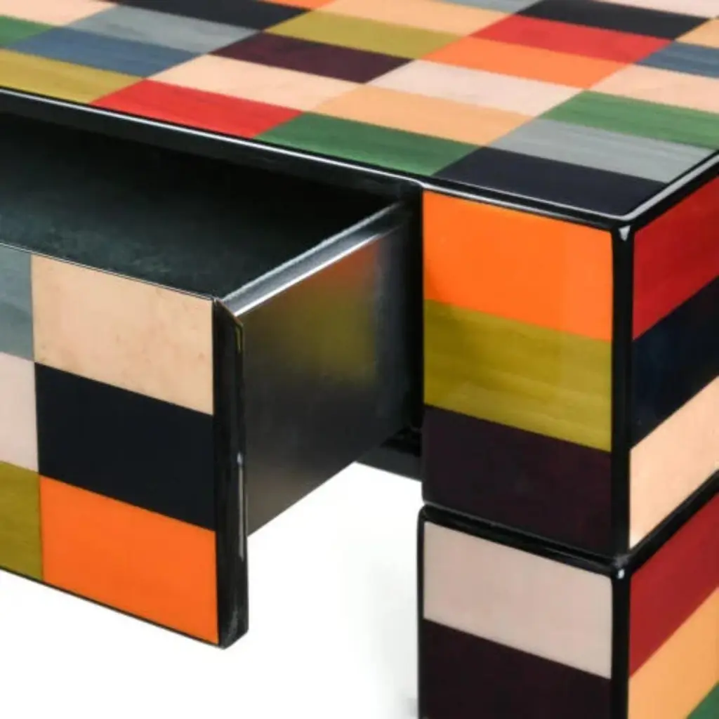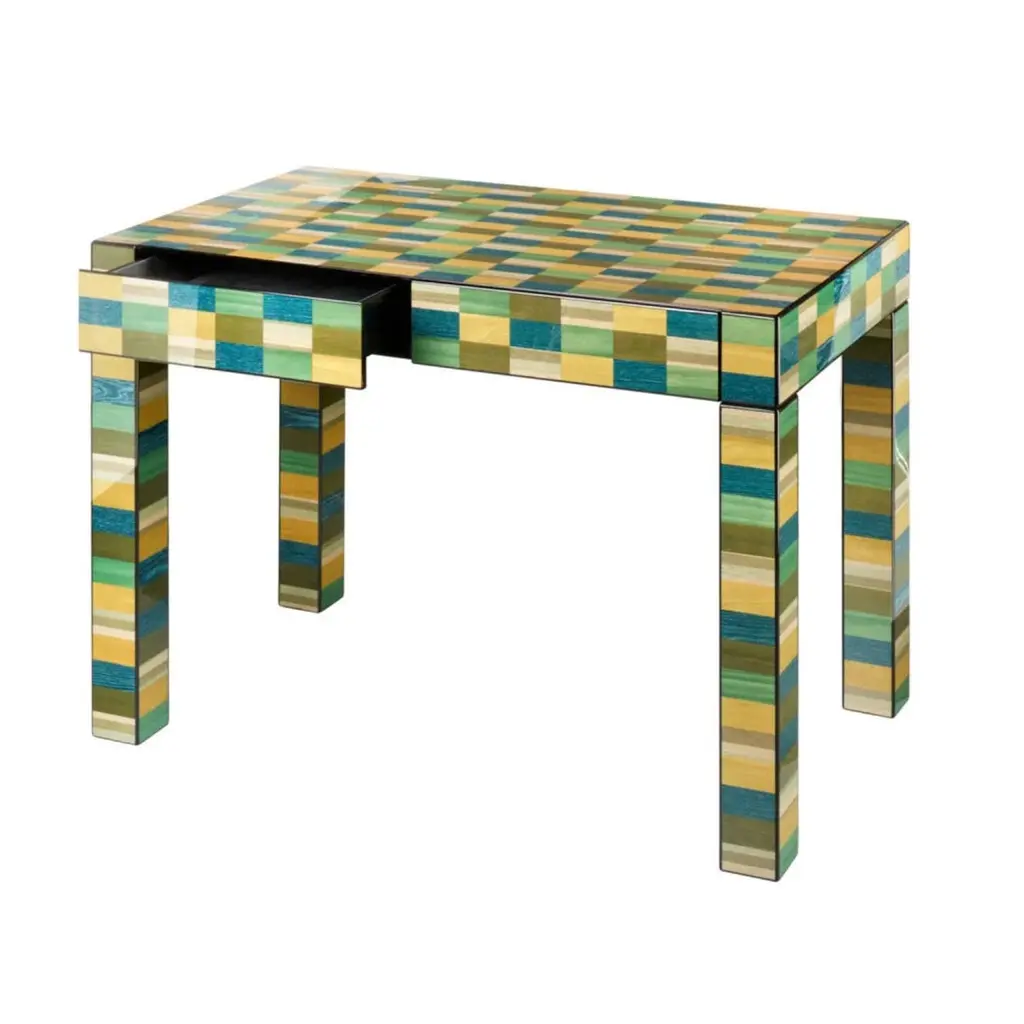 Venice Mestre Desk by MoriciDimensions: W 113 x D 65 x H 77 cm, Drawers : 42×43 H6 covered in Alcantara.Materials: Wood, black Alcantara, inlay veneer.Finish : Gloss brushed polyester.This desk will elegantly enhance any modern interior. Crafted entirely from wood veneer with a striking geometric inlay, lacquered in a rainbow palette, and hand-polished and brushed, this designer piece features two practical drawers upholstered in black Alcantara.About:Driven by a passion for craftsmanship, Luciano Morici and his wife Doriana Marconi launched their business in the late 1970s. Their collaborations with leading local companies quickly blossomed, designing and producing wood and leather accessories renowned for their meticulous attention to detail. Over time, the small artisan workshop, thanks to the value of its products, has transformed into a company with a fundamental artisanal vocation.Their products are the result of the finest Italian artisan tradition in wood and leather working. The company maintains strong ties to the splendid Marche region, renowned for its art and culture, beautiful landscapes, and a deeply rooted entrepreneurial spirit recognized internationally.