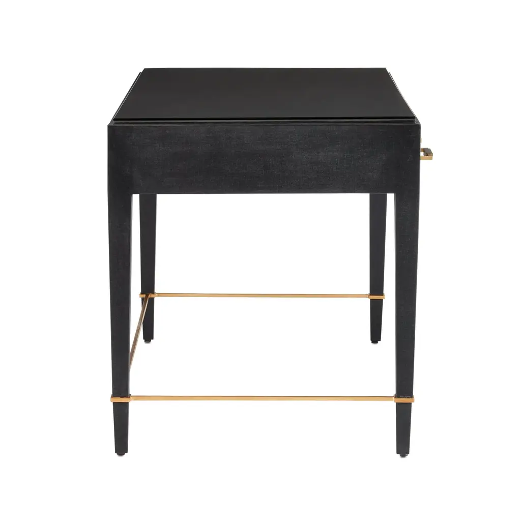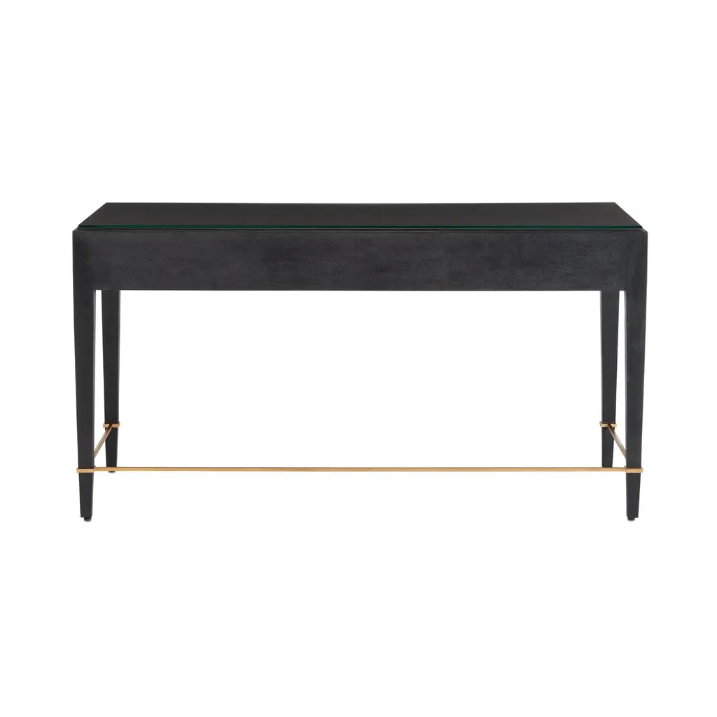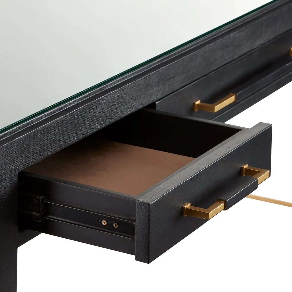 The Verona Black Large Desk is made of mahogany that has been covered in a black lacquered linen. It has a touch of gold on the champagne-finished metal detailing. This is one of our pieces that proves the brilliance of our design team, as the stretchers that clasp each leg are beautifully rendered to create a continuous design detail from leg to leg. Other features are adjustable glides and solid mahogany dovetail drawers. Ships In 7-10 Business Days This image is for illustrative purposes only. The colors shown are accurate within the constraints of lighting, photography, and the color accuracy of your screen.