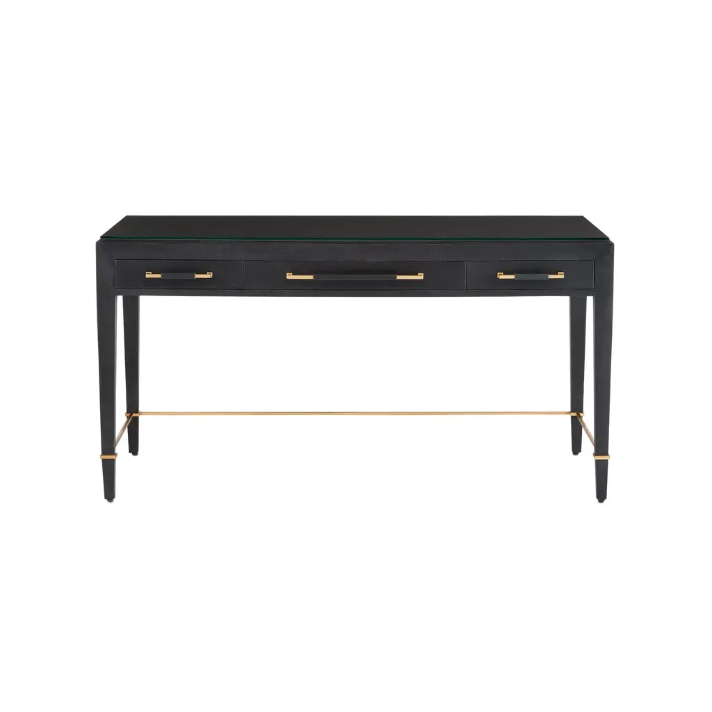 The Verona Black Large Desk is made of mahogany that has been covered in a black lacquered linen. It has a touch of gold on the champagne-finished metal detailing. This is one of our pieces that proves the brilliance of our design team, as the stretchers that clasp each leg are beautifully rendered to create a continuous design detail from leg to leg. Other features are adjustable glides and solid mahogany dovetail drawers. Ships In 7-10 Business Days This image is for illustrative purposes only. The colors shown are accurate within the constraints of lighting, photography, and the color accuracy of your screen.