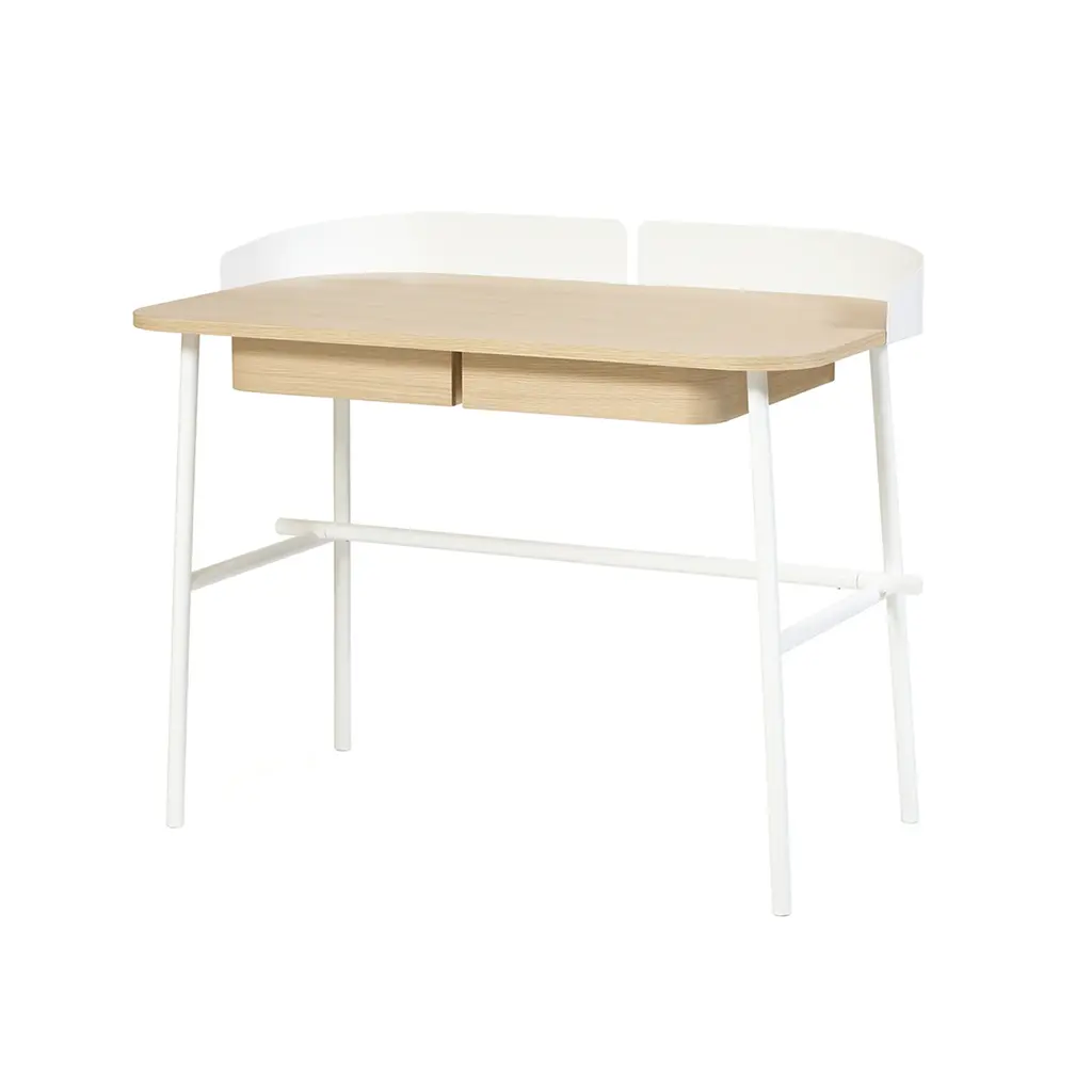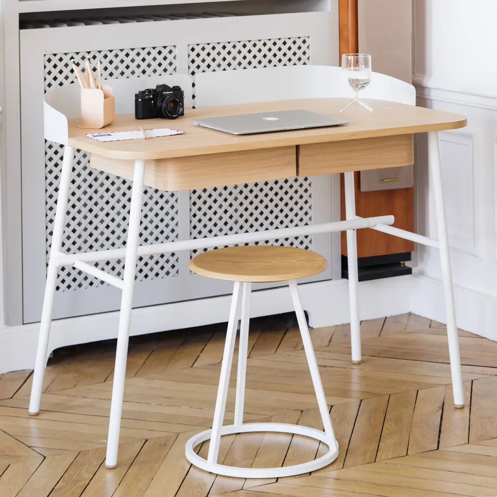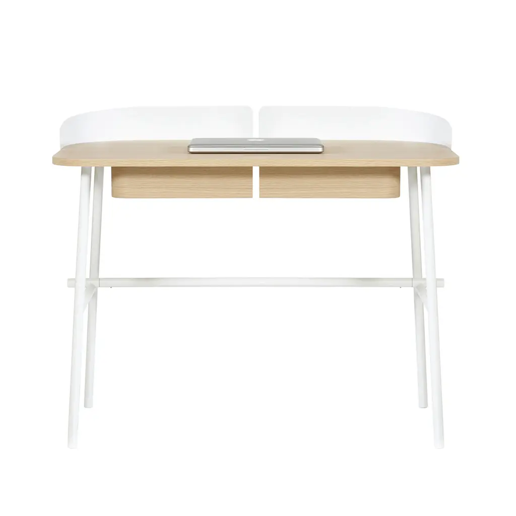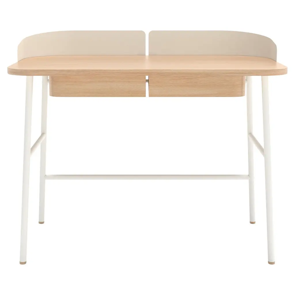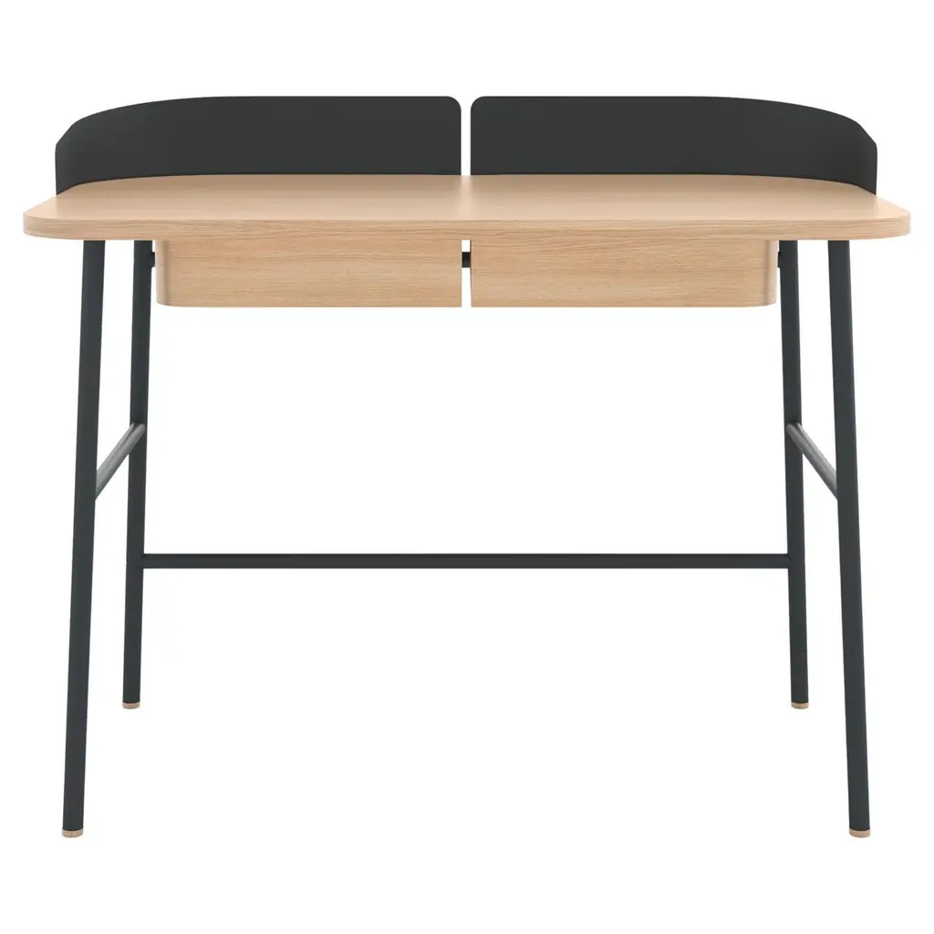 Designed by Pierre-François Dubois for the French brand Hartô, Victor is a stylish desk especially suited to smaller working areas. Structured with a matte-finish painted metal frame, it has a roomy oak-veneered desktop and 2 large drawers for stashing papers and work necessities. A matching metal divider at the back provides a colorful accent as well as keeping pens and other small items from falling on the floor.