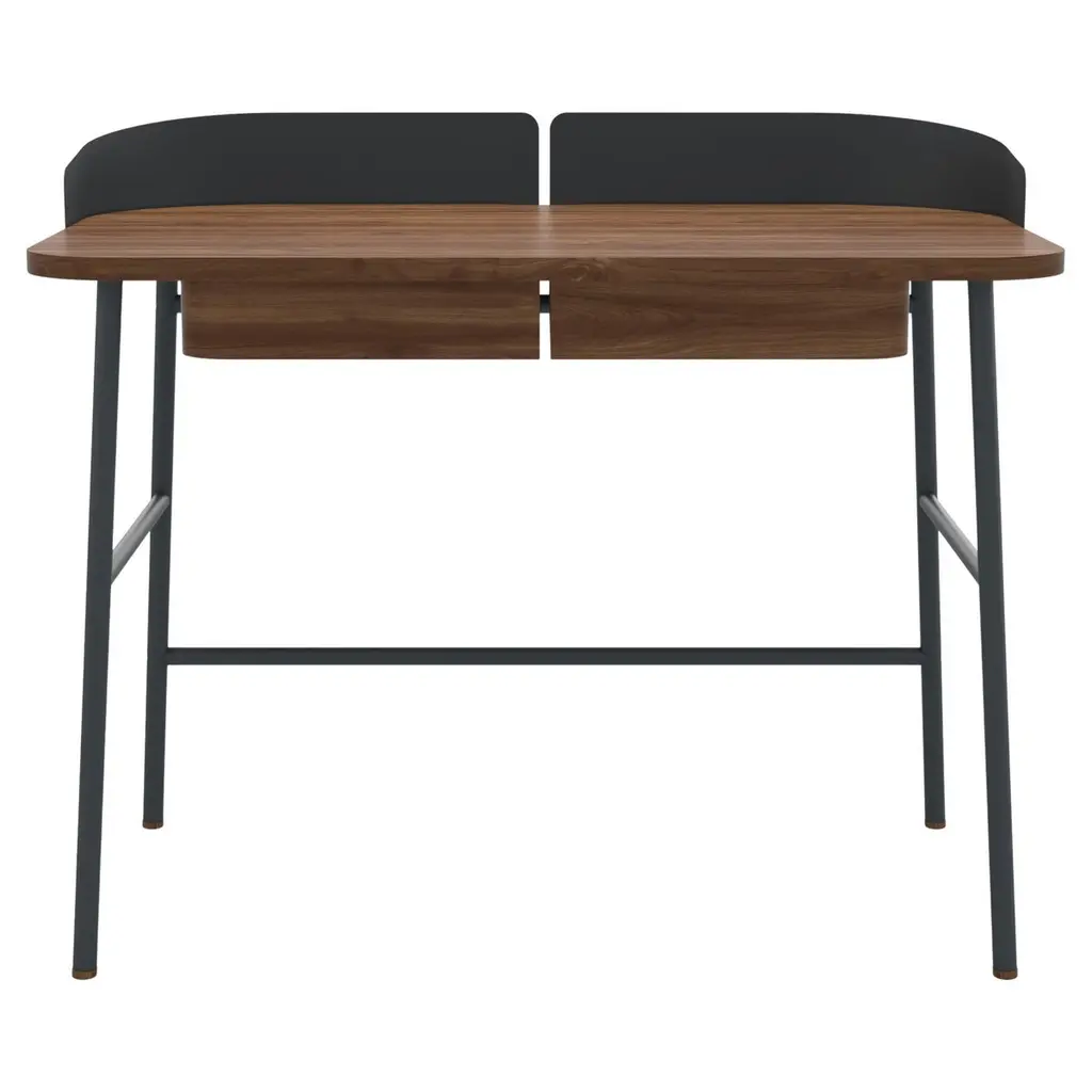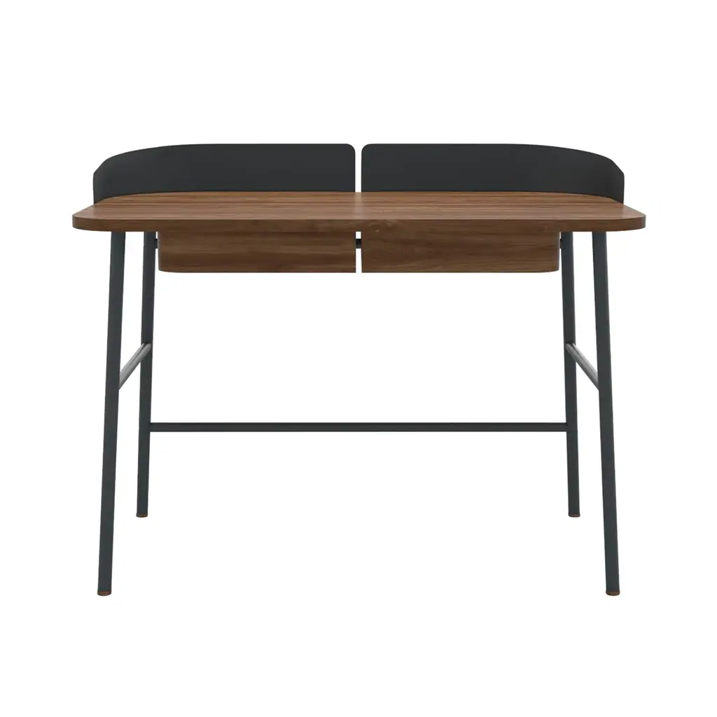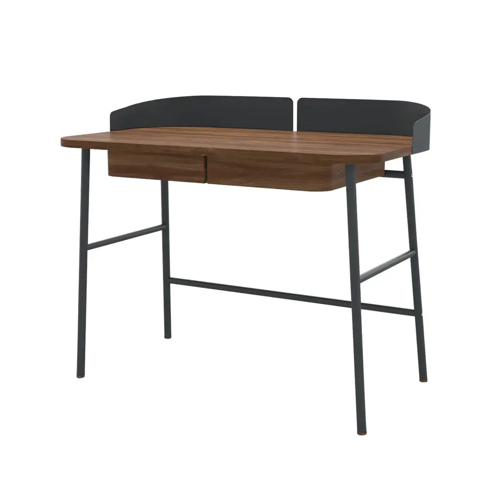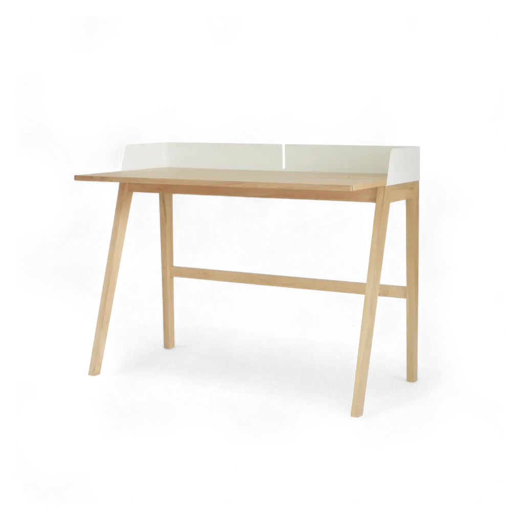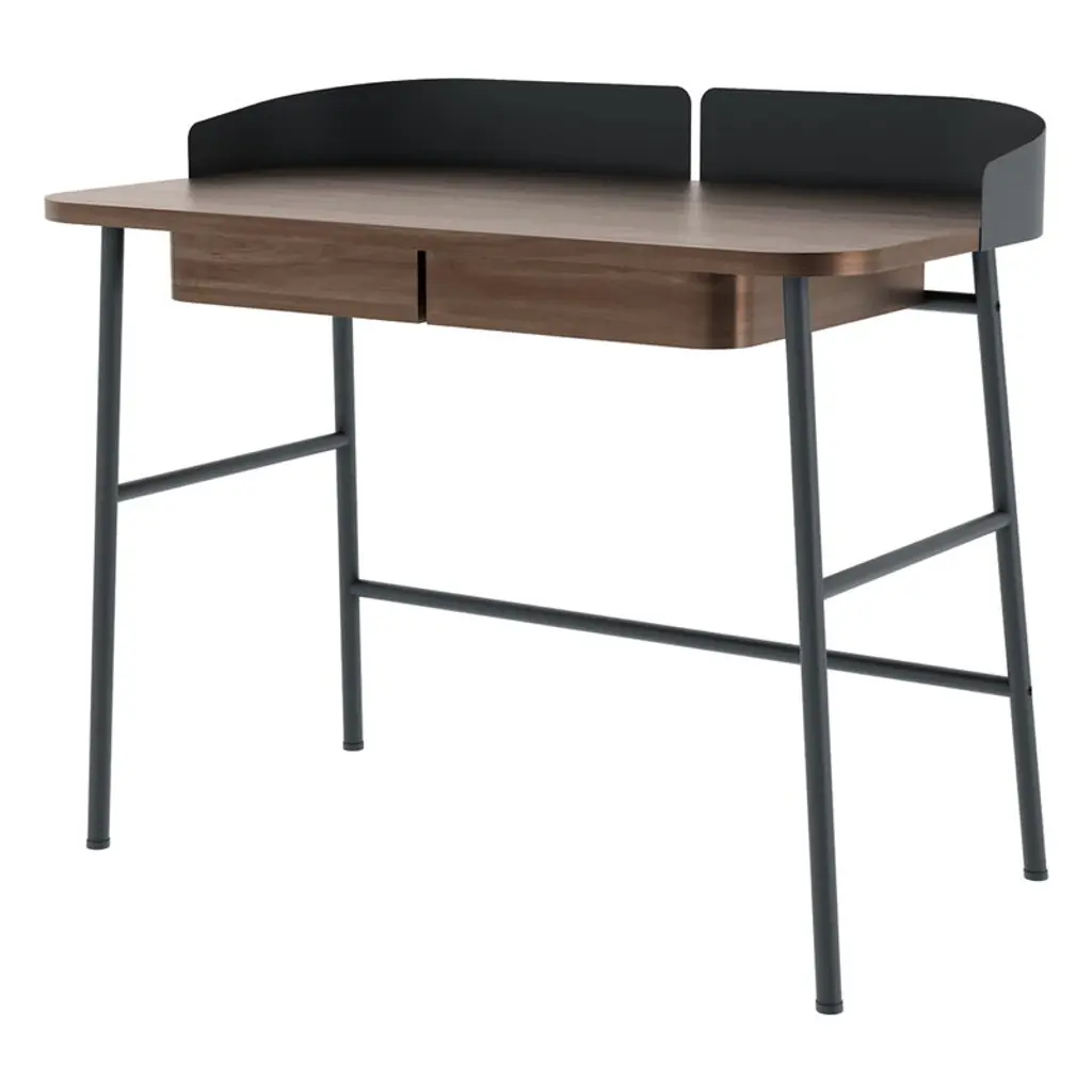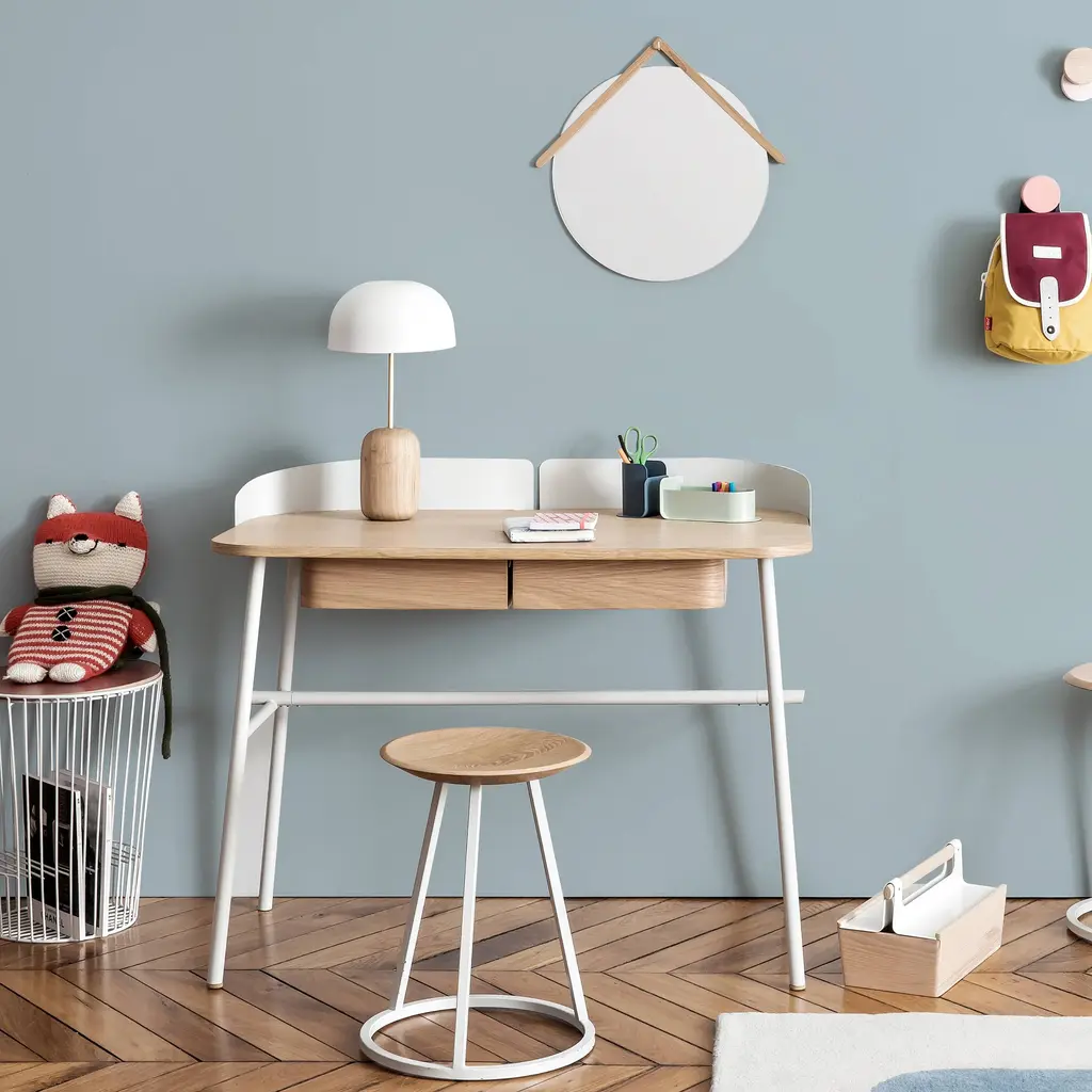 Designed by Pierre-François Dubois for the French brand Hartô, Victor is a stylish desk especially suited to smaller working areas. Structured with a matte-finish painted metal frame, it has a roomy oak-veneered desktop and 2 large drawers for stashing papers and work necessities. A matching metal divider at the back provides a colorful accent as well as keeping pens and other small items from falling on the floor.
