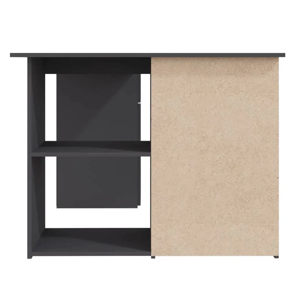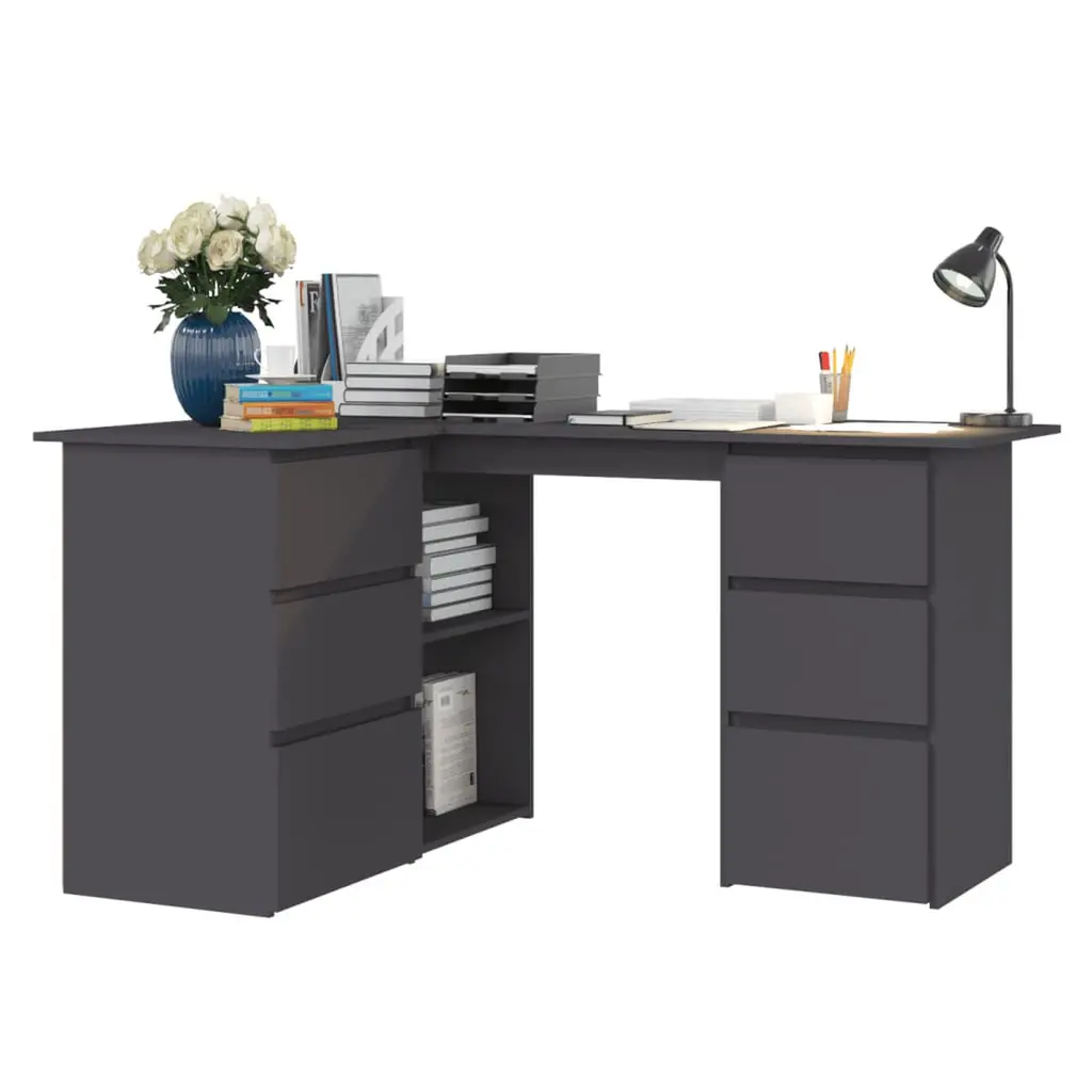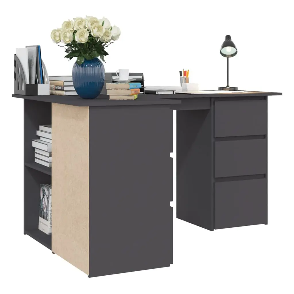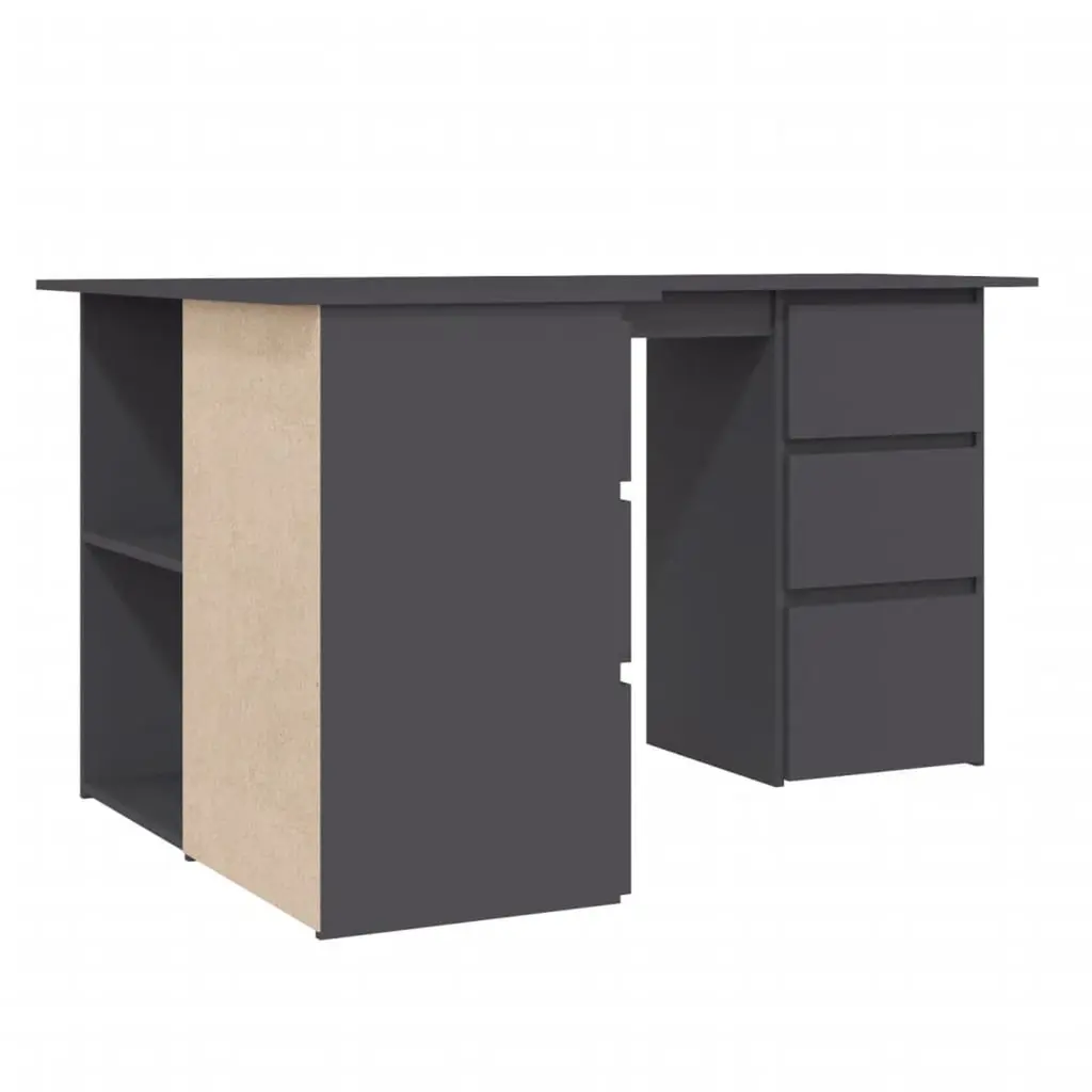 This gray corner desk is a functional and stylish addition to any home office or study. With a smart modern design, it maximizes your workspace while offering convenient storage options to keep things neat and within easy reach. Efficient Use of Space: Its clever corner design helps you maintain a clutter-free workspace, perfect for smaller rooms. Using corner spots frees up important floor space, making your surroundings feel more spacious. It’s a smart solution for urban living or places needing functional furniture.Generous Storage Options: With 8 compartments, including 4 drawers and 4 shelves, this desk keeps your workspace tidy. Each drawer has plenty of room for office supplies, while the shelves provide versatile storage, keeping everything neat even when it’s busy.Modern and Sleek: The contemporary matte gray finish fits in with various decors, making this a stylish choice for any room. Its smooth feel and minimalist design add a touch of elegance while remaining practical.Versatile Usage: Made for computer workstations, studying, and more, this desk caters to diverse needs. Whether you’re in for a long work session or a casual study, the layout suits both pros and students alike, boosting productivity.Built to Last: Crafted from sturdy engineered wood, this desk is tough and reliable. You'll get longevity and dependable performance, promising a smart investment for enhancing your working environment.