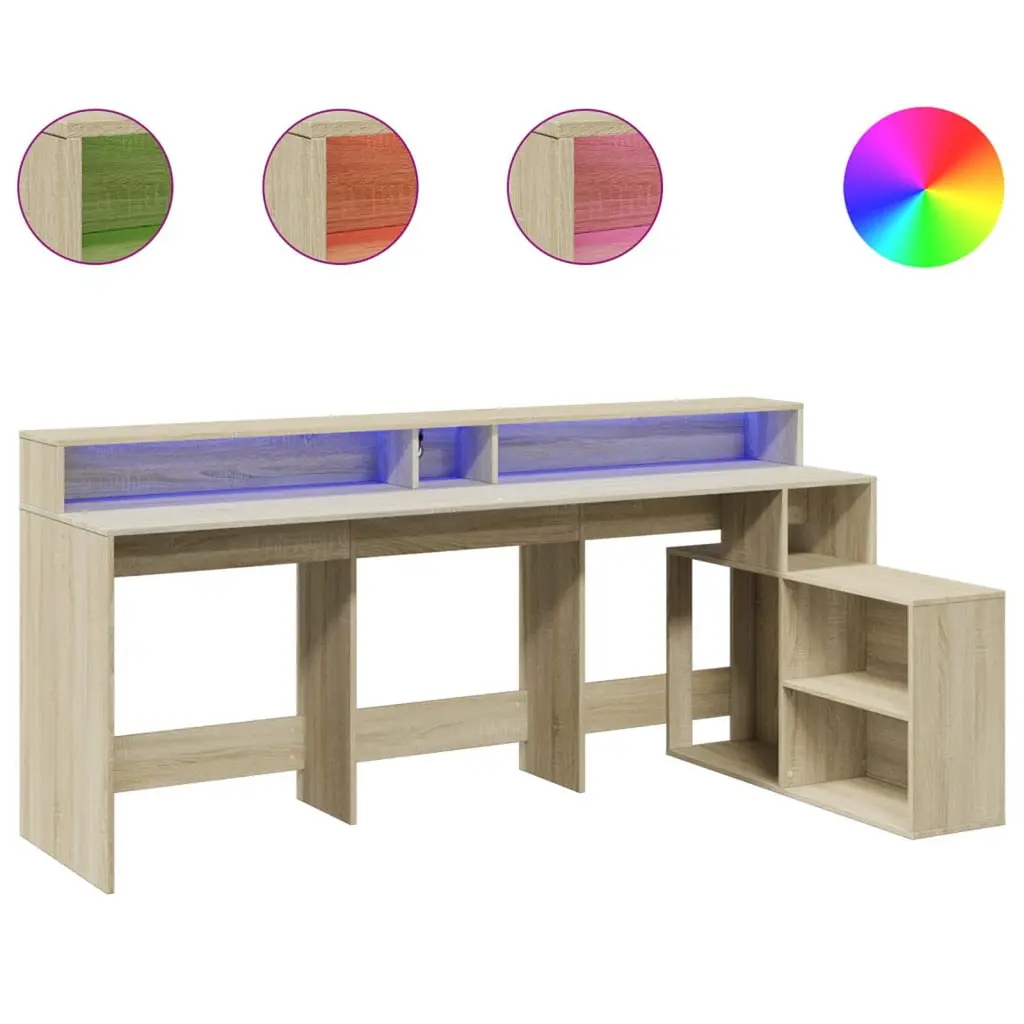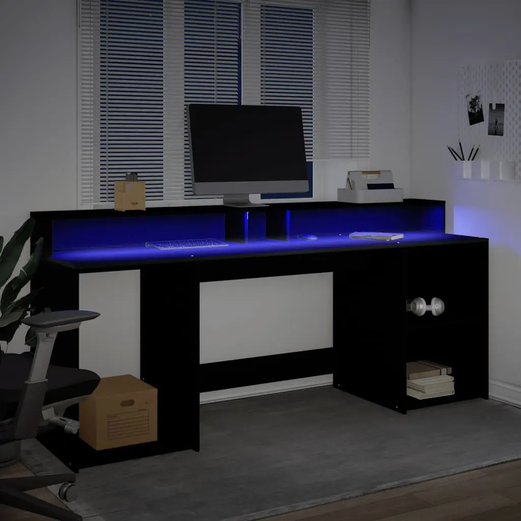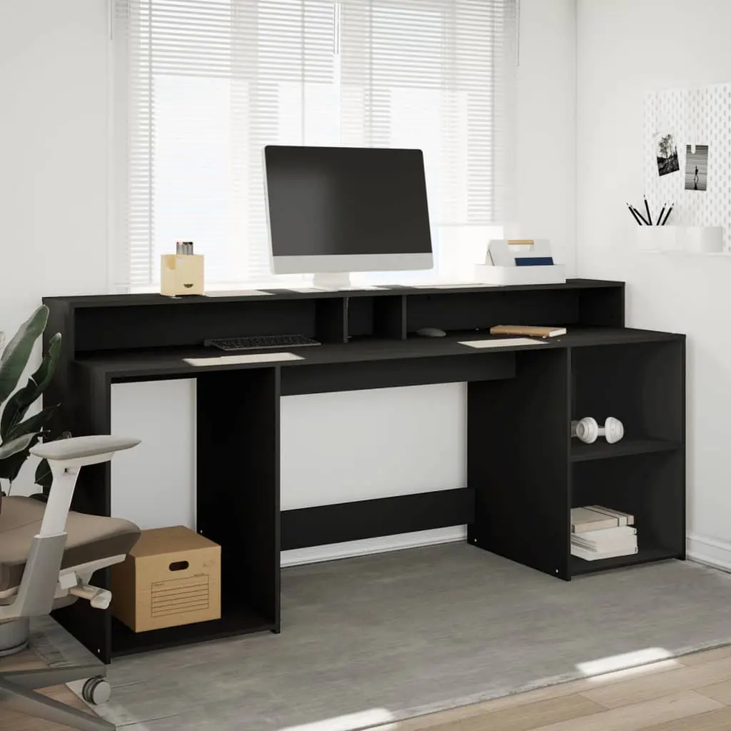 This LED-Illuminated Office Desk redefines workspace functionality with its striking design and advanced features, making it an essential piece for any modern home office or study area. With a generous surface area and integrated lighting technology, this desk transforms your routine, providing ample space for typing, gaming, or creative projects for anyone seeking an upgrade in their workspace environment. Integrated LED Lighting: The desk includes RGB LED lights that not only provide illumination but also boost your productivity and creative vibes. Tailor the brightness according to your activity, whether you're writing, working on graphics, or gaming.Spacious Workspace: With dimensions of 78.7in x 21.7in, you have the freedom to spread out your belongings, enhancing your organization without feeling cramped.Modern Design: Its sleek black finish and smooth texture offer a stylish accent to your working area. The contemporary look complements various room styles, making it a versatile addition.Durable Build: Crafted from engineered wood, this desk ensures a sturdy structure that can support a maximum weight of 198.4 lbs, accommodating your computer setup and accessories effortlessly.Ample Storage: It features three board shelves for keeping your office essentials in order, enabling you to maintain a clutter-free workspace.