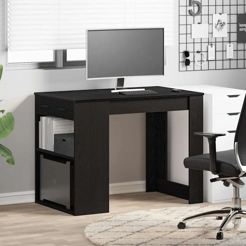 This modern desk mixes style and functionality, designed thoughtfully to fit various purposes in your home or office. With its smooth black oak finish and practical design, it not only serves as a workspace but also upgrades your decor, fitting seamlessly into your living room, study, or home office. Ample Storage: The desk features a generous surface area plus a drawer and shelves, making it easy to organize your office supplies and keep your workspace tidy. Perfect for focused work, whether you're sorting meeting documents or connecting devices for a big project.Durable Design: Every part of this desk is made from engineered wood, ensuring it can handle daily use and still stay strong. Sturdy construction means it’ll last through heavy workloads.Stylish Appearance: Its modern and sleek style, with a matte black finish, makes it easy to blend into any existing decor. This desk adds a touch of elegance to your space, whether it’s a professional setting or your personal study.Functional Versatility: Designed for many uses, it's perfect for writing, computing, or studying. It fits well in various room layouts, making it an essential piece for both small and spacious areas.Easy Assembly: Comes with clear instructions for quick setup, so you can start enjoying your new workspace without any hassle.