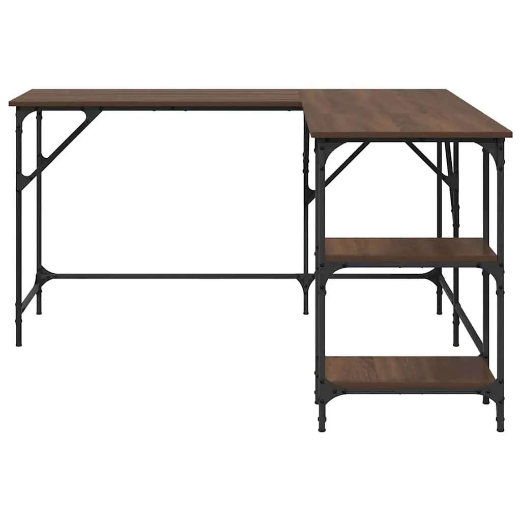 This L-shaped corner desk is cleverly designed to make the most of your workspace while adding an industrial vibe to any home office. Its rich Brown Oak finish looks warm and inviting, while the matte black legs give it a contemporary twist. The desk is great for writing or as a computer station, suitable for both work and play. Spacious dimensions of 54.7 in by 54.7 in mean plenty of room for your laptop, documents, and more, making it a solid choice for both adults and professionals. Space-saving Design: This desk fits perfectly in corners, making it a great choice for smaller rooms while keeping it stylish.Easy Accessibility: The height-adjustable feet allow it to sit steadily on uneven floors, giving you a comfy workspace.Durable Material: Built from solid engineered wood, it’s not only good-looking but also made to last, ideal for daily use.Built-in Storage: Two handy built-in shelves make storing books, documents, and supplies a breeze.Flawless Finish: The smooth surface makes writing or typing easy, paired with a sleek look that elevates your workspace.