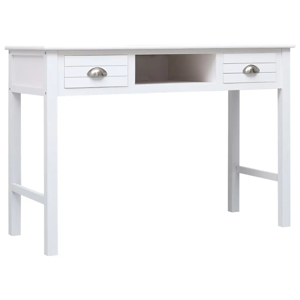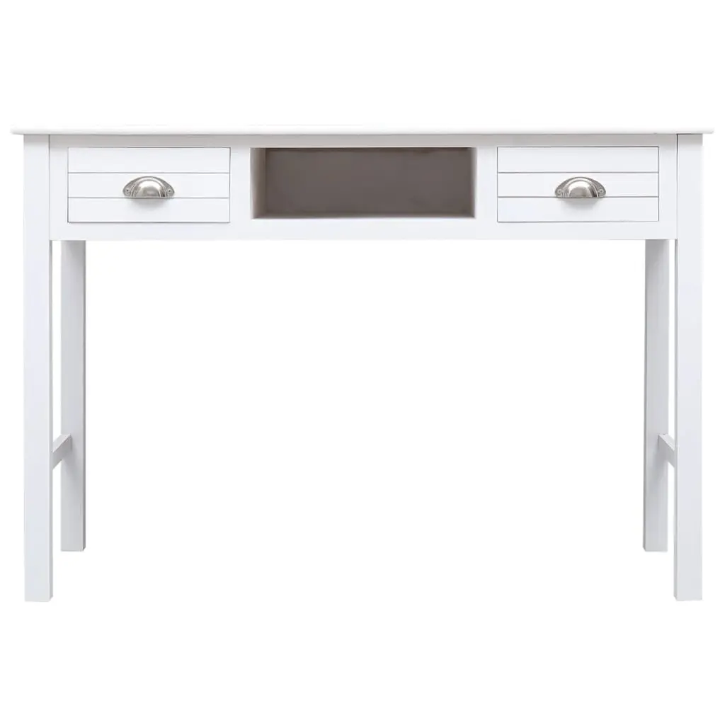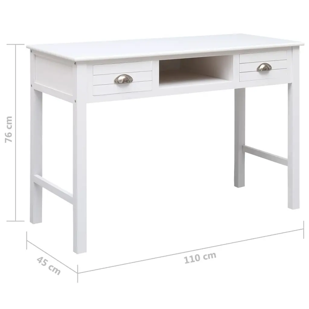 This writing desk is all about elegance and practicality, making it a fab addition to any home office or study. With its smooth white top and minimalist vibe, it goes well with various decor styles and offers plenty of space to work, study, or jot down ideas. Ample Storage: This desk makes staying organized a breeze with two roomy drawers and one open slot. Each drawer is perfect for keeping writing stuff, notebooks, and office supplies, so you can keep your workspace neat. The open space is great for showing off decor or quick access to your go-tos.Quality Materials: Built from solid Paulownia wood, this writing desk is tough. The solid frame and strong surface can handle daily wear without losing its style or function. Its painted finish boosts its good looks and protects the wood for the long haul.Smooth Surface: The desk boasts a roomy writing area of 43.3 in by 17.7 in, great for laptops, books, and pens. The smooth surface makes writing easy and comfy, whether you're grinding away on assignments or just jotting down quick notes.Stylish Handles: The trendy cup pulls in polished silver add a stylish touch to the whole look. They’re easy to grip, making drawer access a breeze, and their finish looks fab with the white wood.Versatile Use: Whether for writing, studying, or as a computer workstation, this desk caters to lots of needs. Its timeless style and useful features make it perfect for anyone, boosting both productivity and comfort in your daily routine.