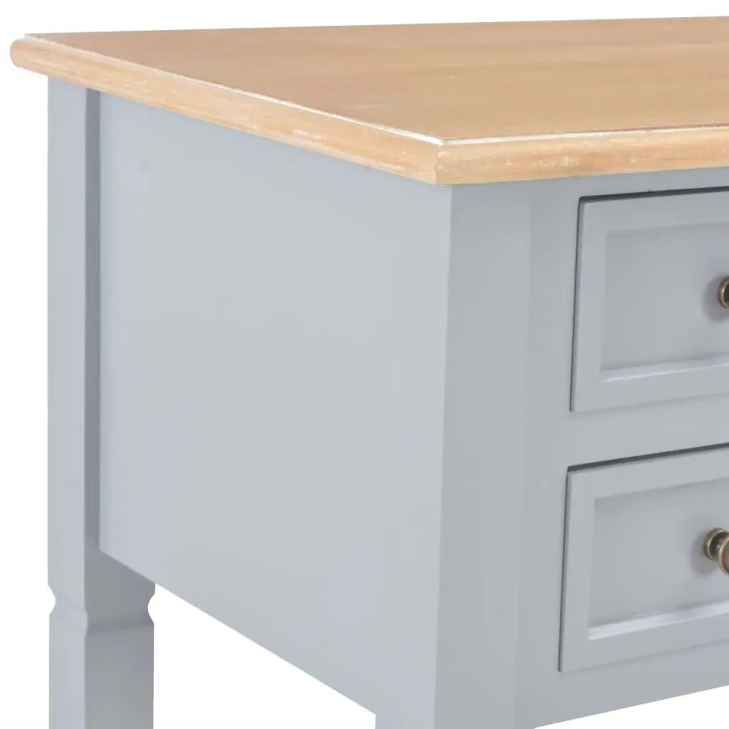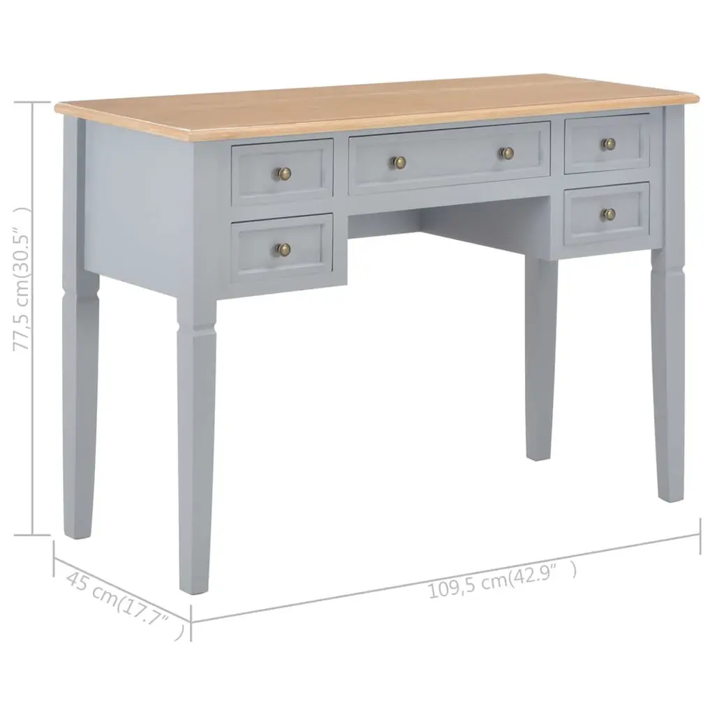 This writing desk is a perfect mix of function and style, made for the modern adult. With its strong wooden build and sleek gray finish, it fits in well at home, whether you’ve got an apartment or a big house. Ample Storage: The desk has five roomy drawers for stashing stationery, documents, and your bits and bobs, keeping your space neat and tidy. Each drawer has a traditional pull handle for easy access and adds a nice touch to the overall design.Elegant Design: With its lovely French country style, the desk complements both rustic decor and modern interiors, featuring a smooth surface that radiates warmth and charm. This artistic design encourages creativity, making it a great centerpiece in any study, bedroom, or office.Solid Construction: Made from top-quality MDF and solid pine, this desk looks good and is built to withstand lots of use. Its sturdy legs provide stable support, giving you a reliable surface for writing or computing.Versatile Use: This writing desk is perfect for various activities like writing, studying, or tackling computer tasks. Its smart design makes it suitable for different environments, enabling you to create a productive space that fosters focus and creativity.Space Optimization: With a size of 43.1 in by 17.7 in and a height of 30.5 in, its compact design fits snugly into smaller rooms while maintaining workspace efficiency. Use it as a minimalist computer station or a charming writing nook.