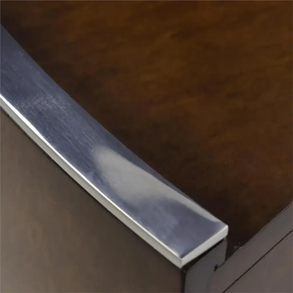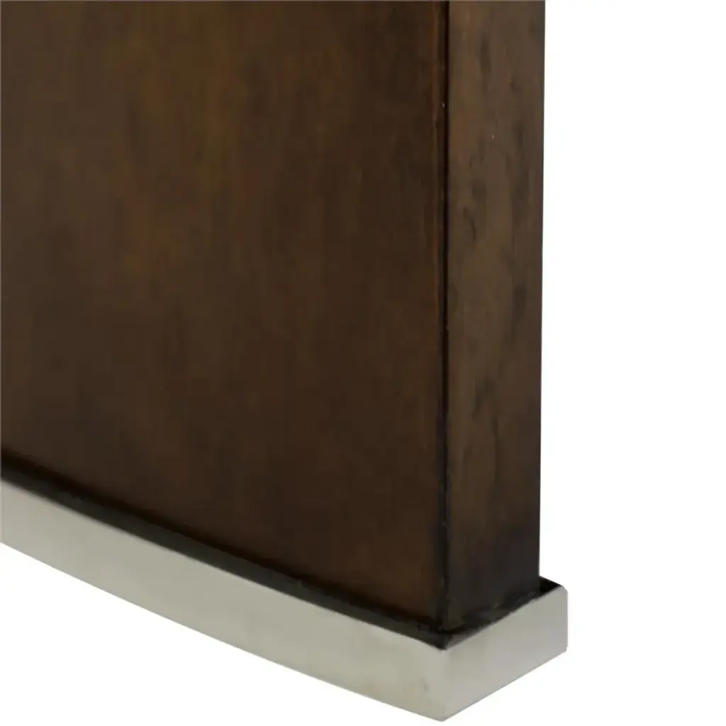 The Vista Desk showcases a seductively curved form elevated by rich dark wood tones. Crafted from eucalyptus wood, the piece displays a Dark Pomelle finish, accentuating the stunning wood grain. A large center drawer with soft closing runners is affixed with a slender handle of Polished Stainless Steel. The piece is supported by three curved legs, completing the look of this innovative statement piece.