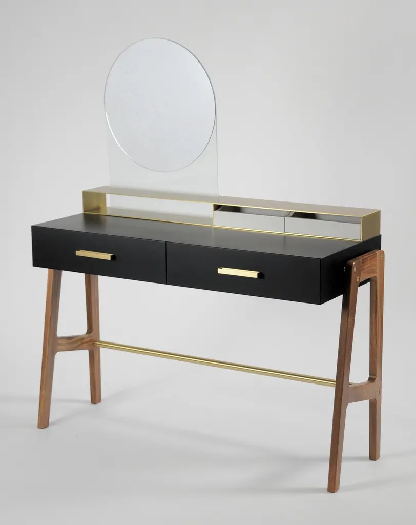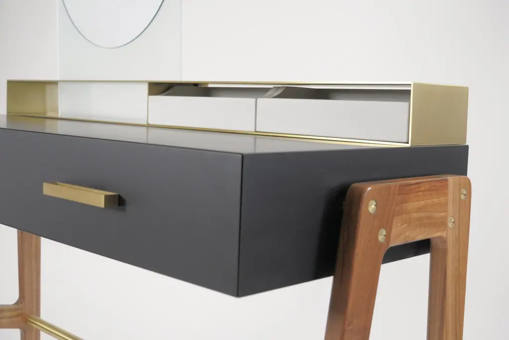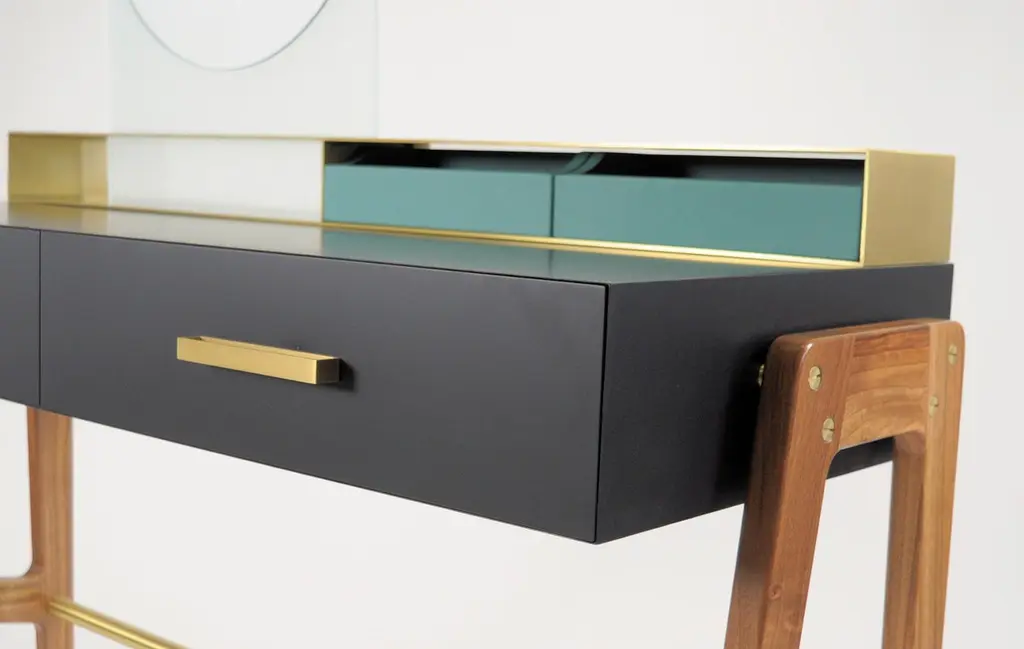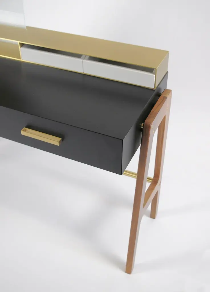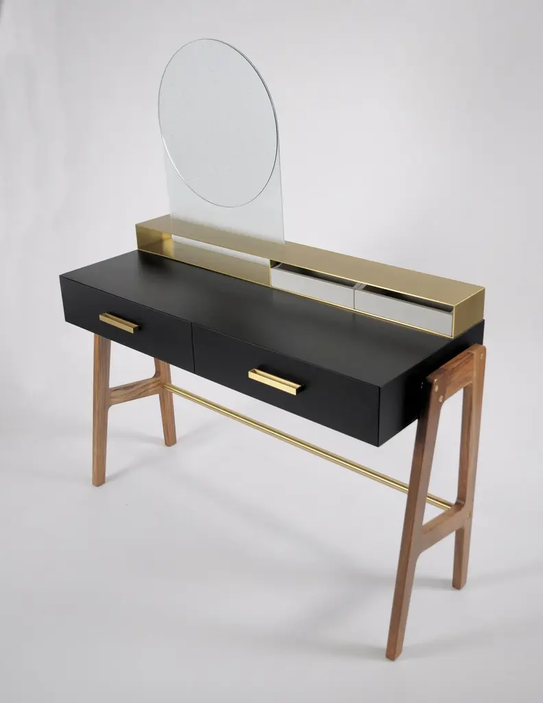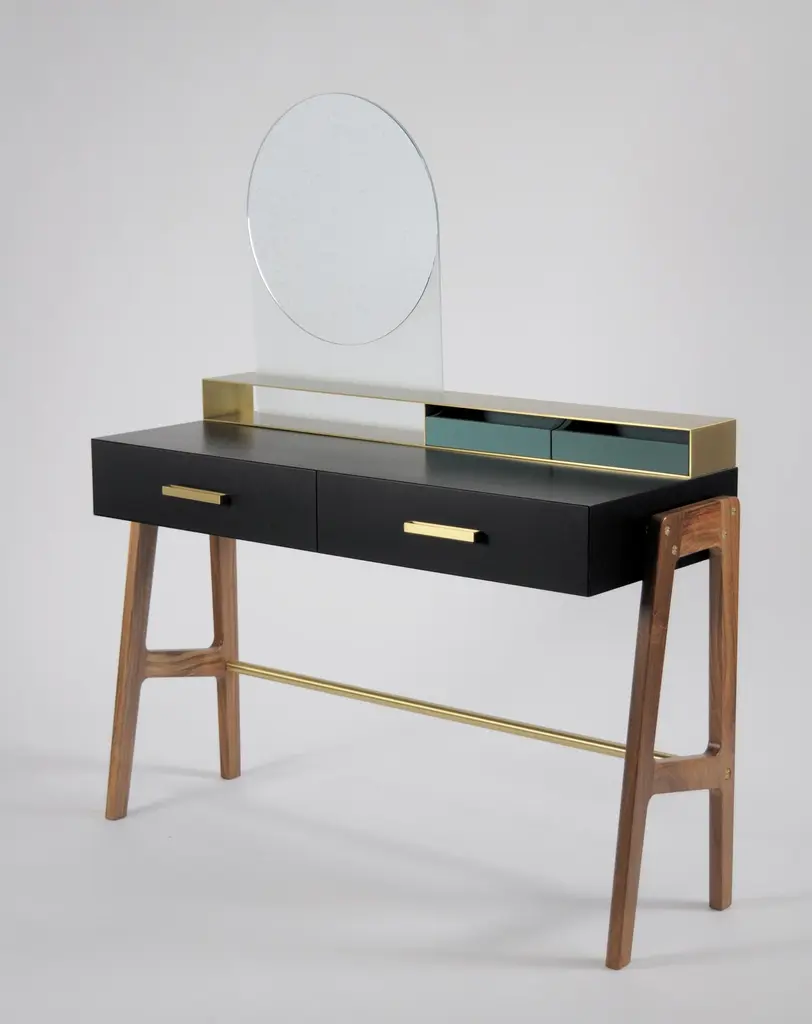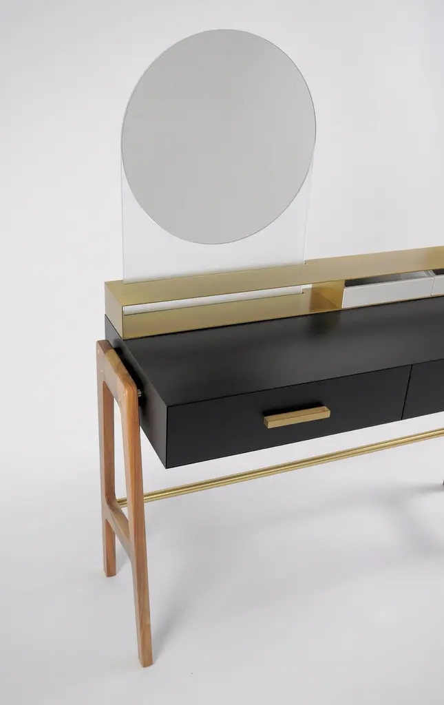 Vivian is a contemporary beauty desk, it can be used as make-up table, thanks to its light wall mirror, or as jewel case. It has simple lines and sophisticated details. A brass box contains the drawers for jewelry. Vivian is an elegant and precious complement that can easily highlight an entrance hall, a bedroom and even a bathroom, Vivian is ideal also for intimate environments such as a boutique-hotel or a private residence. A wooden foot, connected by a brass tube, becomes a structural and aesthetic element at the same time. It is made of scratch-resistant laquered wood, oas or canaletto walnut, brass and glass. Besides, it is available also in many lacquered colors. Design by Accardi Buccheri for Medulum.