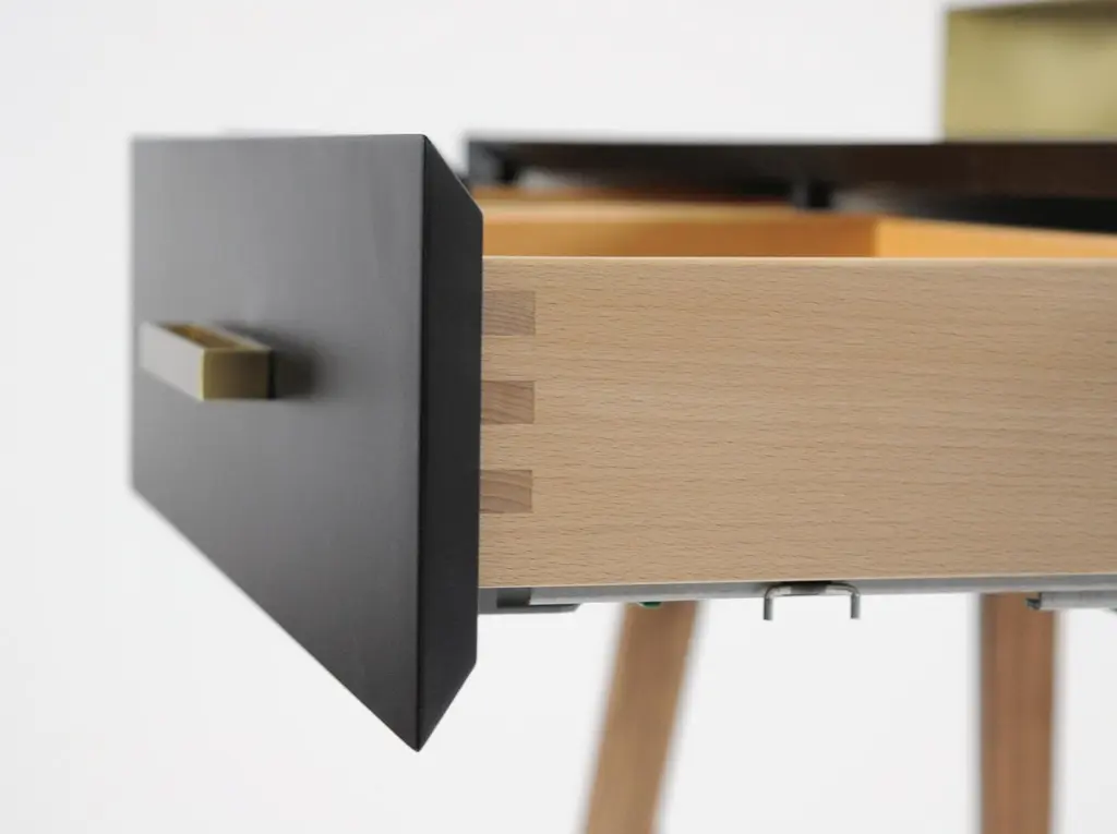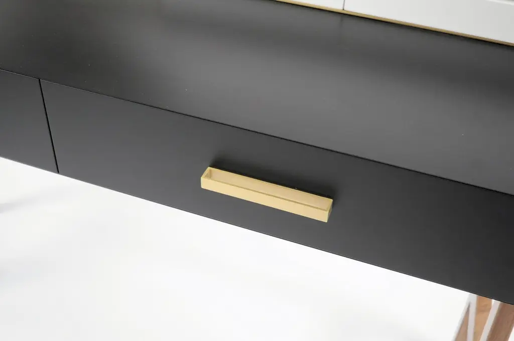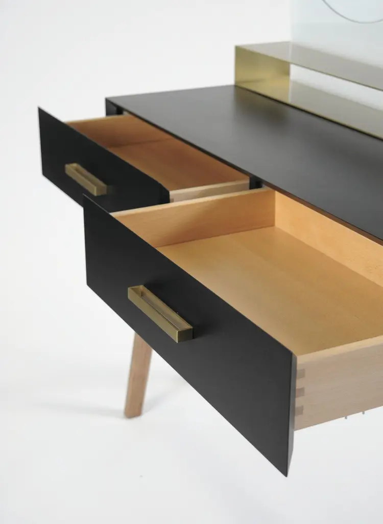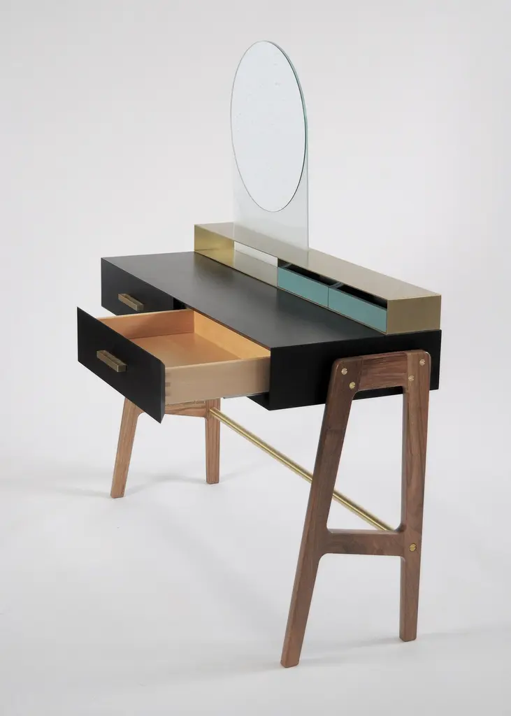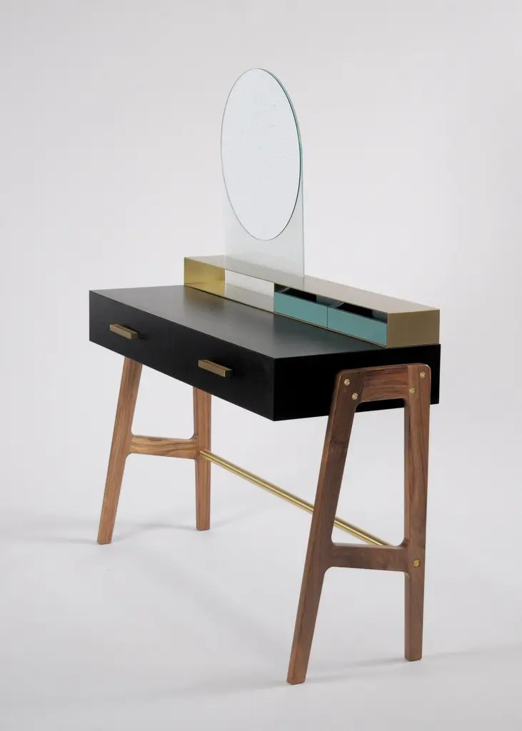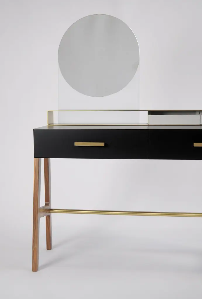 Vivian is a contemporary beauty desk, it can be used as make-up table, thanks to its light wall mirror, or as jewel case. It has simple lines and sophisticated details. A brass box contains the drawers for jewelry. Vivian is an elegant and precious complement that can easily highlight an entrance hall, a bedroom and even a bathroom, Vivian is ideal also for intimate environments such as a boutique-hotel or a private residence. A wooden foot, connected by a brass tube, becomes a structural and aesthetic element at the same time. It is made of scratch-resistant laquered wood, oas or canaletto walnut, brass and glass. Besides, it is available also in many lacquered colors. Design by Accardi Buccheri for Medulum.