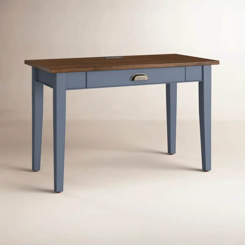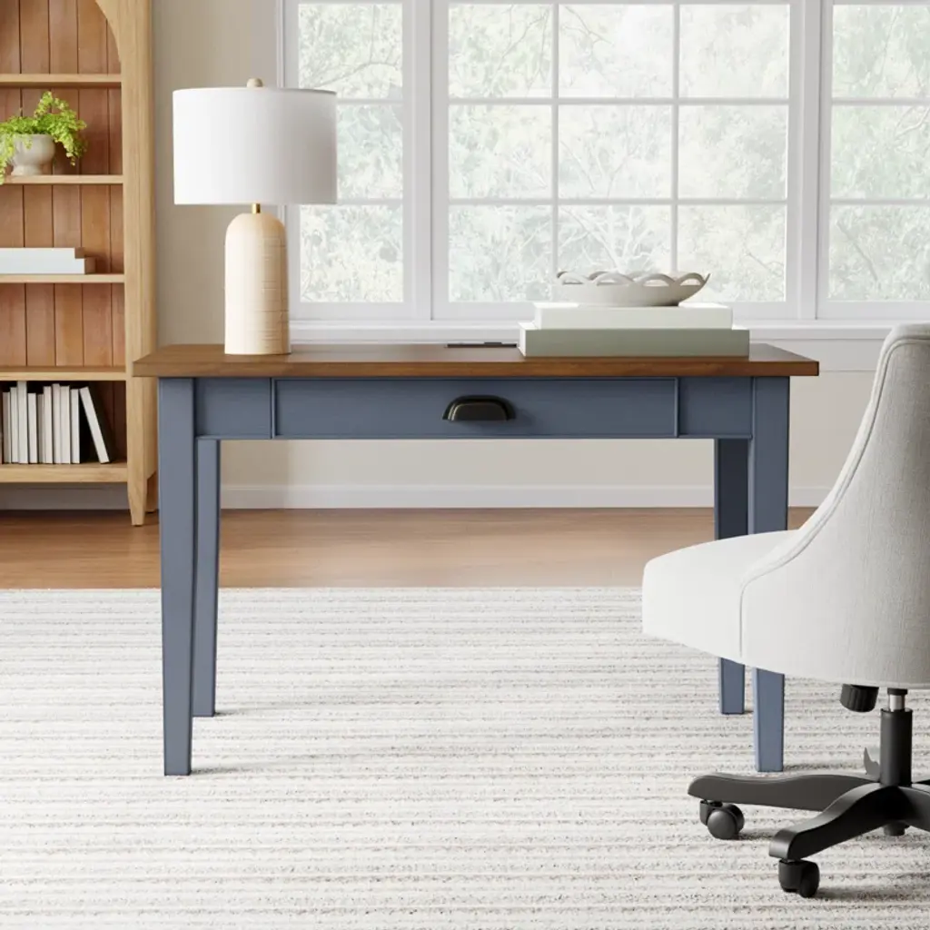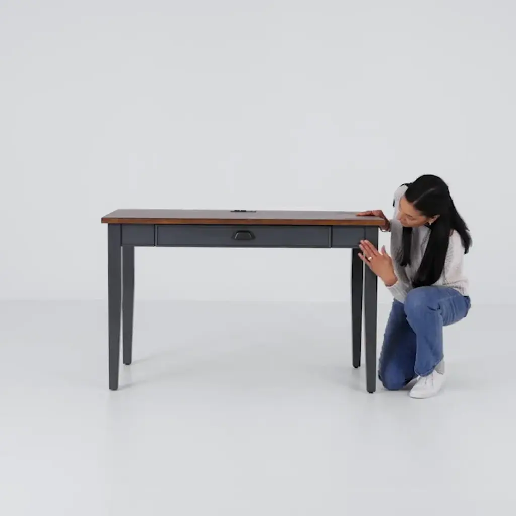 Elevate your home office with this sleek writing desk that combines form and function. Featuring a solid and engineered wood construction, this desk showcases a rectangular design with a single drawer to store your essentials. The built-in electrical outlet and integrated cable management keep your workspace clutter-free, while the natural wood grain color variation adds a touch of warmth. Please note, the desk's back is unfinished, so it's best placed against a wall. Create a cozy workspace where you can focus on your next big project or pen your next novel.
