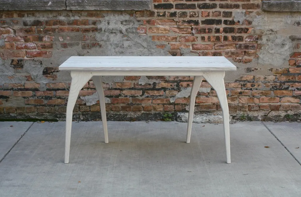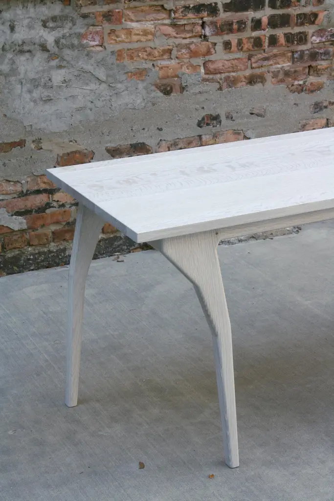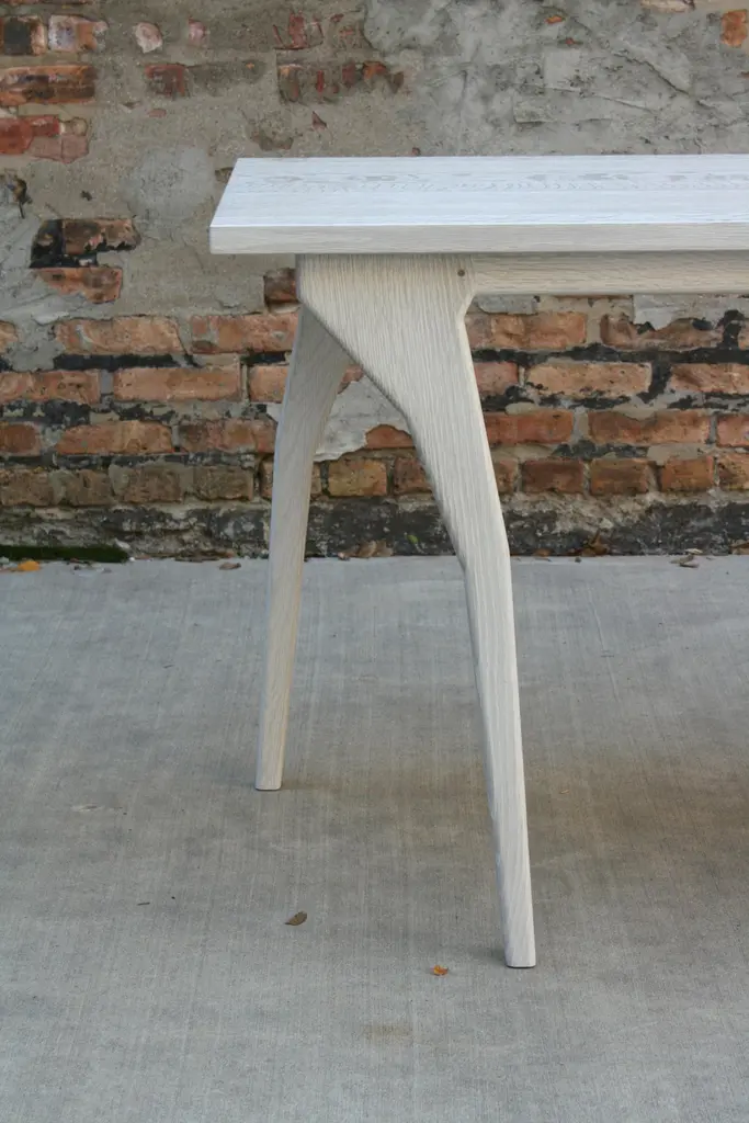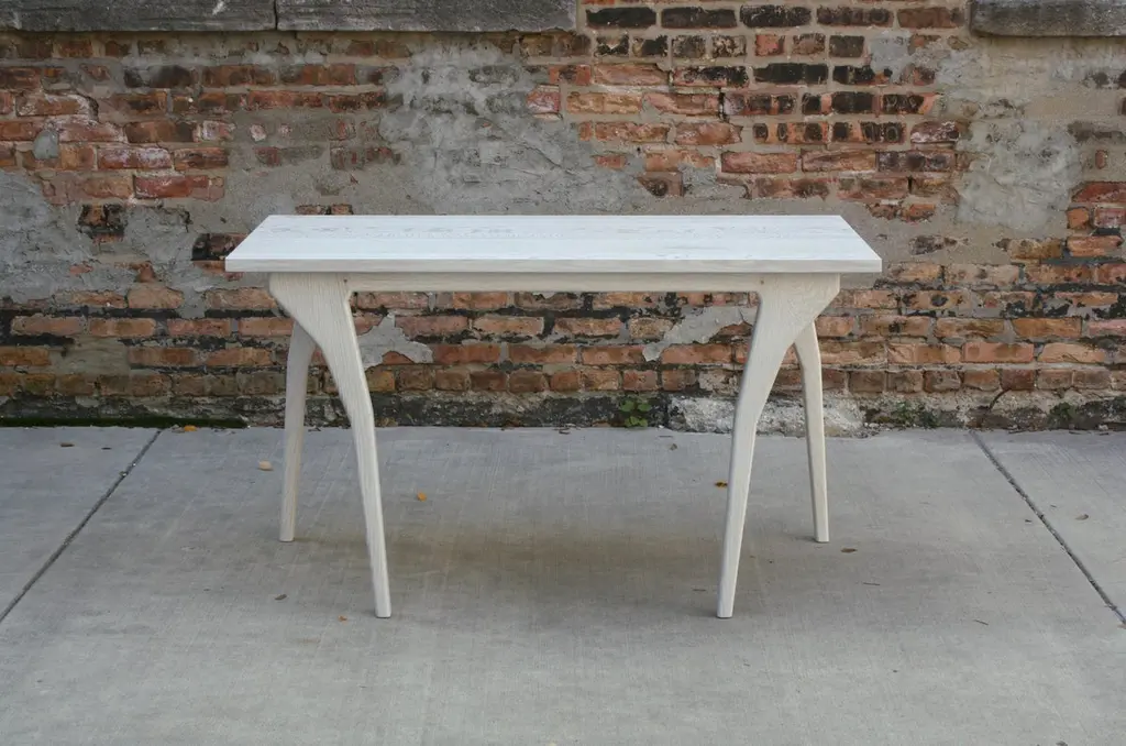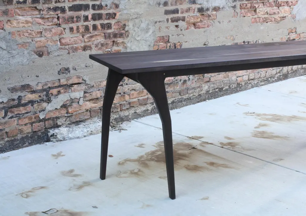 Shown in:bleached quarter-sawn white oak (50")ebonized quarter-sawn white oak (66")oxidized walnut (72")oxidized maple (66")Measures: 66-72" wide x 29-31" tall x 21-24" deepThe Walking table functions as a desk or console table whose proportion is modeled after anatomy. Its slender yet strong structure is built from solid wood using traditional joinery. Each piece is handmade and dated by Sam and Lydia in their Chicago studio.Available in custom finishes and dimensions with optional drawers.