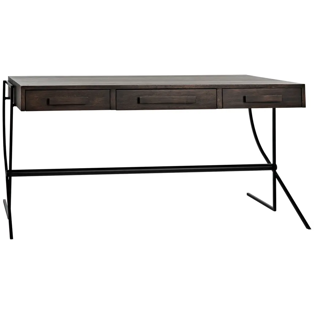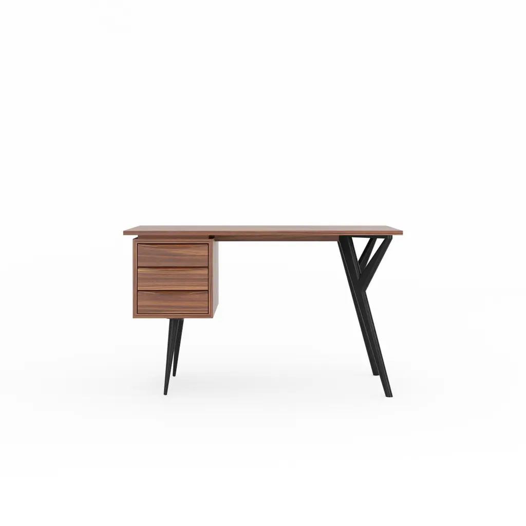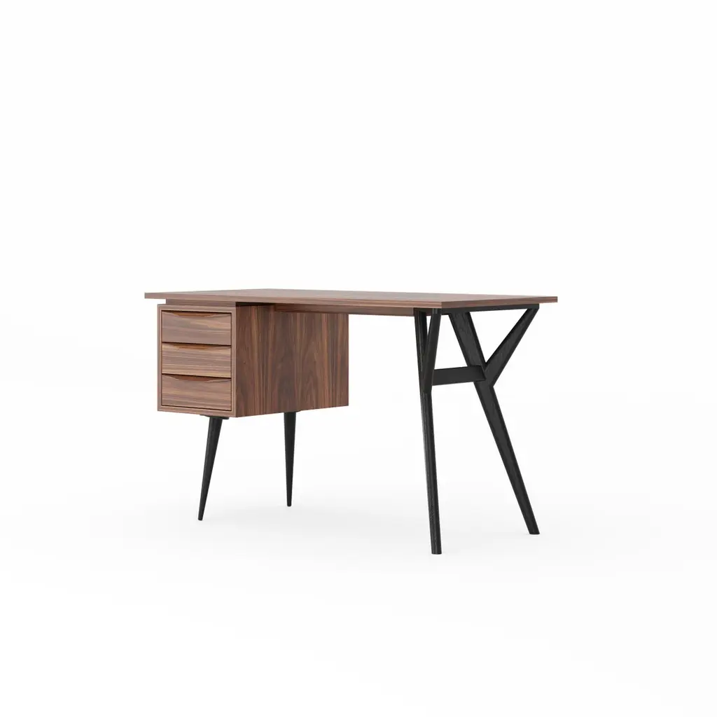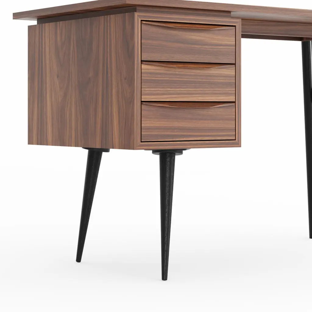 Walnut office desk in mid century style with organic shape black legs and three drawers. Perfect as an office desk, study desk, writing desk, computer desk.Three drawers guarantee a large amount of storage space. High quality desk made of wood covered with natural walnut veneer and solid walnut wood.Handmade in Poland.Dimensions:width: 125 cm (~49,2'')depth: 60 cm (~23,6'')height: 75 cm (~29,5'')Material used:top, sides, back, drawers front: blockboard overlaid with natural American walnut veneerdrawers body: solid oaklegs: solid oak lacquered blackhandles: solid american walnutWood finishing: high quality semi-matte varnish.You can change the size, material, surface treatment after prior contact and setting prices.