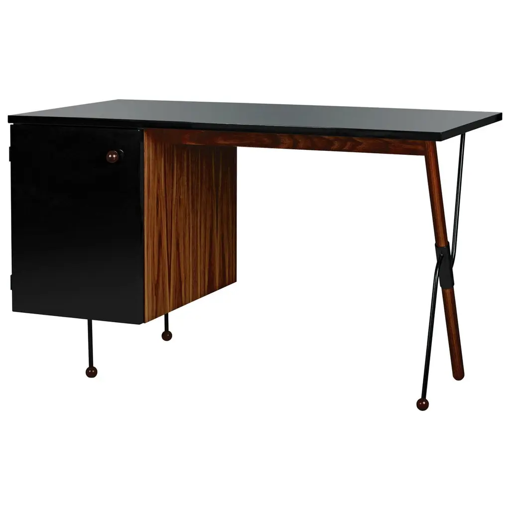 Walnut Office Desk With Organic Shape Legs And Drawers, Mid Century Modern Style