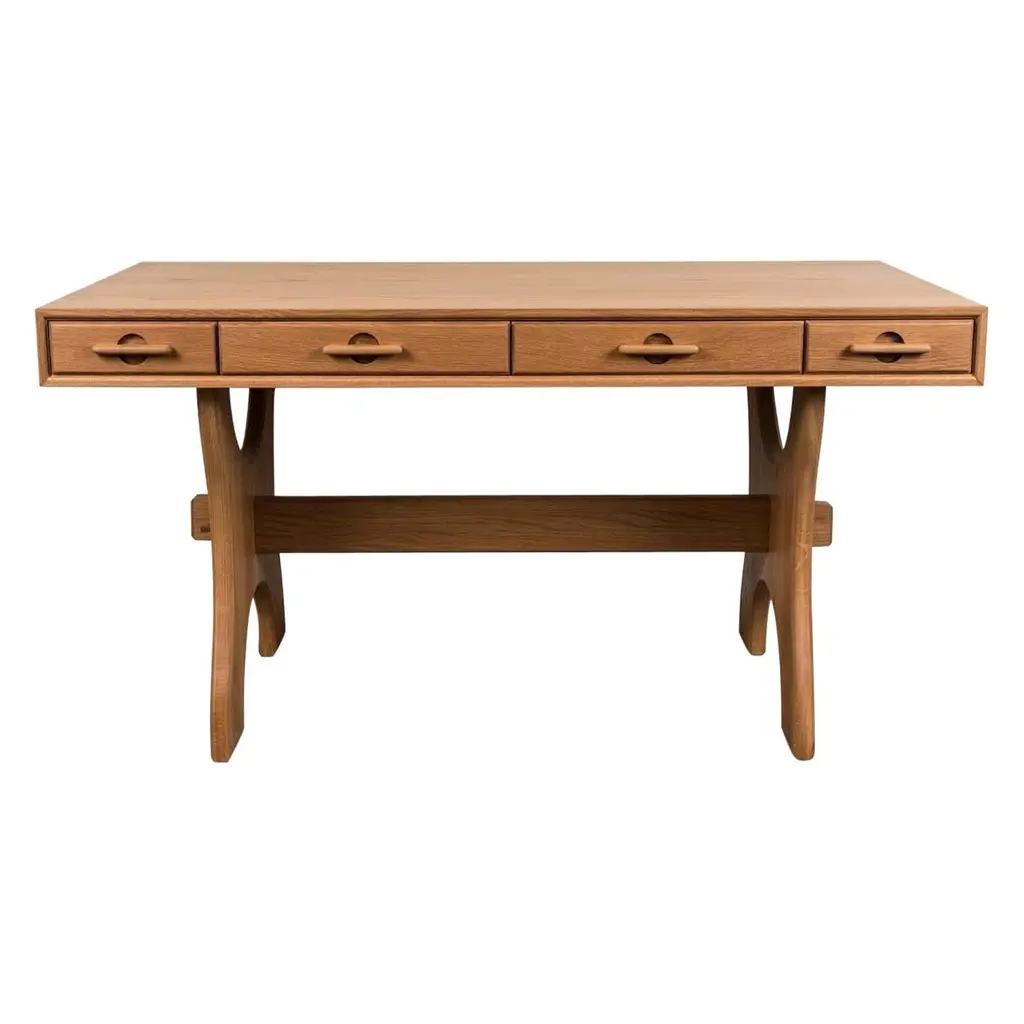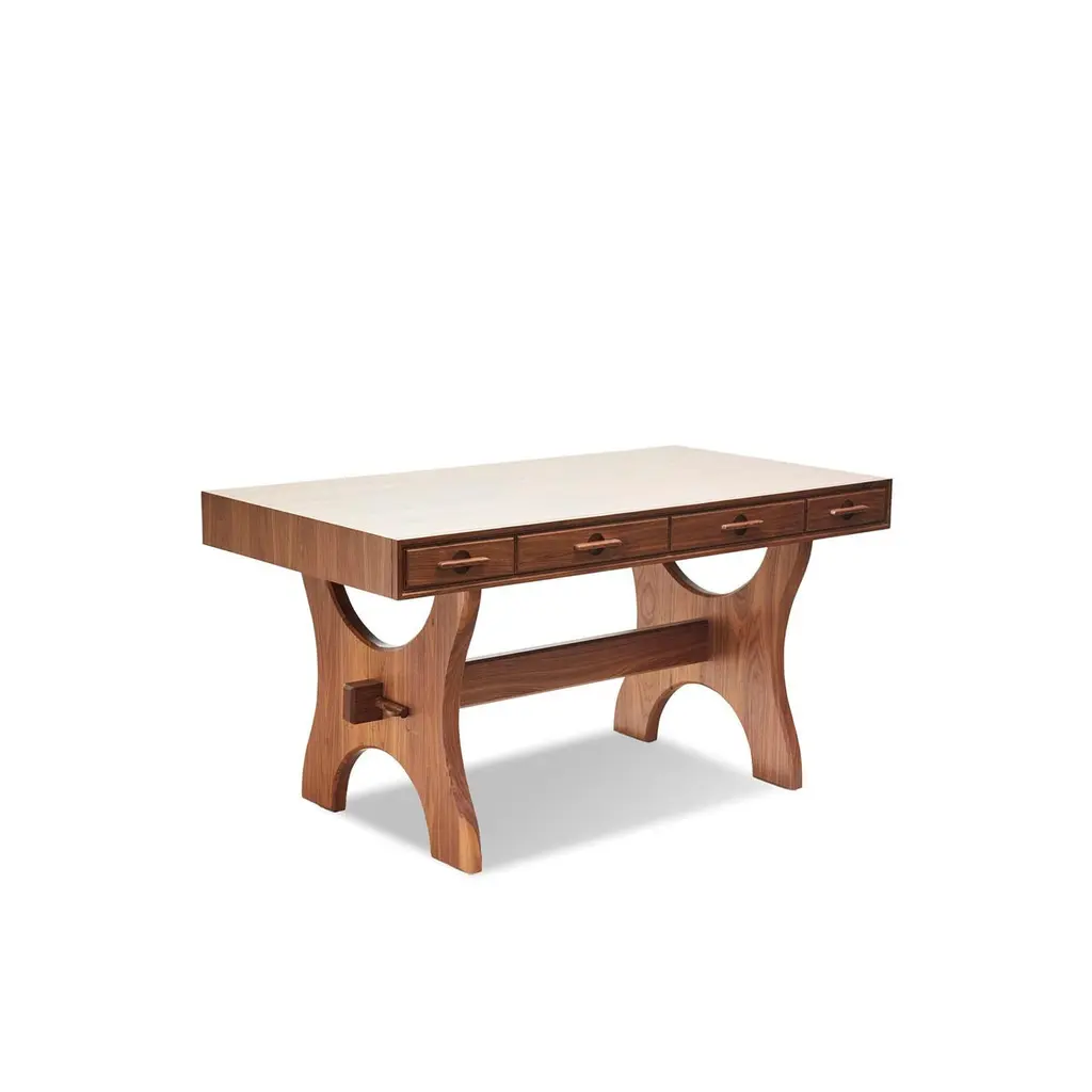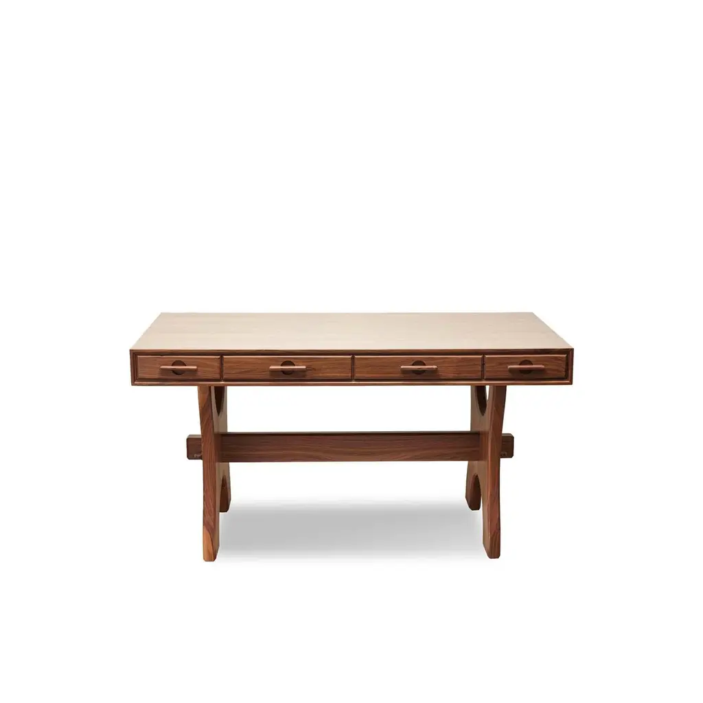 The Ojai desk has four drawers and features solid American walnut or white oak trestle legs. The drawer handles are made of solid carved wood. Shown here in Natural Walnut. The Lawson-Fenning Collection is designed and handmade in Los Angeles, California. Reach out to discover what options are currently in stock.