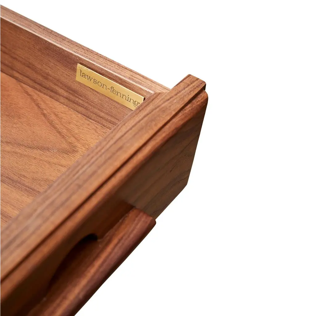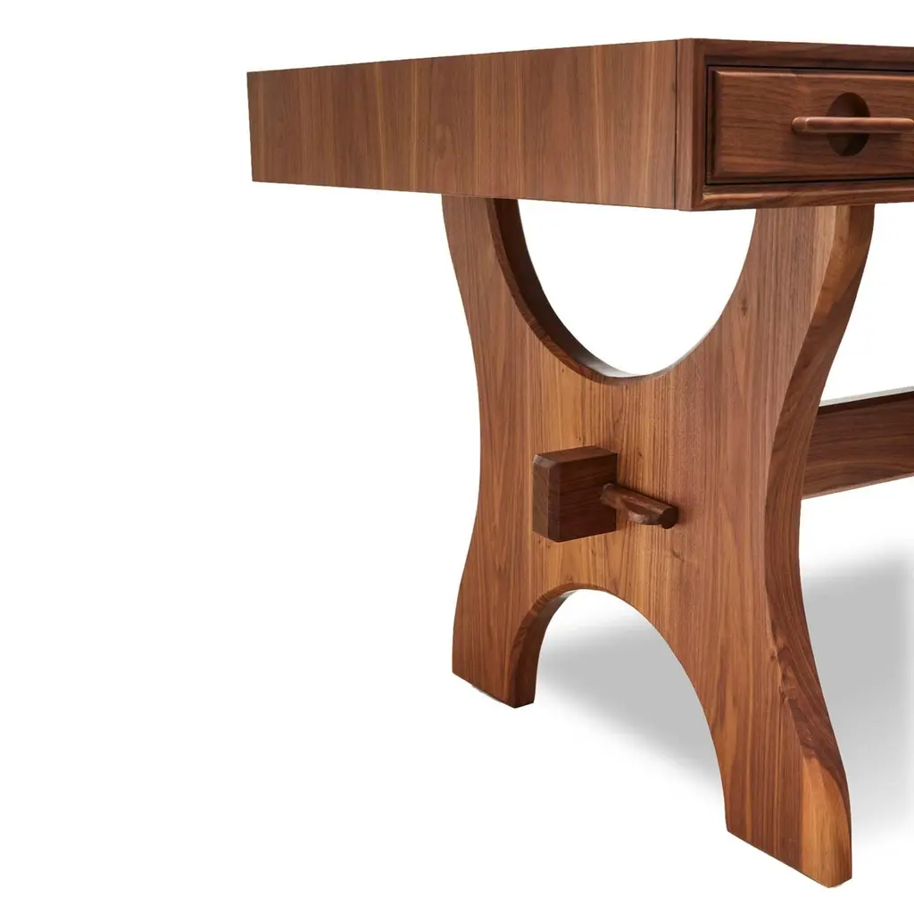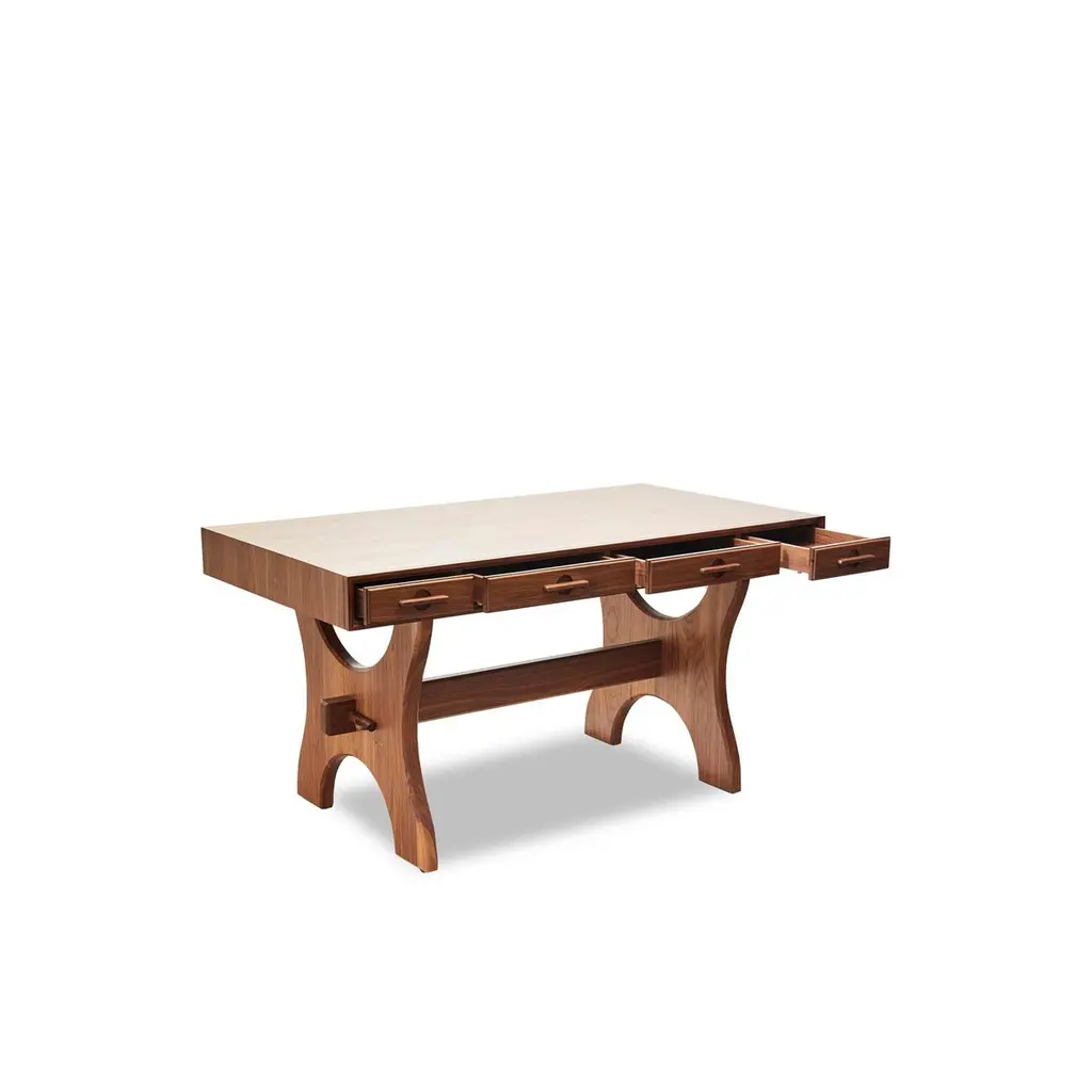The Ojai desk has four drawers and features solid American walnut or white oak trestle legs. The drawer handles are made of solid carved wood. Shown here in Natural Walnut. The Lawson-Fenning Collection is designed and handmade in Los Angeles, California. Reach out to discover what options are currently in stock.