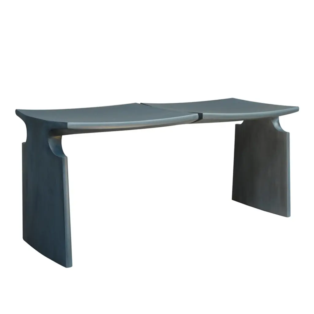 This sculptural desk is a sublime multi-functional piece that combines straight lines and intriguing curves in a design that will be the focal point of a modern study or an elegant office. The pama wood top bends along a smooth curve to create one of the legs, while the other leg is a wave in dark sycamore that encloses a drawer. The top under the opposite side is equipped with extra storage drawers in the same dark sycamore.