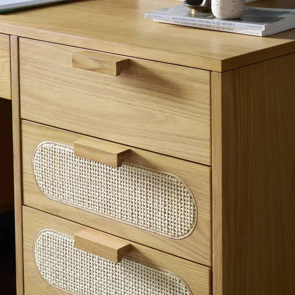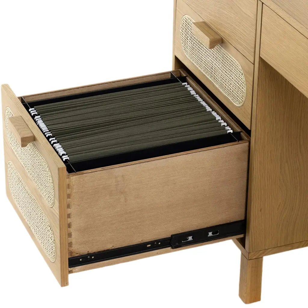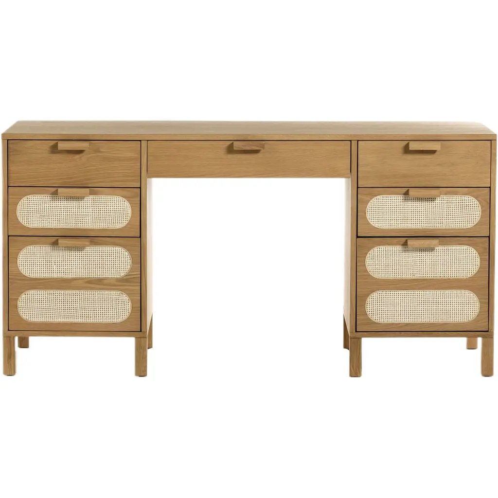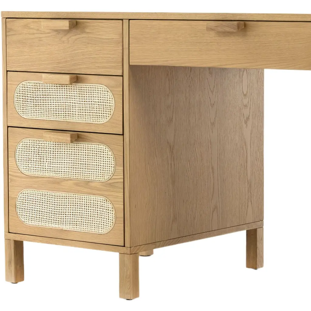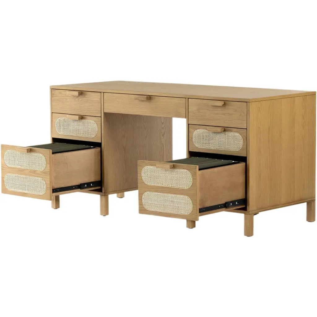 Oak is a favorite not only for its strength and resistance to scratching but also for its distinctive grain. Here it's paired with wood-backed pill-shape inserts of woven cane on four of the desk's seven drawers. The bottom side drawers are large enough to accommodate hanging folders. The back of the desk is finished so that you can float it in a room.