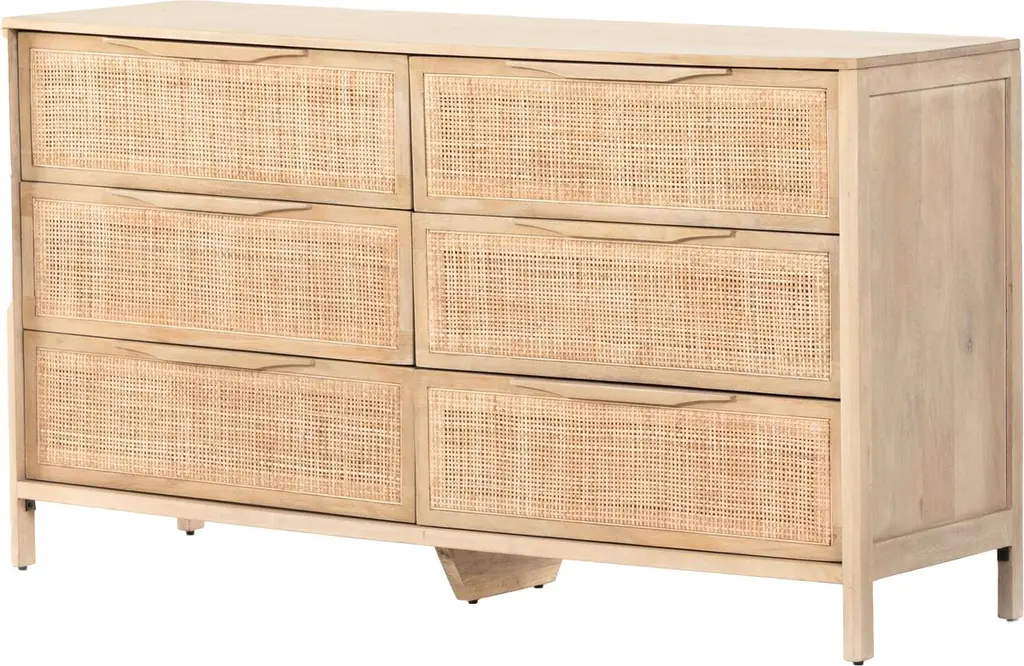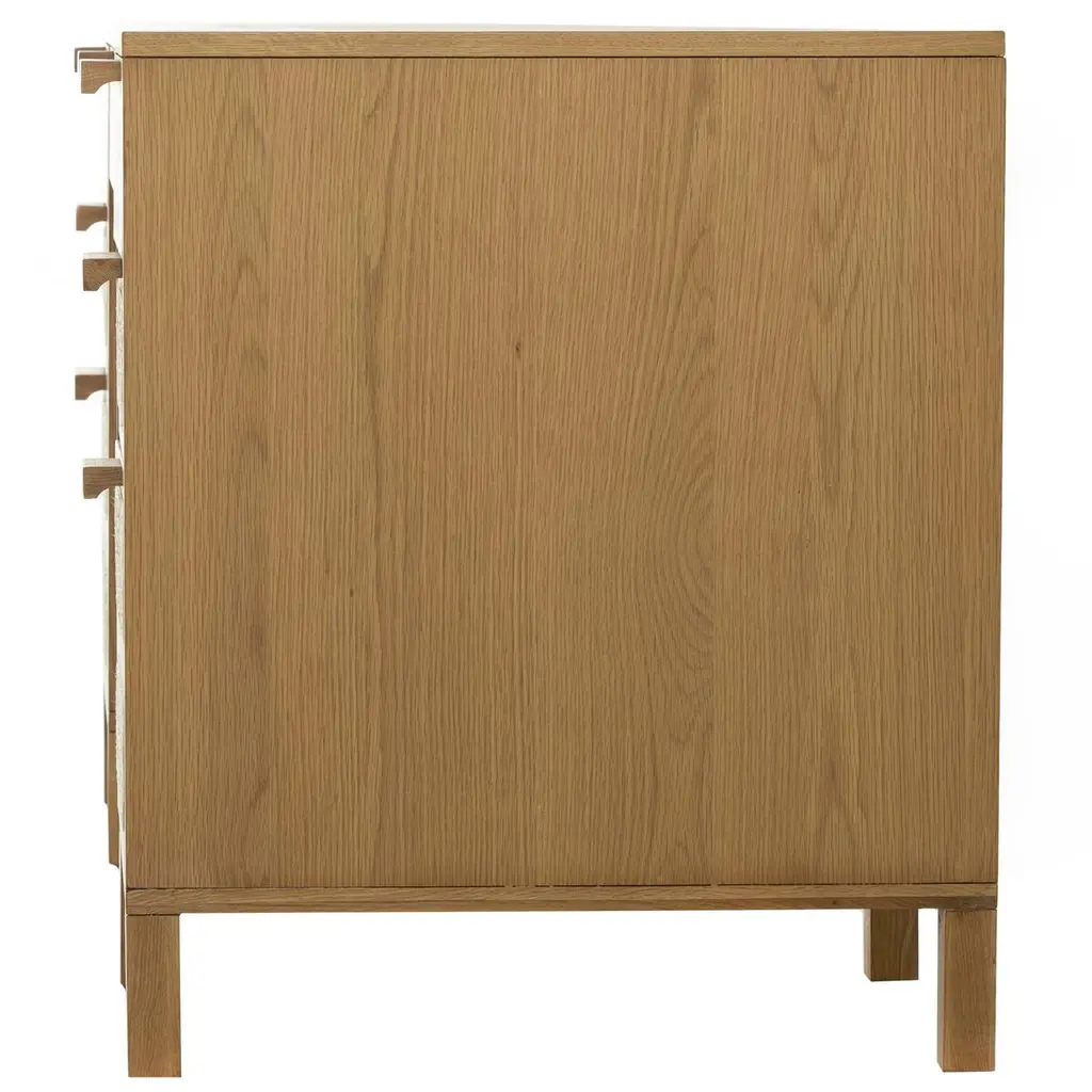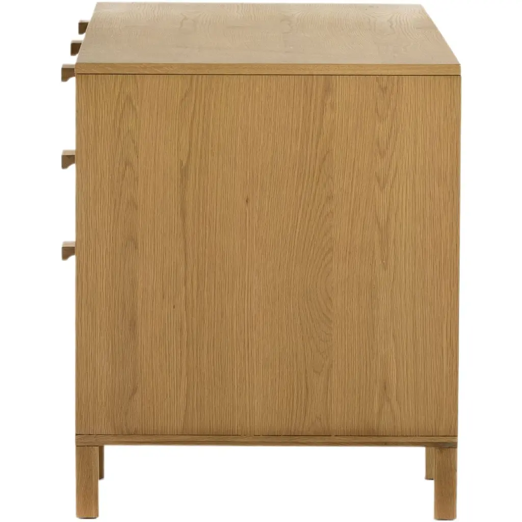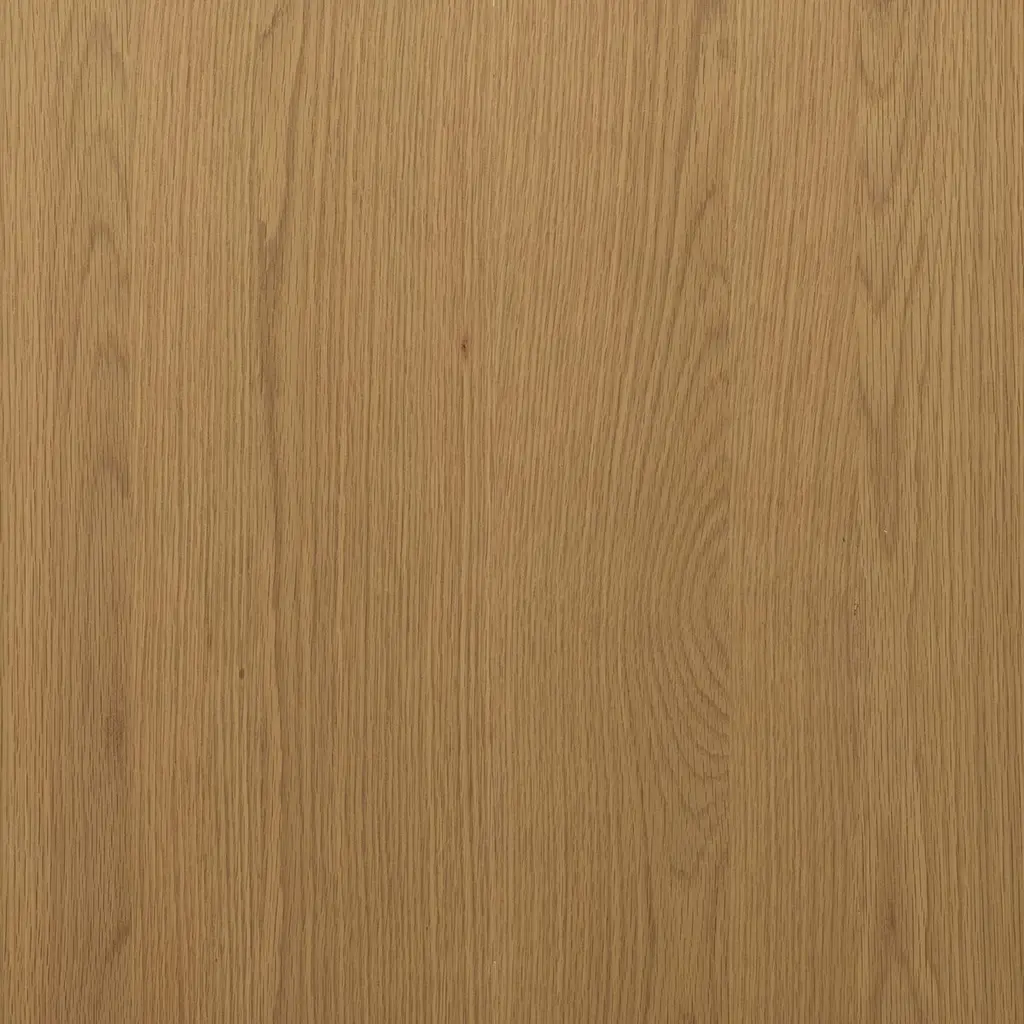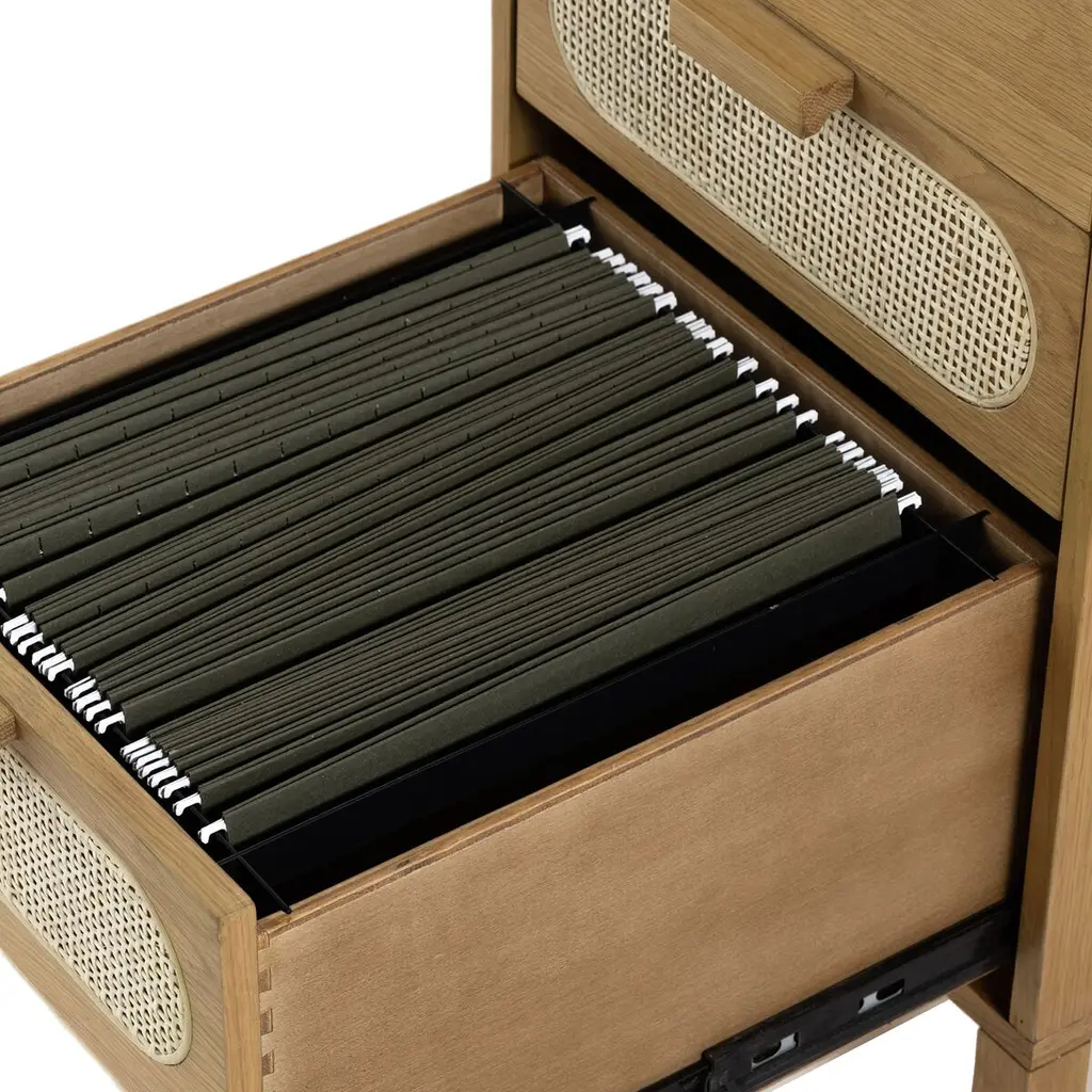 Oak is a favorite not only for its strength and resistance to scratching but also for its distinctive grain. Here it's paired with wood-backed pill-shape inserts of woven cane on four of the desk's seven drawers. The bottom side drawers are large enough to accommodate hanging folders. The back of the desk is finished so that you can float it in a room.