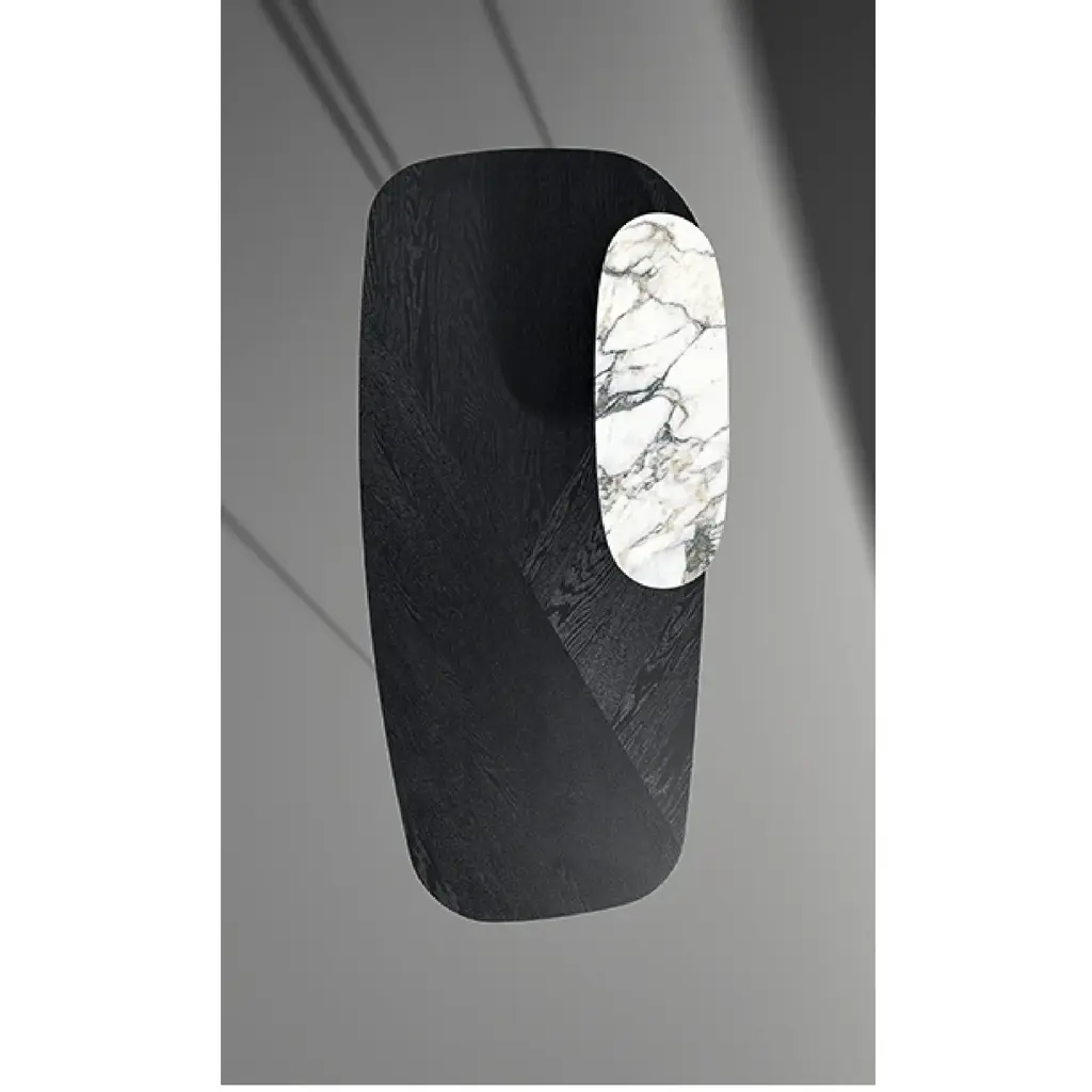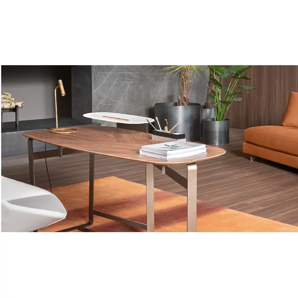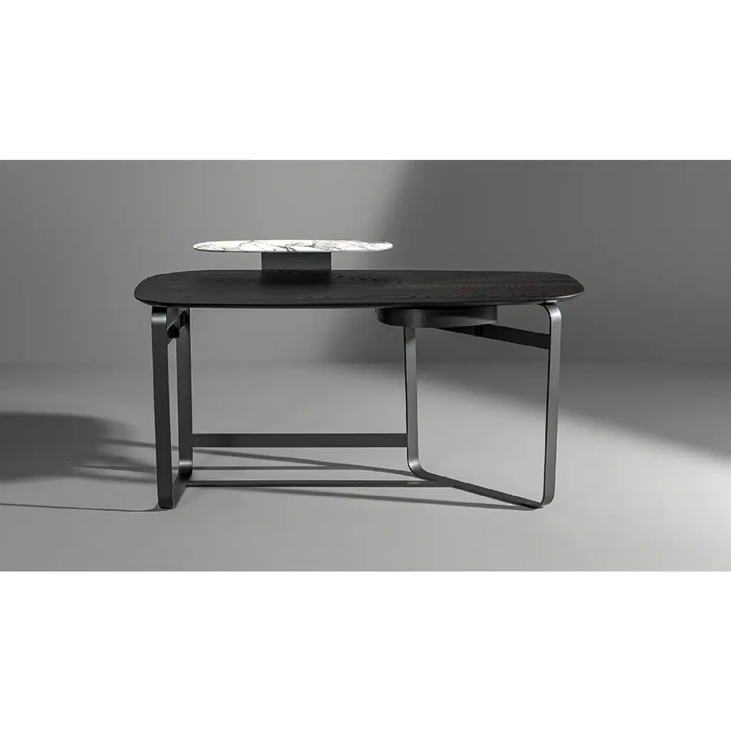 The Gauss modern wood writing desk features a curved, fluid top with no sharp edges, much like the legs, which take on the appearance of metal rings with rounded corners. The distinguishing feature of Gauss is the raised section, which creates a second level for the desk. In addition to the main desk top in wood, Gauss also offers a practical “floating" shelf made from ceramics, which is attached to the main desk via two metal bars. Gauss's other unique detail is the shape of the legs, which stand in a dynamic, asymmetrical position, creating an irregular structure which lends a youthful, casual quality to the desk. In addition, the veining in the wood of the desk top adds dynamism, increasing the desk's aesthetic impact. One possibility for customization is the addition of a concealed round drawer in painted metal.