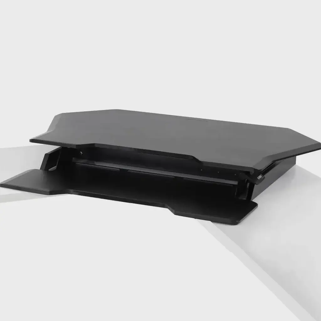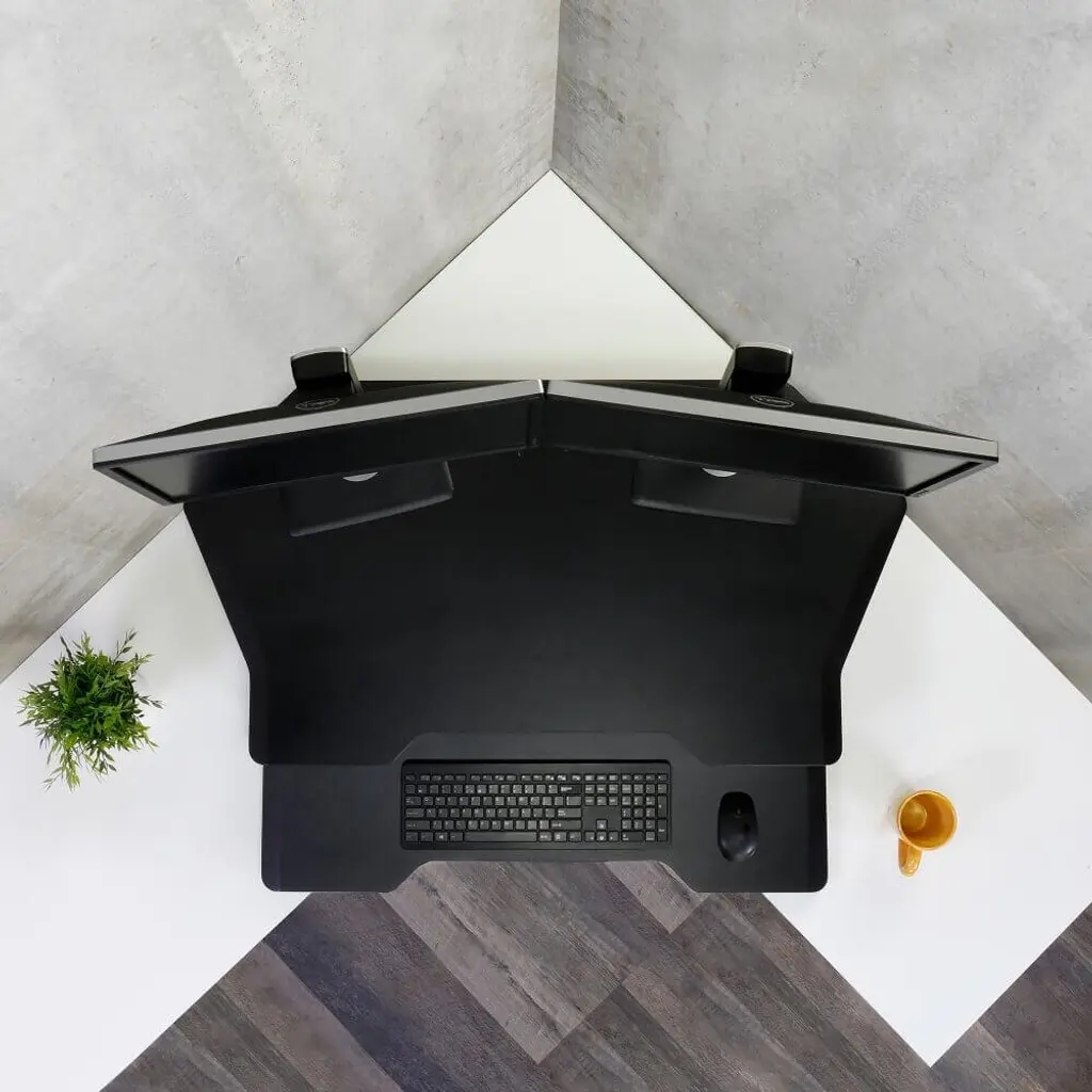 Turn any unused corner space into a productive right-angle power play that lets you stand to work whenever you want. Fits two large monitors plus a large keyboard Easy to adjust No cranks or motors