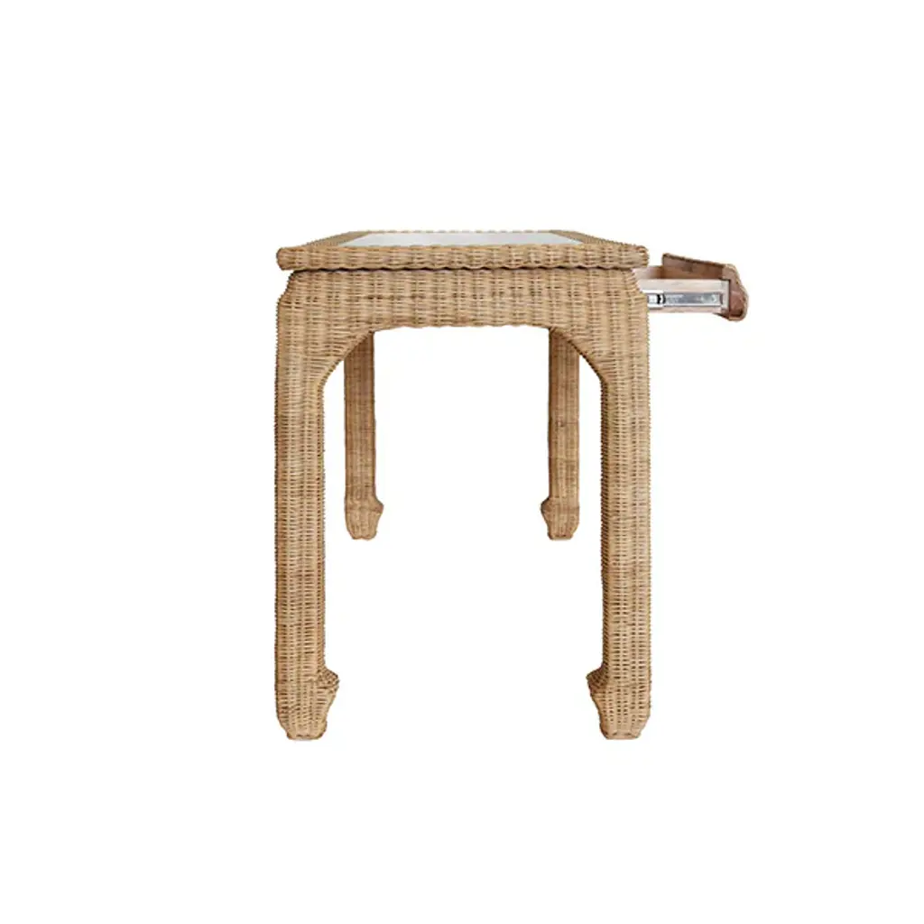 The Verra desk showcases a sleek silhouette that is reminiscent of classic Ming design. Crafted from the finest woven rattan and protected by inset glass on the top, each strand is carefully intertwined by hand. Featuring a single, sleek drawer, the utilization of storage space adds a functional touch while preserving the Verra’s minimalist charm. Add a hint of classic design to your office with the Verra!