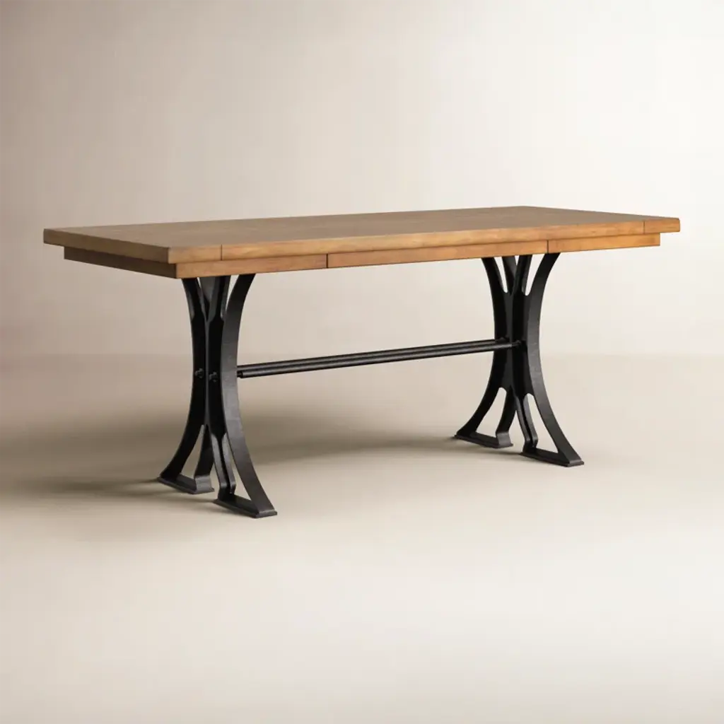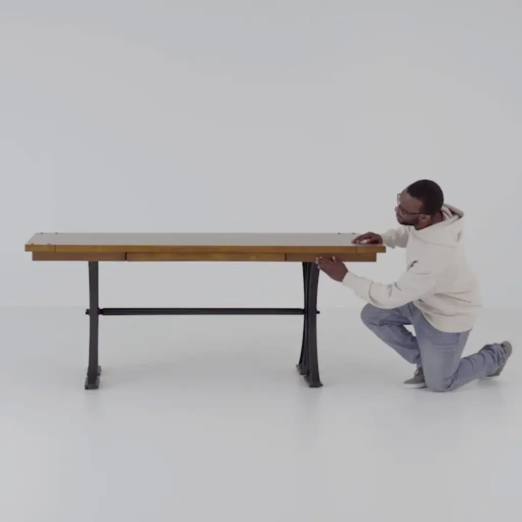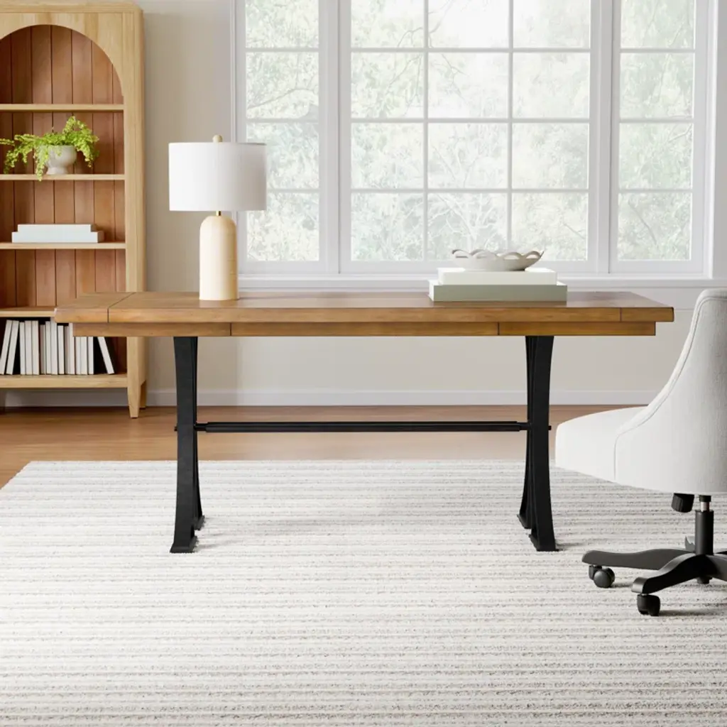 Elevate your home office with this writing desk, where form meets function in a sleek and stylish way. The solid and engineered wood top showcases a natural wood grain finish, while the metal trestle base adds an industrial touch. With a finished back, this desk looks great in any room. The built-in drawer offers convenient storage for your essentials, and it glides smoothly on metal tracks. Rated for a weight capacity of 150 lbs, this desk is ready for your work-from-home setup or creative endeavors.