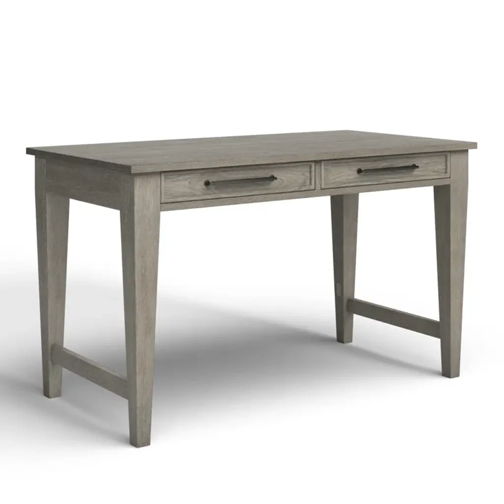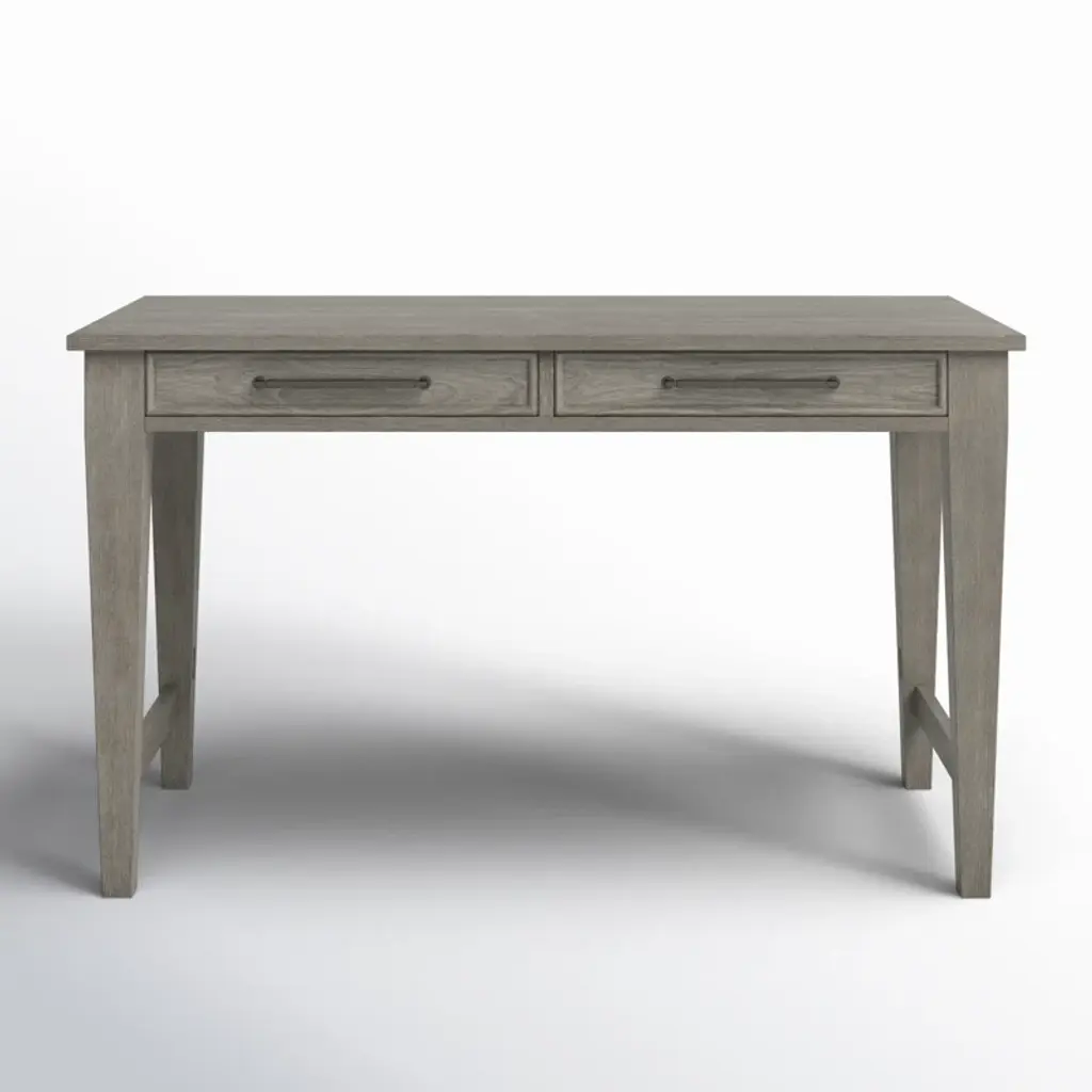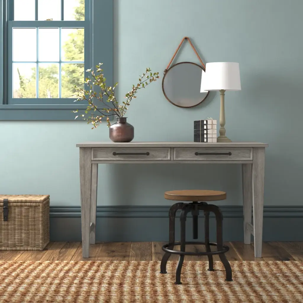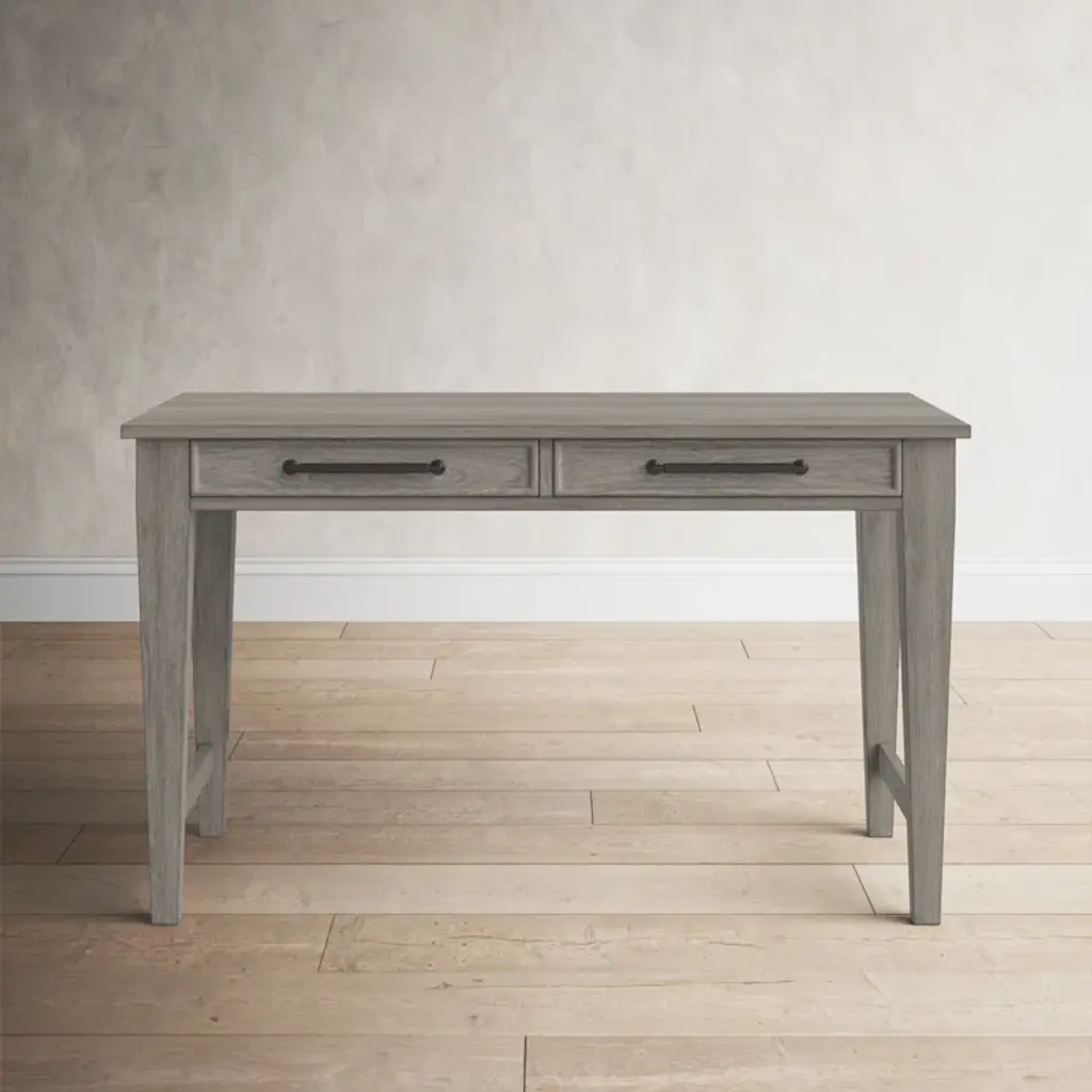 A natural fit for a home that embraces transitional, rustic decor, our Alcone 2 drawer desk creates a comfortable feeling, especially in small areas. This desk offers a spacious top surface that provides all the room you need for desk essentials like your laptop, pens, and your favorite drinking mug, while desk drawers open and close on smooth metal guides for easy access storage of miscellaneous office items. The wire-brushed grey finish ensures this piece seamlessly accents any home office's color scheme, making it the perfect addition to any home office or workspace.