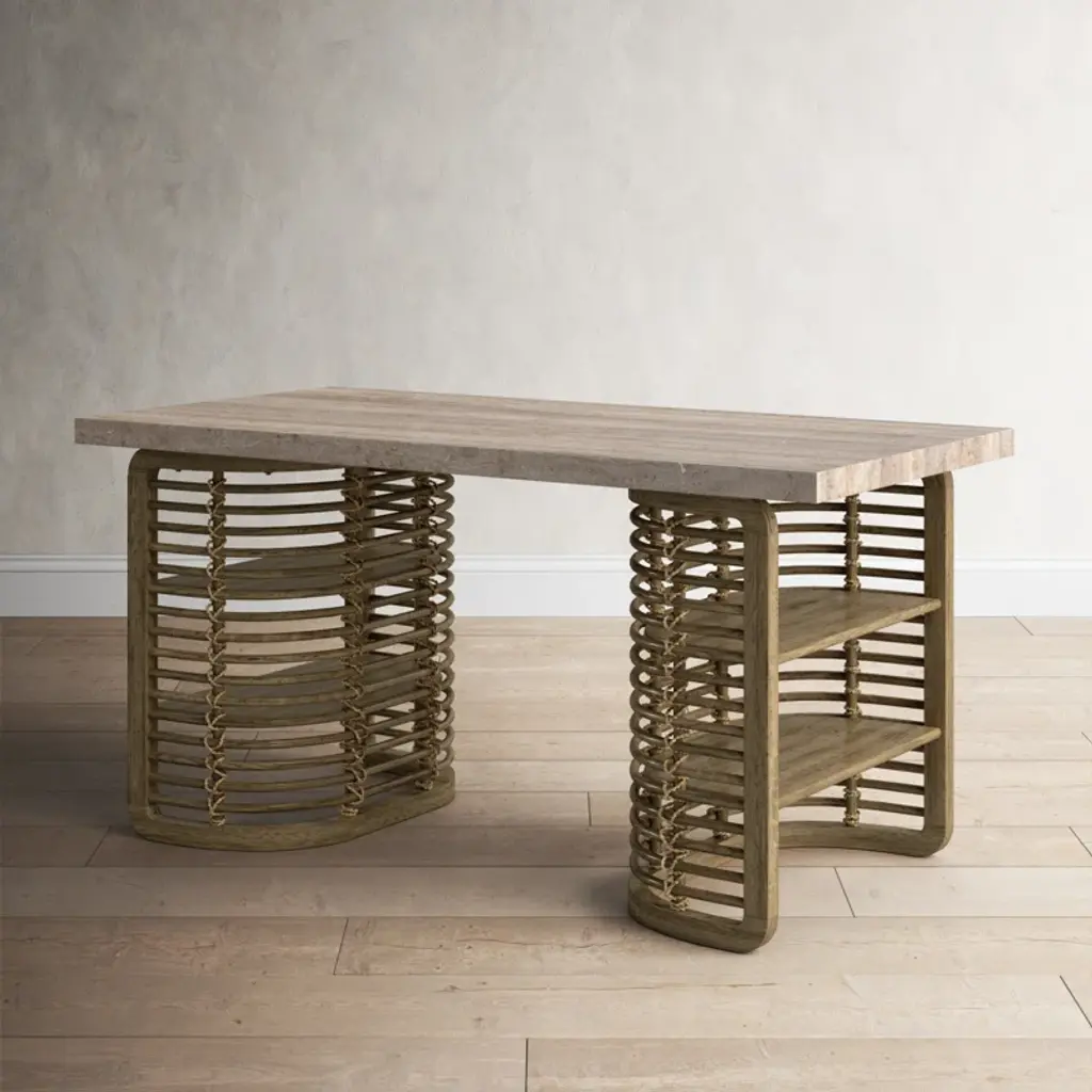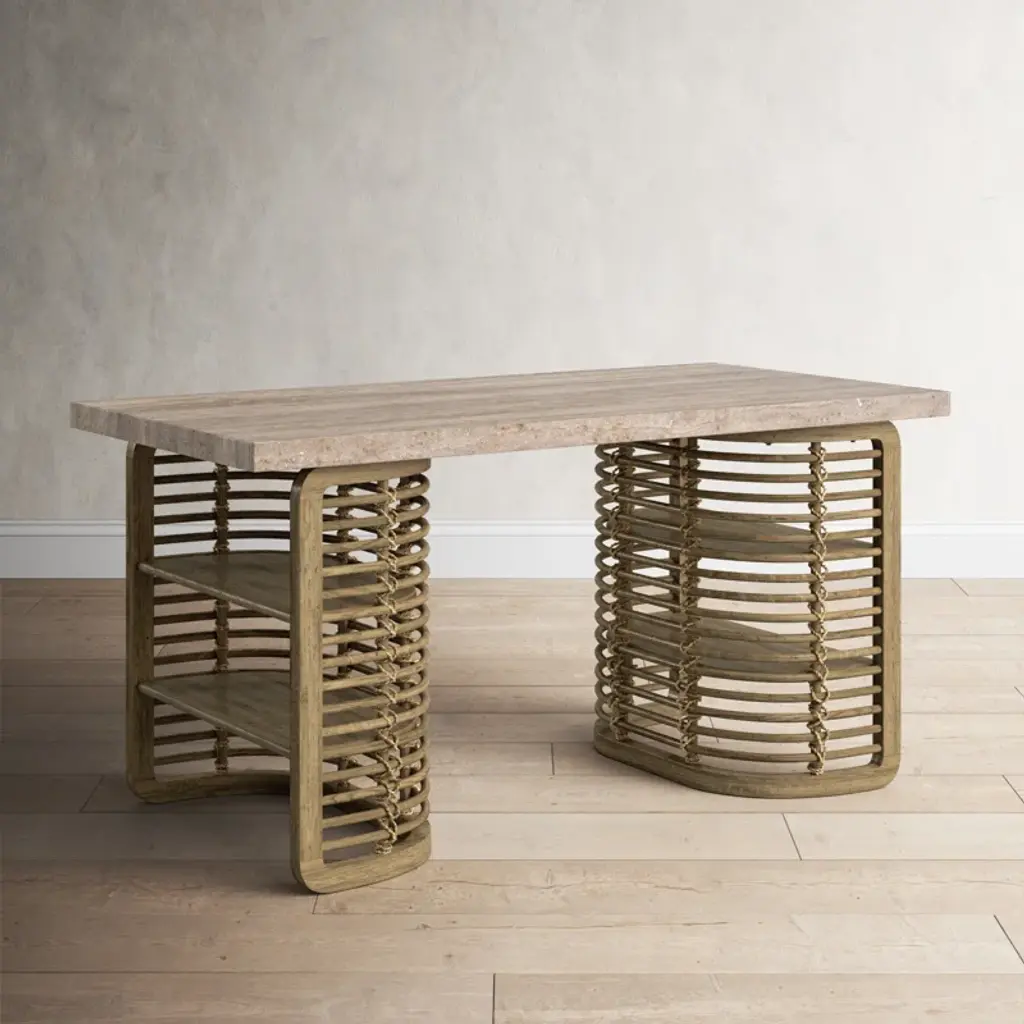 Upgrade your home office with this double pedestal writing desk, boasting a blend of rustic charm and modern functionality. The stone veneer top adds a touch of sophistication, while the solid and engineered wood base showcases natural wood grain color variations for a truly unique piece. Four exterior shelves offer ample storage space for your books, supplies, and decor. This desk is designed with a kiln-dried wood frame and dowel joint construction, ensuring it's a reliable choice for your workspace. So, get ready to tackle your to-do list in style!