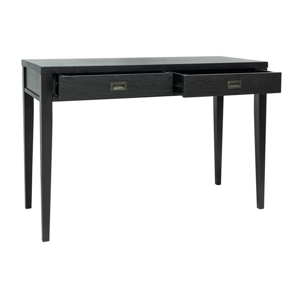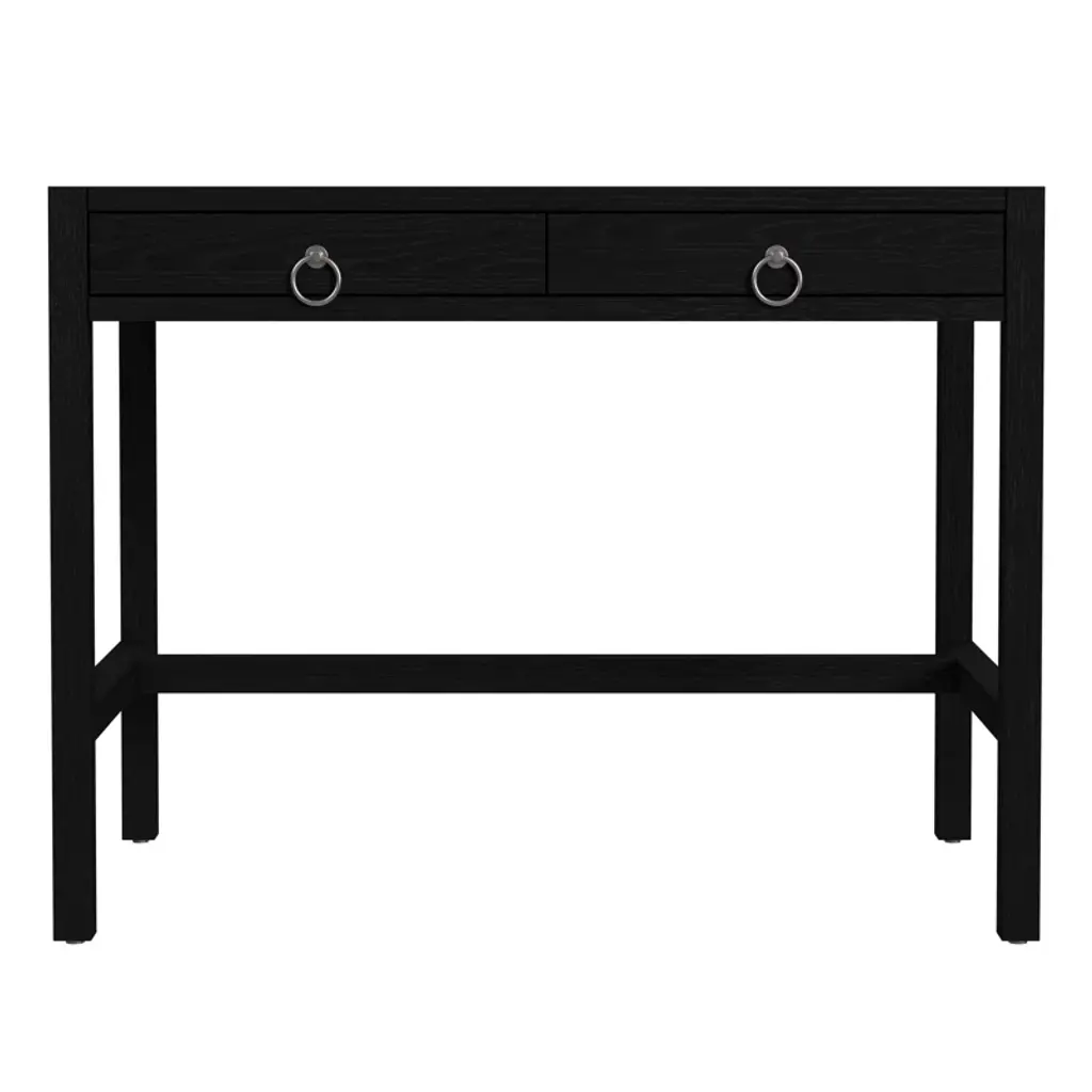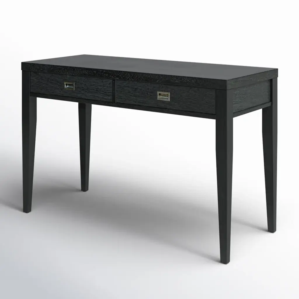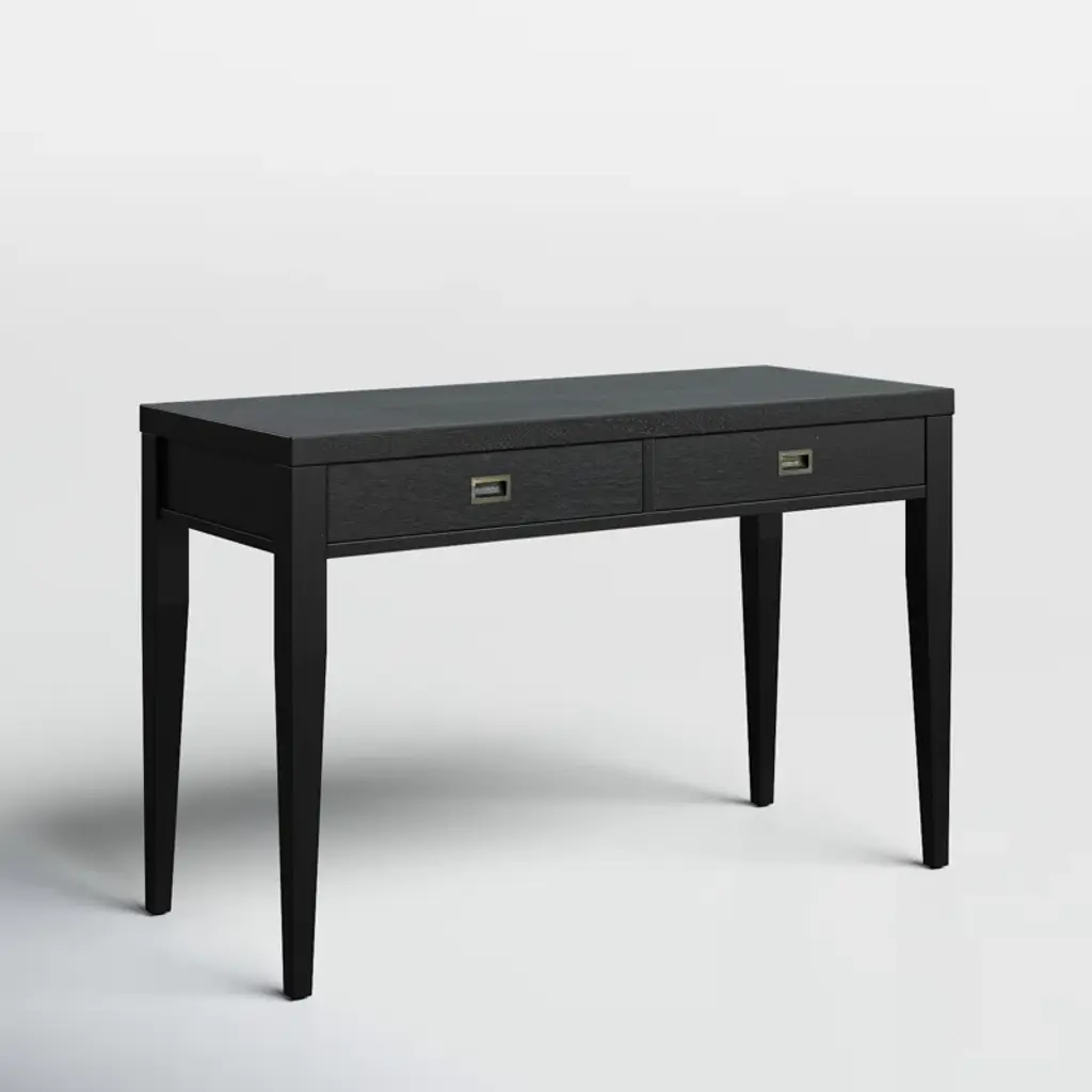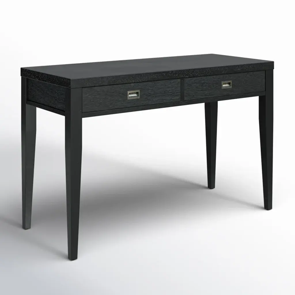 Is your spare space starting to feel stale? Give your office a modern makeover with this clean-lined writing desk. This piece has a neutral finish that’s versatile enough to complement any color palette. Two drawers on wooden glides provide a place for papers, pens, and other essential supplies, while recessed metal pulls on the front create contrast. Plus, its spacious surface top is perfect for a laptop and lamp.