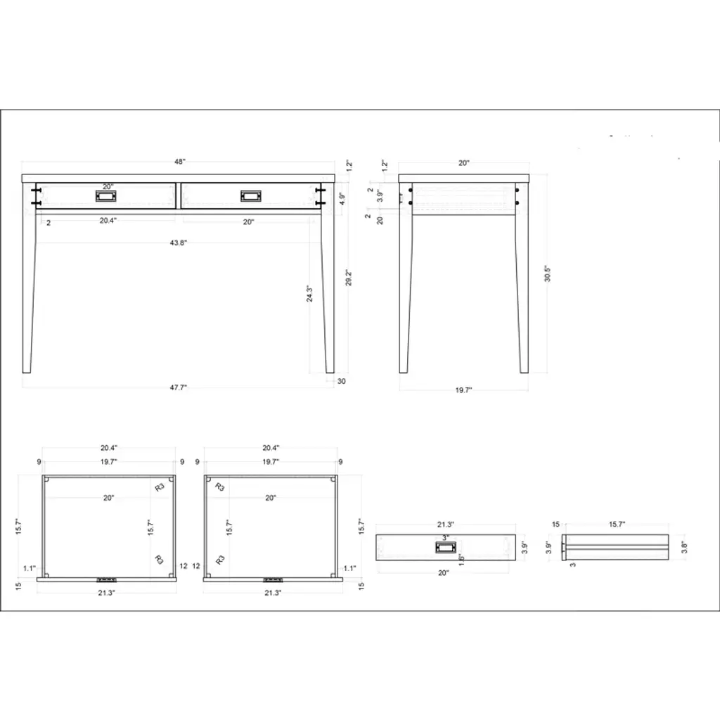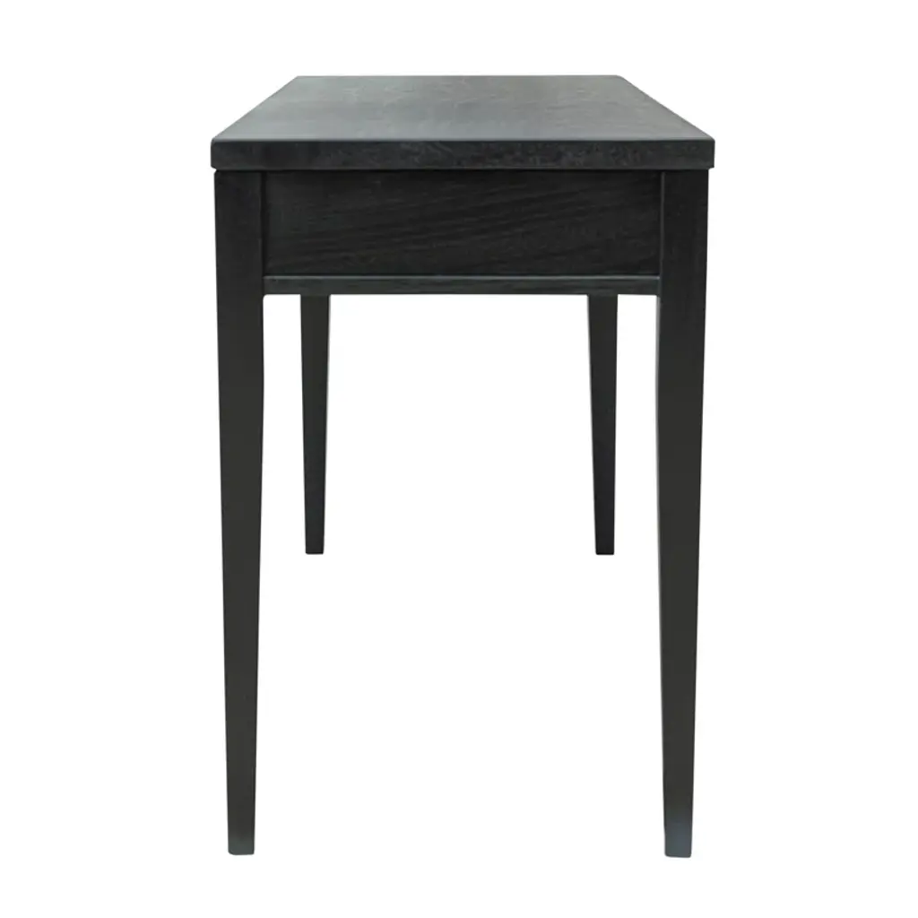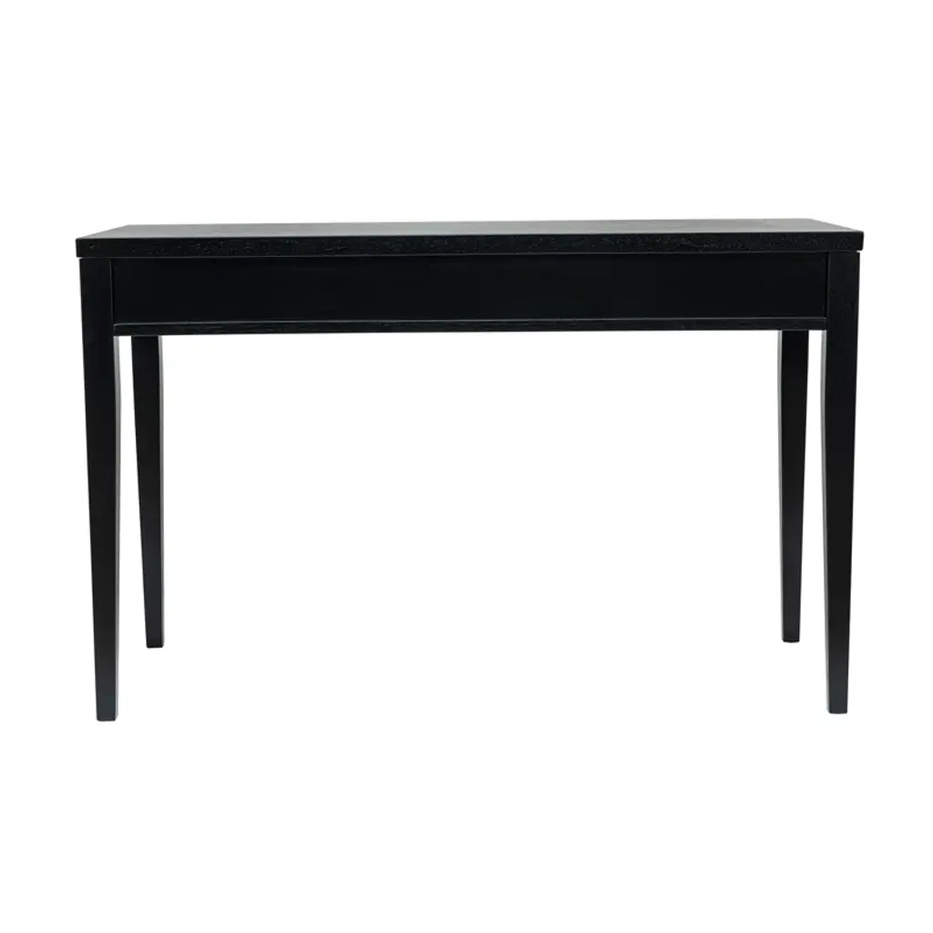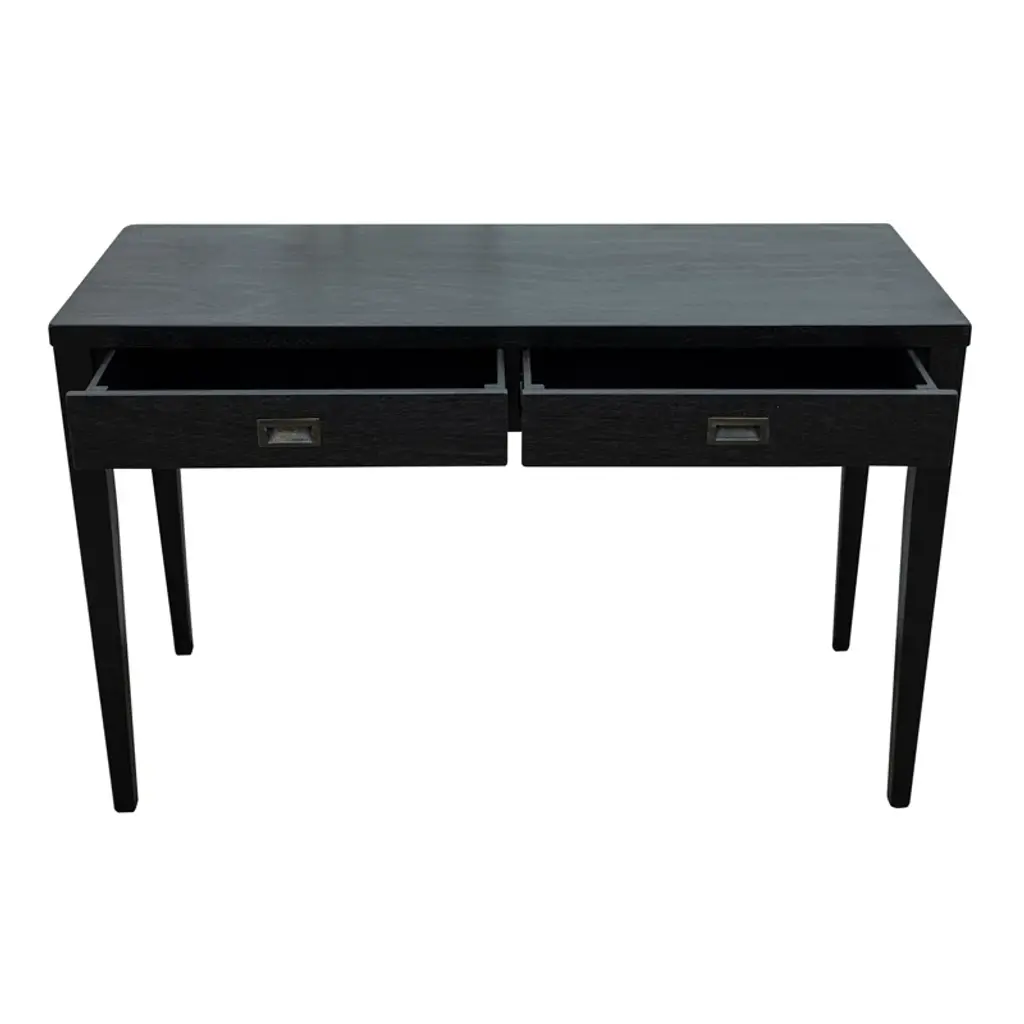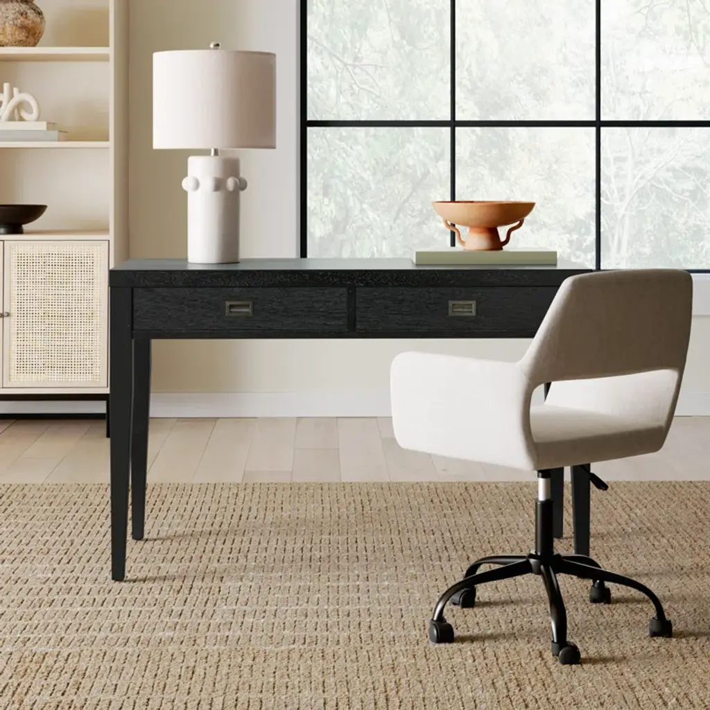 Is your spare space starting to feel stale? Give your office a modern makeover with this clean-lined writing desk. This piece has a neutral finish that’s versatile enough to complement any color palette. Two drawers on wooden glides provide a place for papers, pens, and other essential supplies, while recessed metal pulls on the front create contrast. Plus, its spacious surface top is perfect for a laptop and lamp.