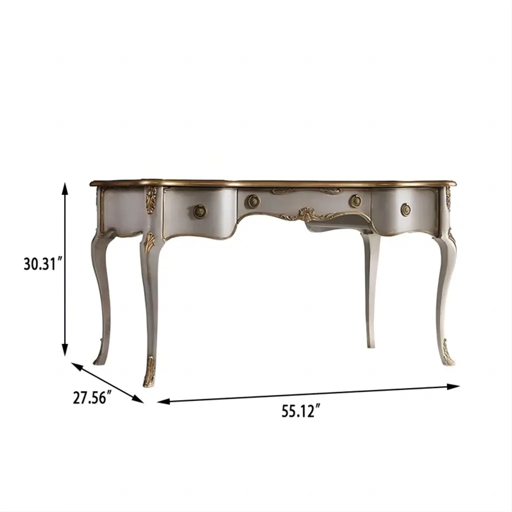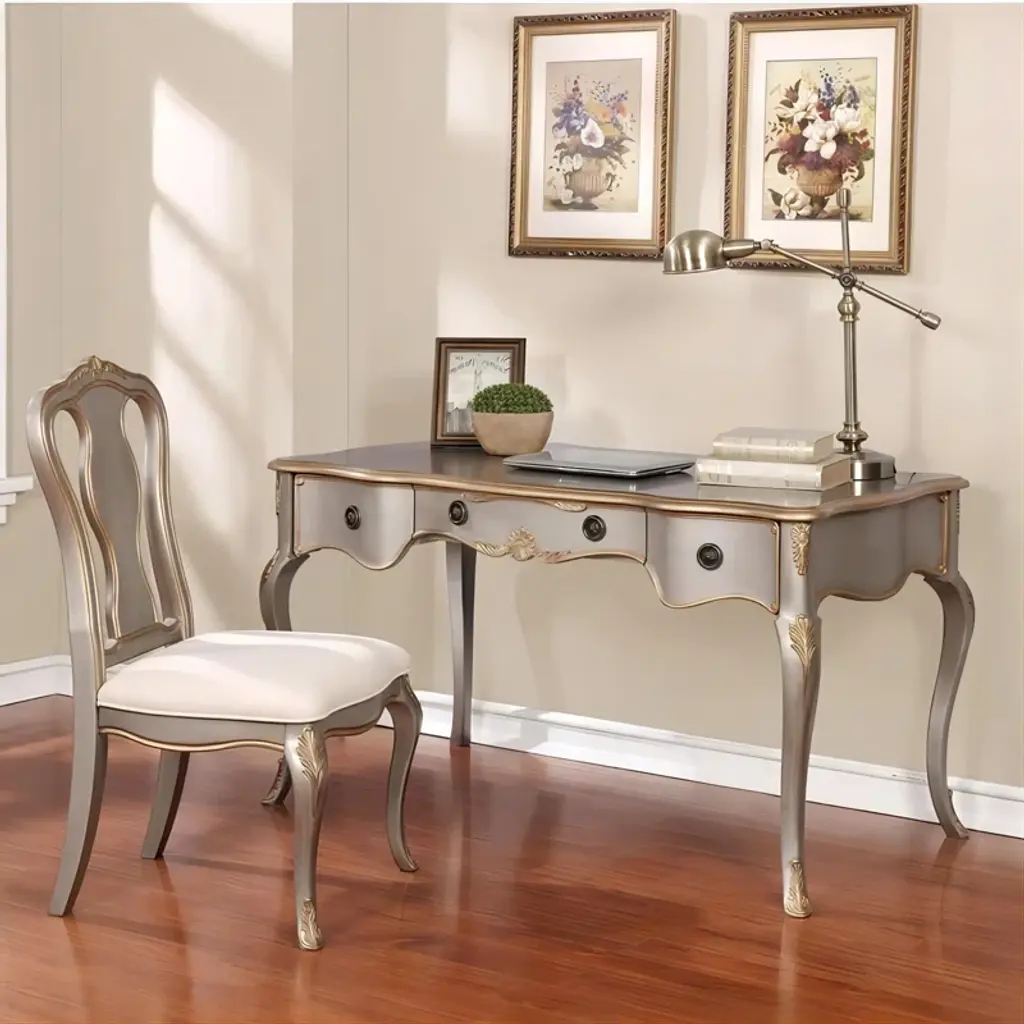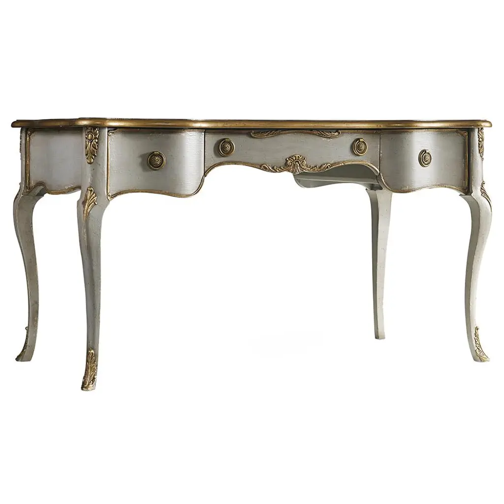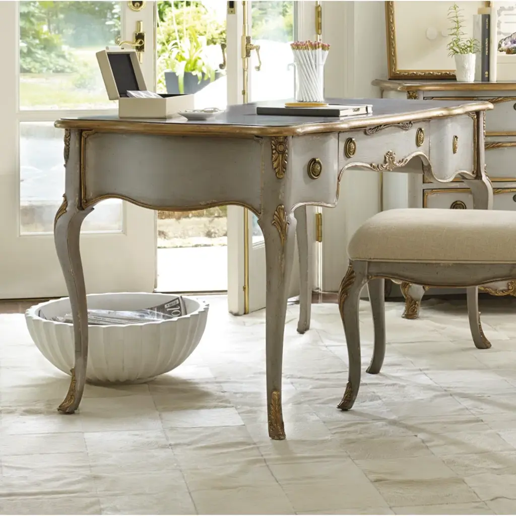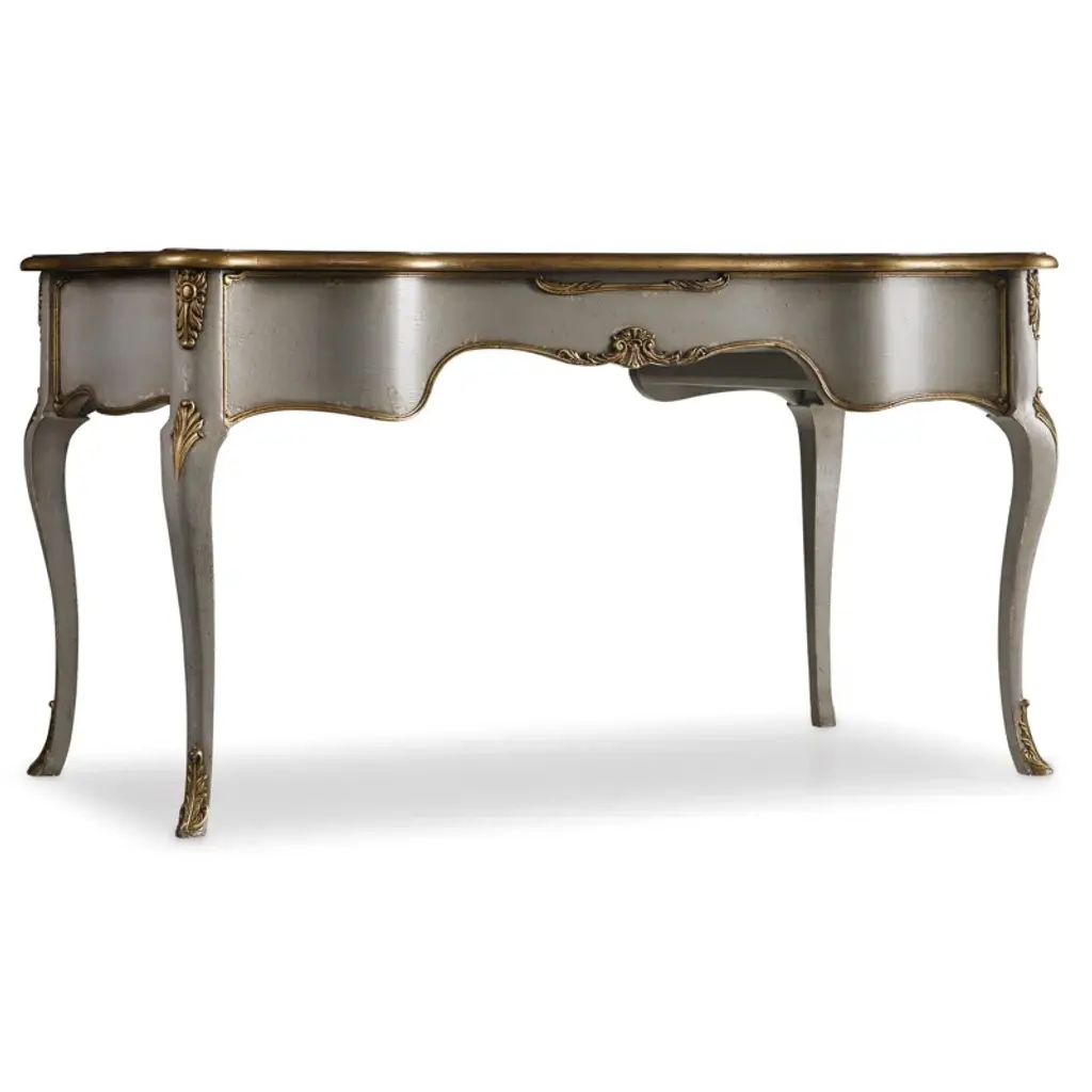 French-style lovers can create a romantic work-from-home solution with this exquisite desk in a soft gray finish with gold accents, a shapely apron and cabriole legs, and gold medallion hardware. In an efficient 54-inch width, the desk features a center drawer with a drop-front for keyboard use, 2 utility drawers with one removable writing insert, and a pencil tray with a felt bottom for use in either drawer and 2 removable dividers in each drawer. Crafted using hardwood solids this magnificent desk features a center drawer with a drop-front for keyboard use and two utility drawers with one removable writing insert and a pencil tray with felt bottom for use in either drawer, two removable dividers in each drawer.