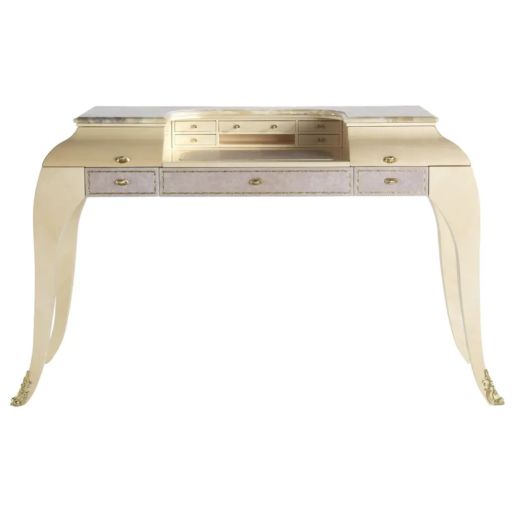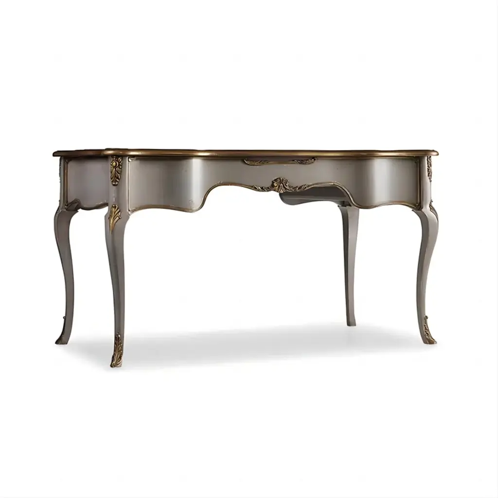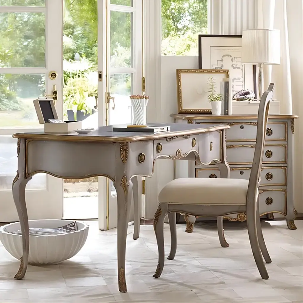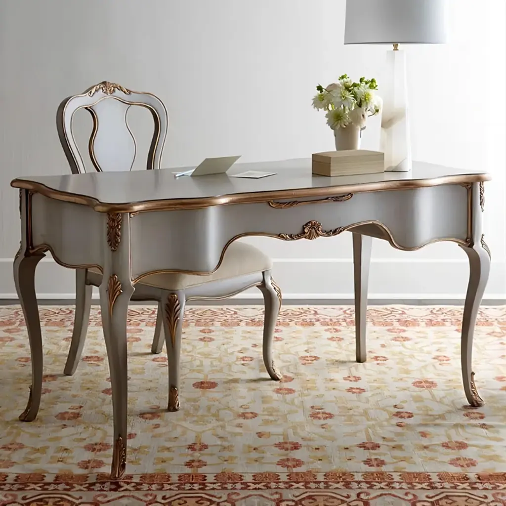French-style lovers can create a romantic work-from-home solution with this exquisite desk in a soft gray finish with gold accents, a shapely apron and cabriole legs, and gold medallion hardware. In an efficient 54-inch width, the desk features a center drawer with a drop-front for keyboard use, 2 utility drawers with one removable writing insert, and a pencil tray with a felt bottom for use in either drawer and 2 removable dividers in each drawer. Crafted using hardwood solids this magnificent desk features a center drawer with a drop-front for keyboard use and two utility drawers with one removable writing insert and a pencil tray with felt bottom for use in either drawer, two removable dividers in each drawer.